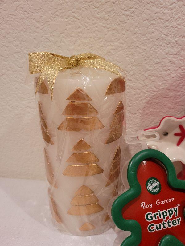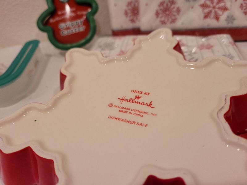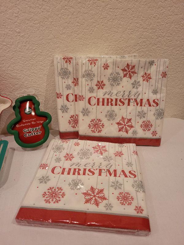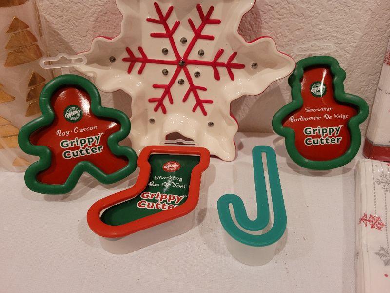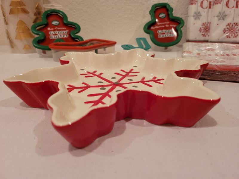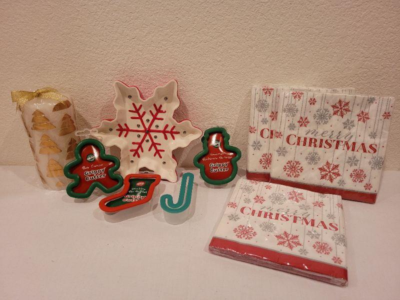 Lot 83: Assorted Baking NEW Christmas Dough Cutters, Napkins and Snowflake Dish