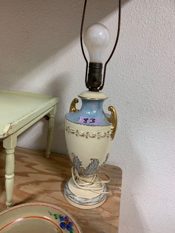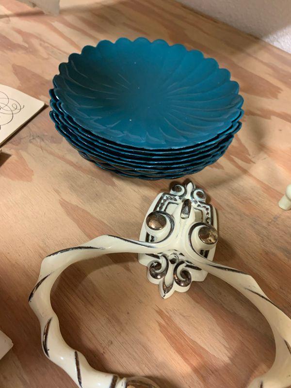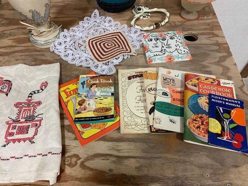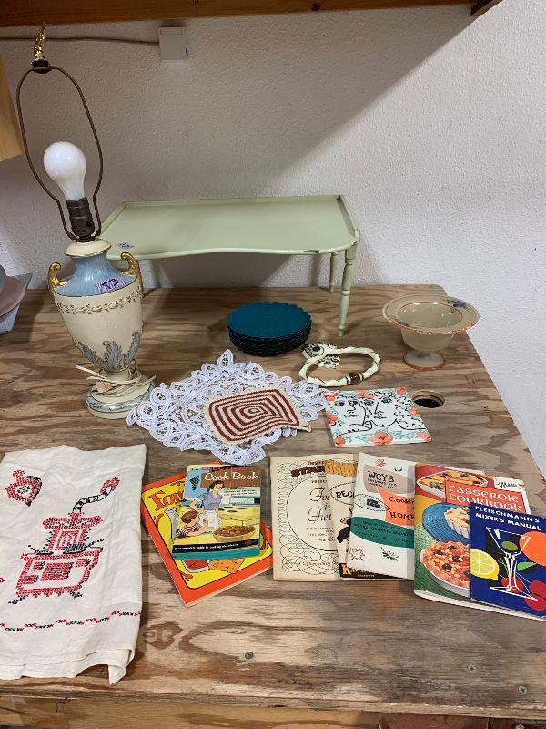 Green Serving Tray, plates, lamp no shade, bowl, towel holder, misc. small linens, cookbook, tile trivet