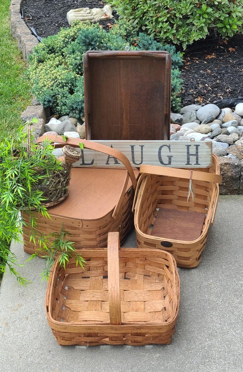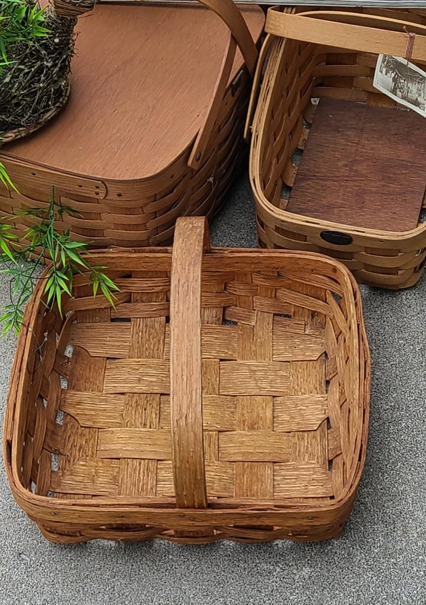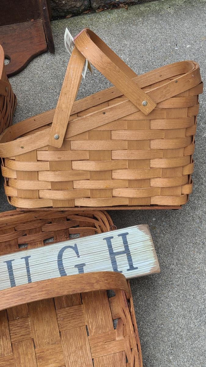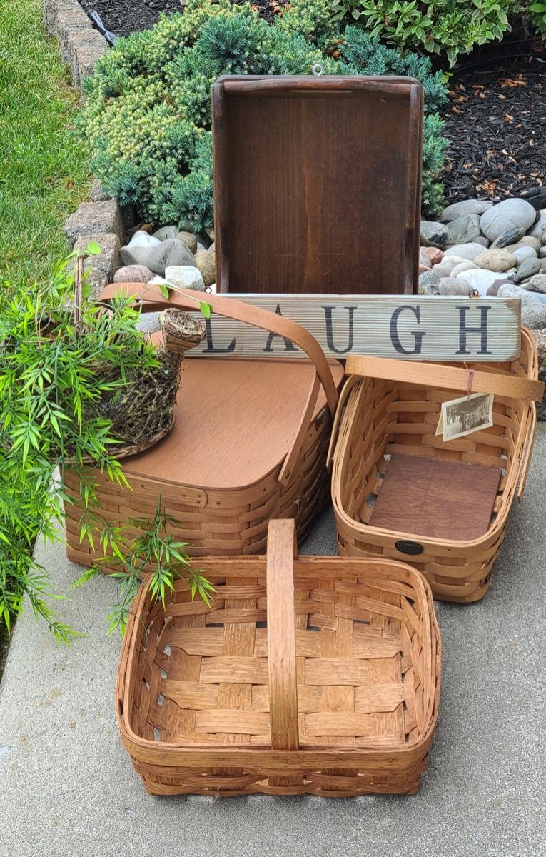 This is a vintage lot of baskets, and they do show some wear. Most have the owners name on as she loved to use them for pies etc. Great for use or home decor. Also a small faux plant decor that is shaped like a watering can that lights up with batteries. May need new light strand, untested. Wood Tray table perfect for a table centerpiece! Please see all pictures for content of the lot, condition of the lot, and measurements if taken. Pictures are the best representation of the items listed and items are untested unless indicated in description. Thank you for looking and have fun bidding!