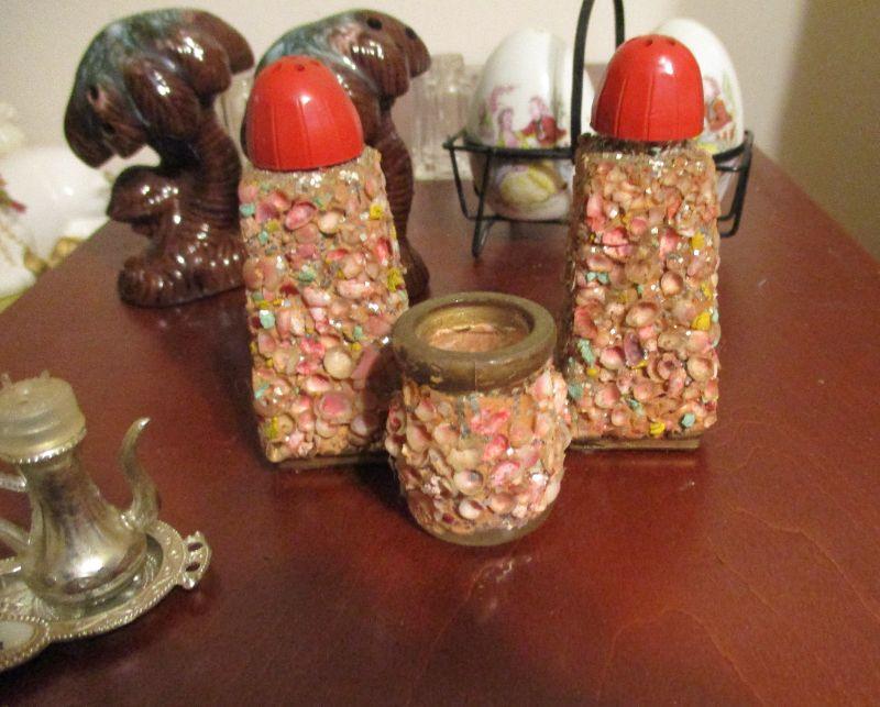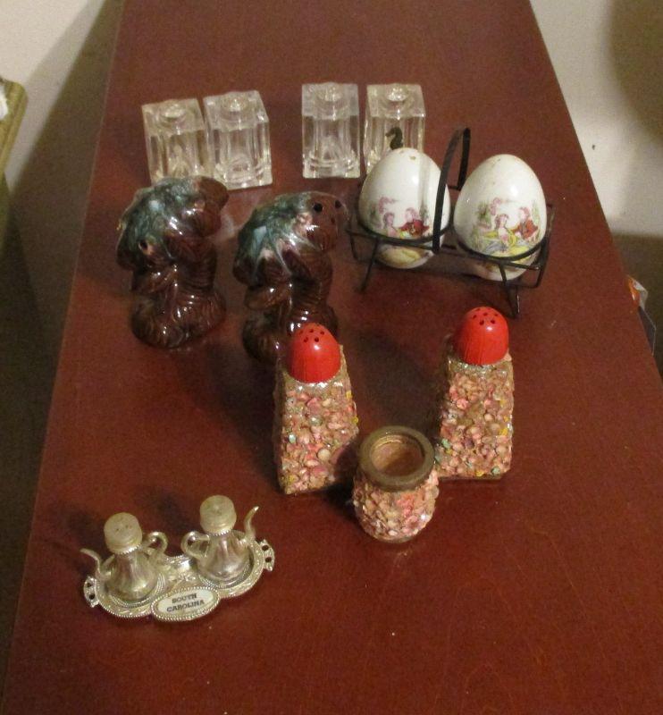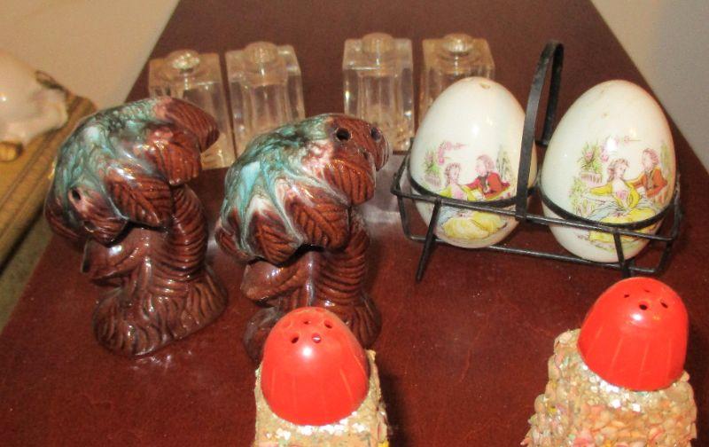 The clear ones in the way back are lucite and one is missing it's sea horse. The three piece set in the front middle is glass with a rock like texture on it (salt, pepper, toothpick). The palm trees and the eggs (they have a Victorian Era courting couple on each) all have their stoppers.