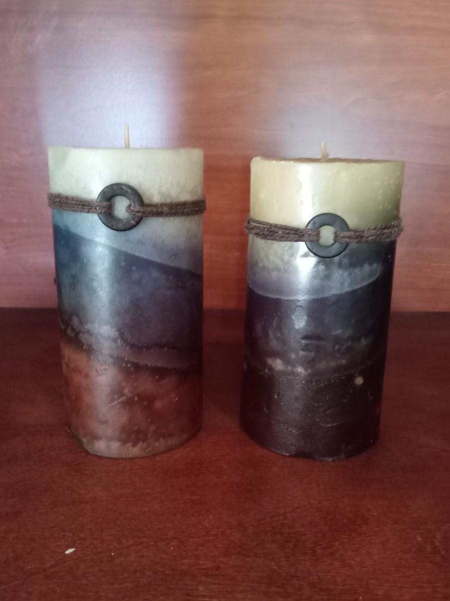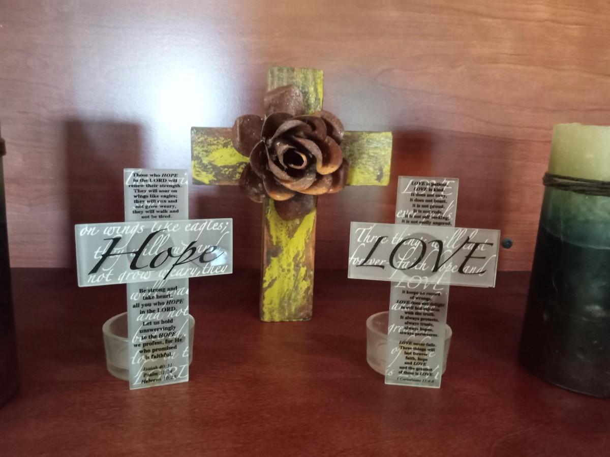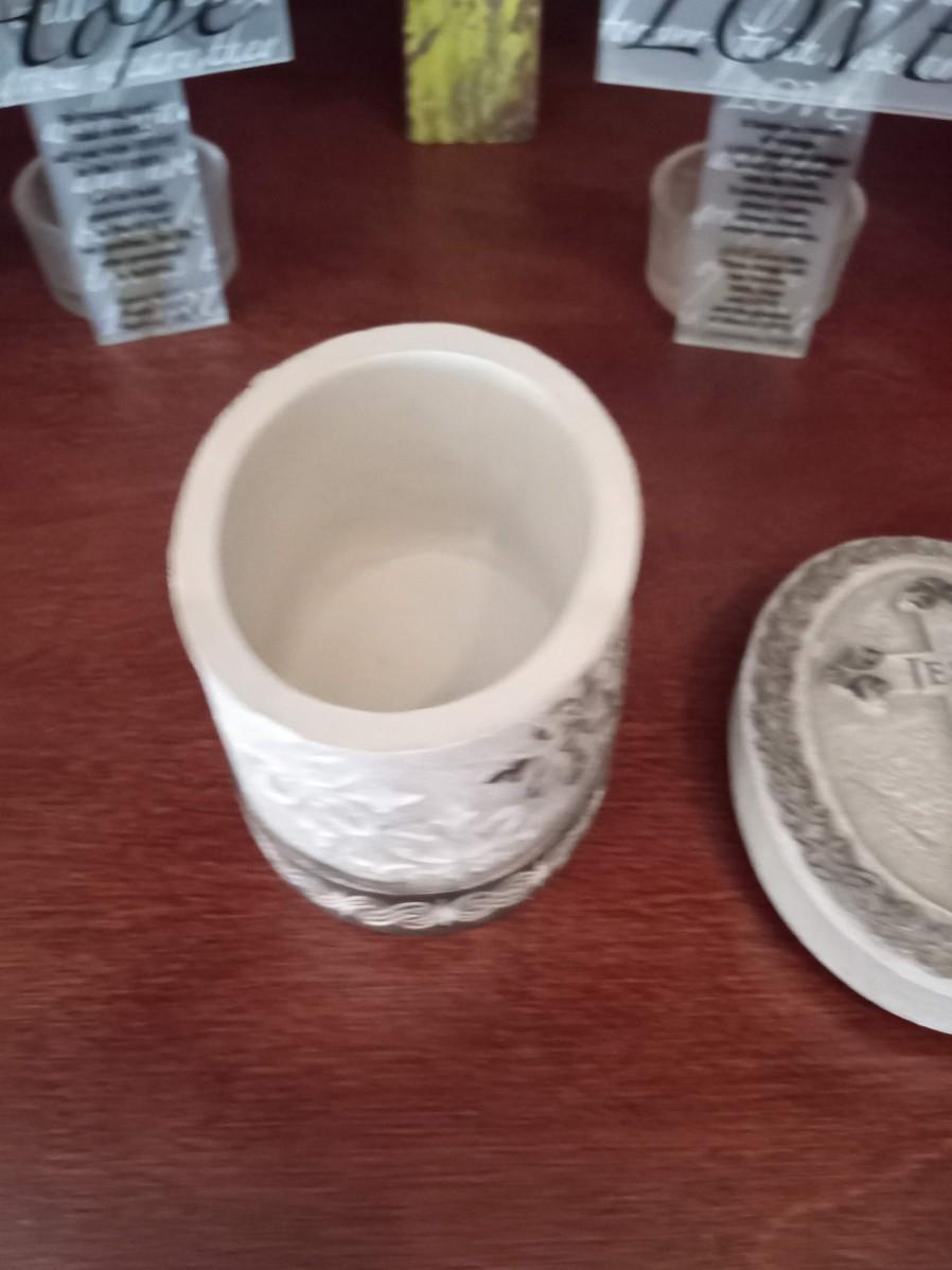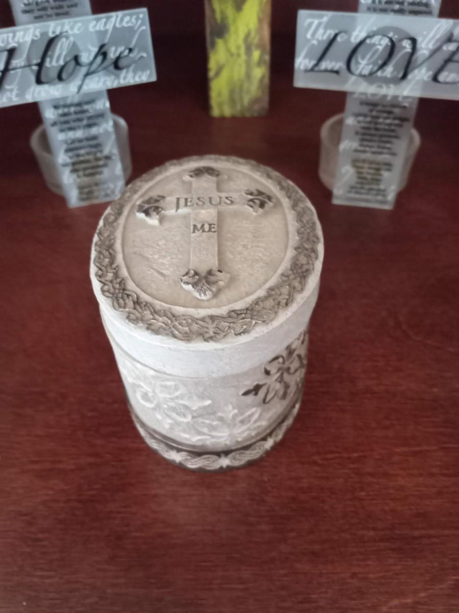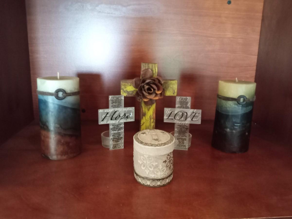 2 CROSS CANDLE HOLDERS, 2 PILLAR CANDLES, RESIN TRINKET BOX