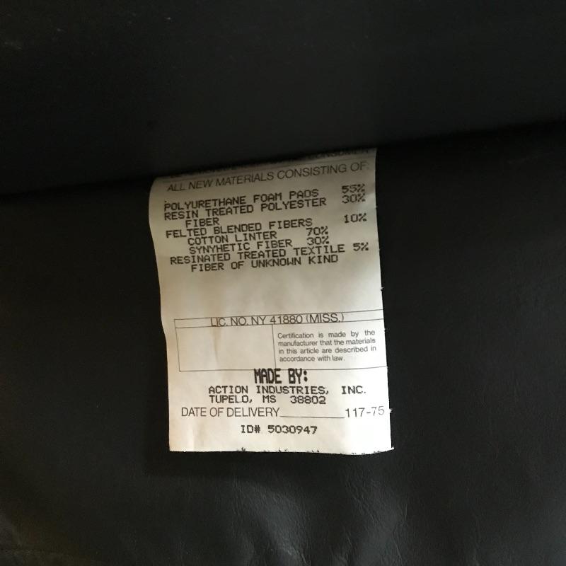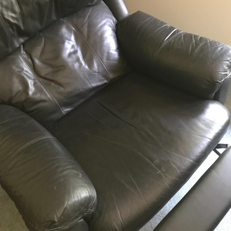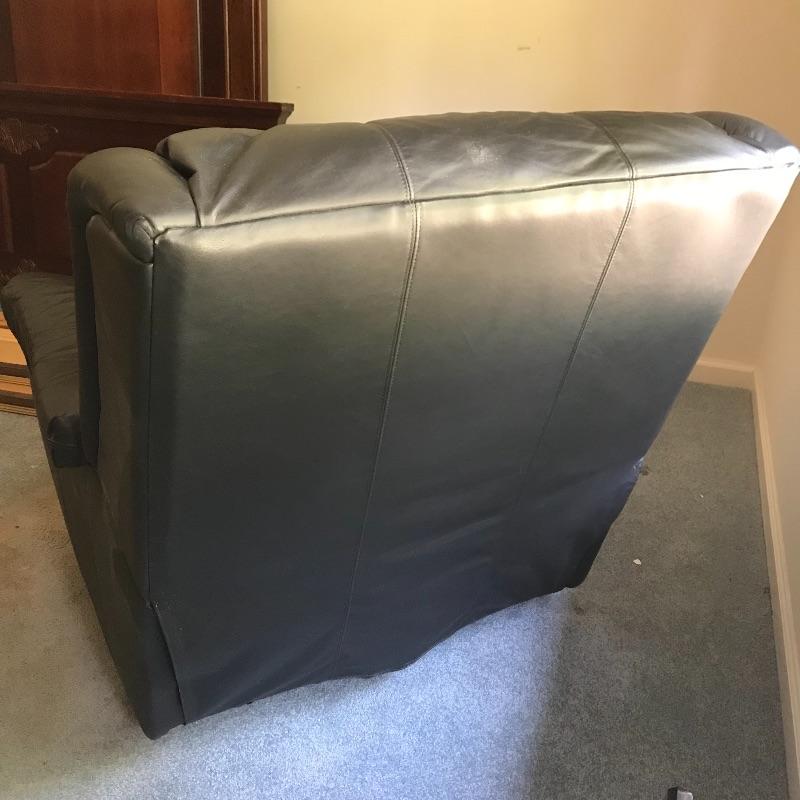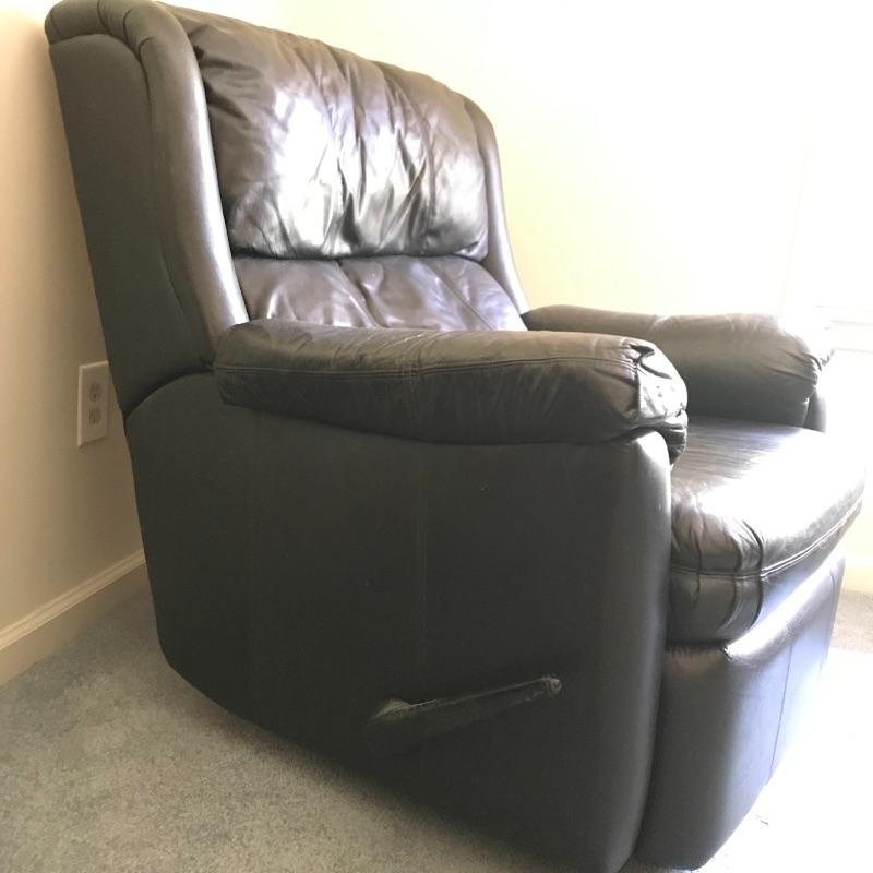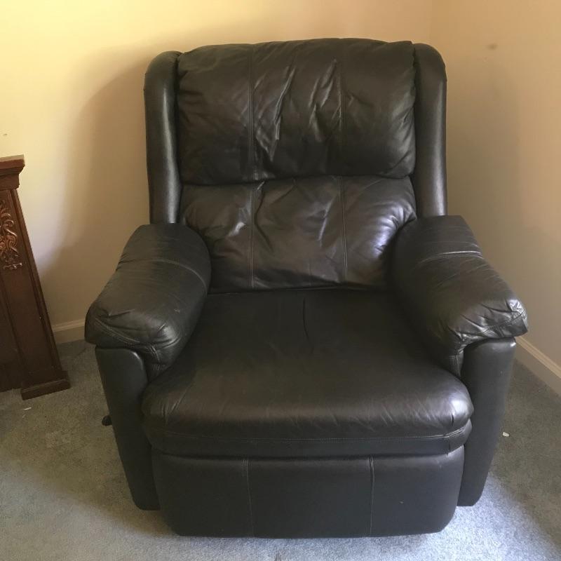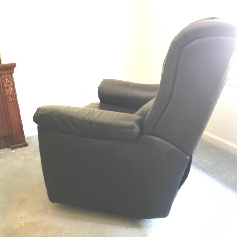 Nice and comfortable black leather recliner by Action Industries. Piece has a leather covered lever to lift footrest and moves smoothly. Piece shows a little wear and measures 34” x 29” x 36”. Local Pickup Only. Please bring help to load.