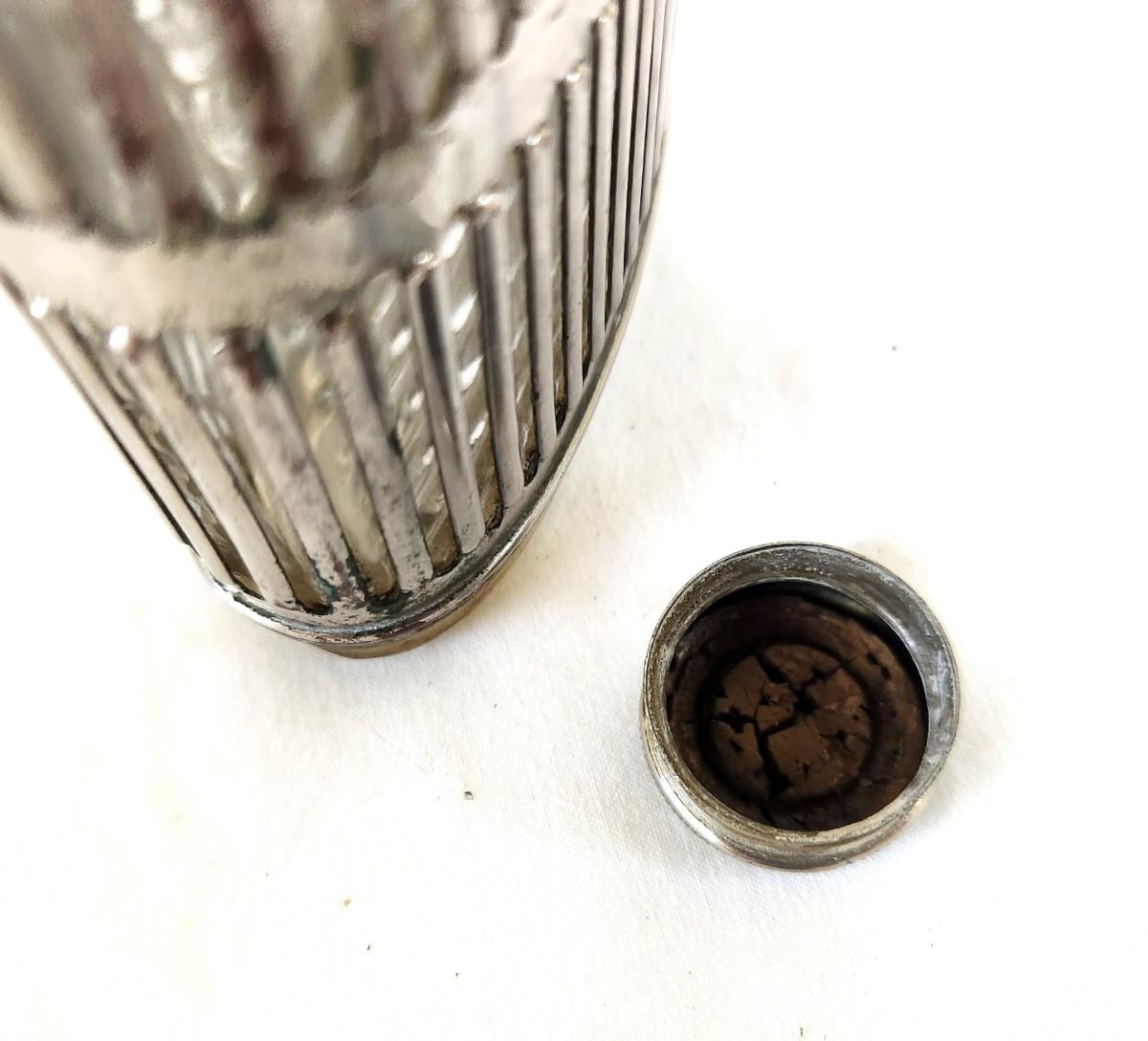 Totally cool antique (Prohibition era) Chrome Cage flask - Made by "Universal" in Feb 1927. Cork stopper - chip to glass lip - not for use, but a great display piece. 1/2 pint size. 5.5" tall.