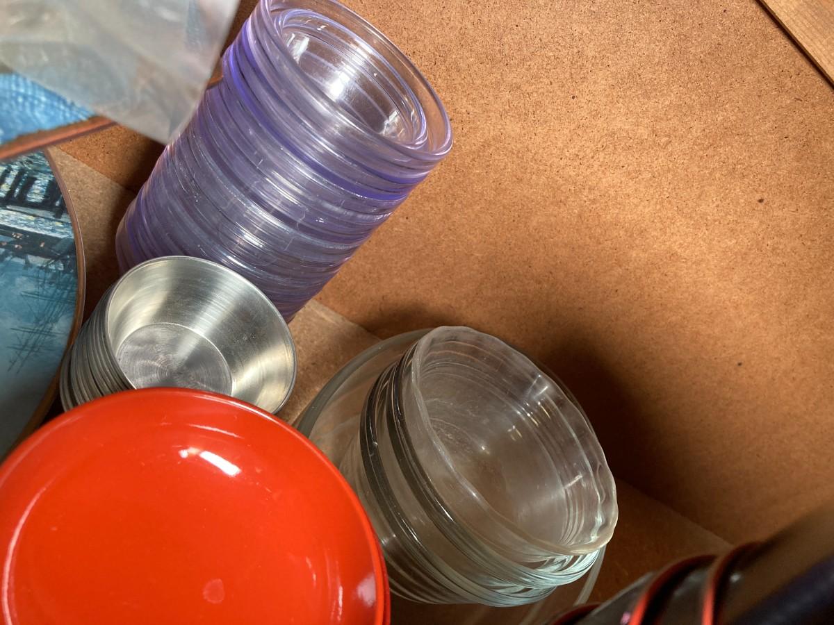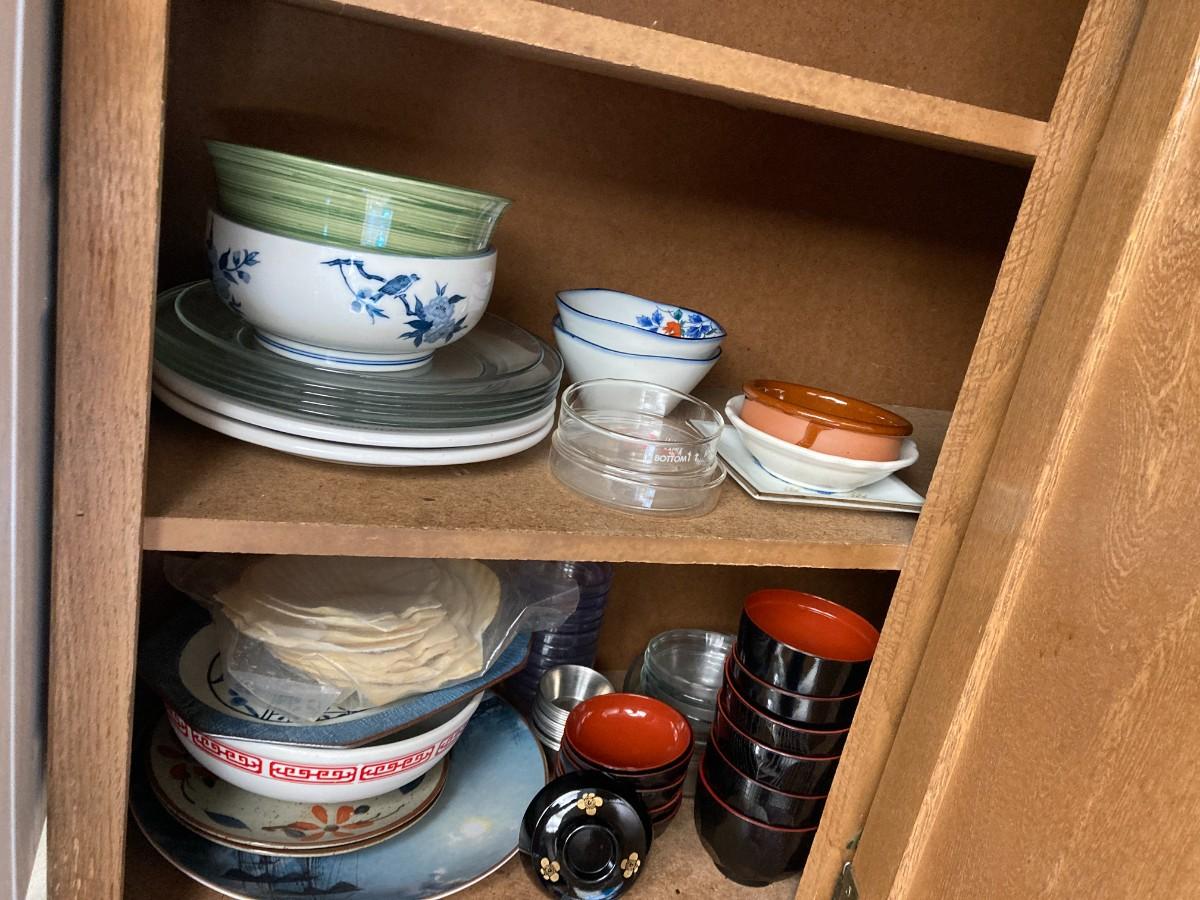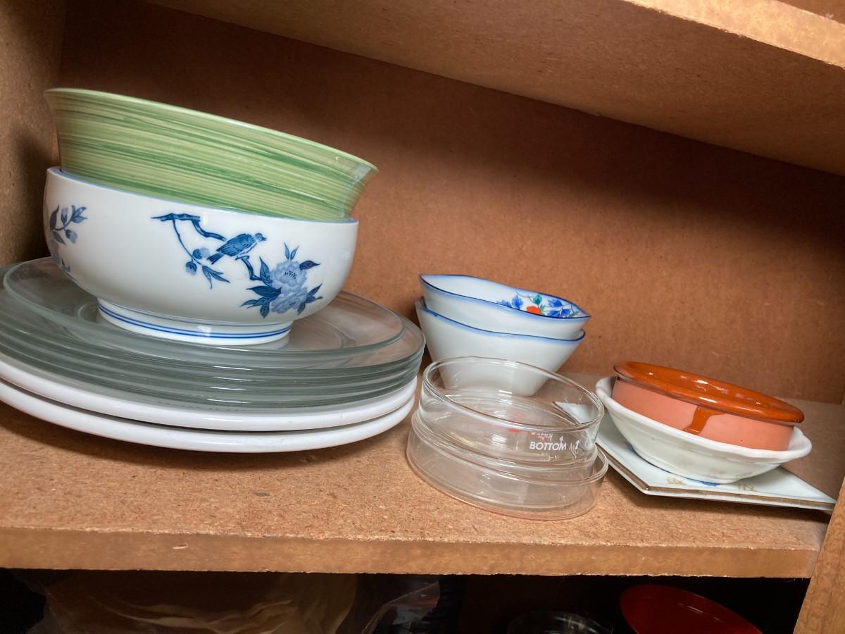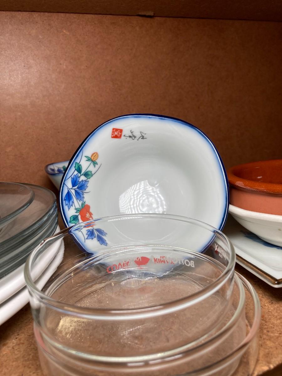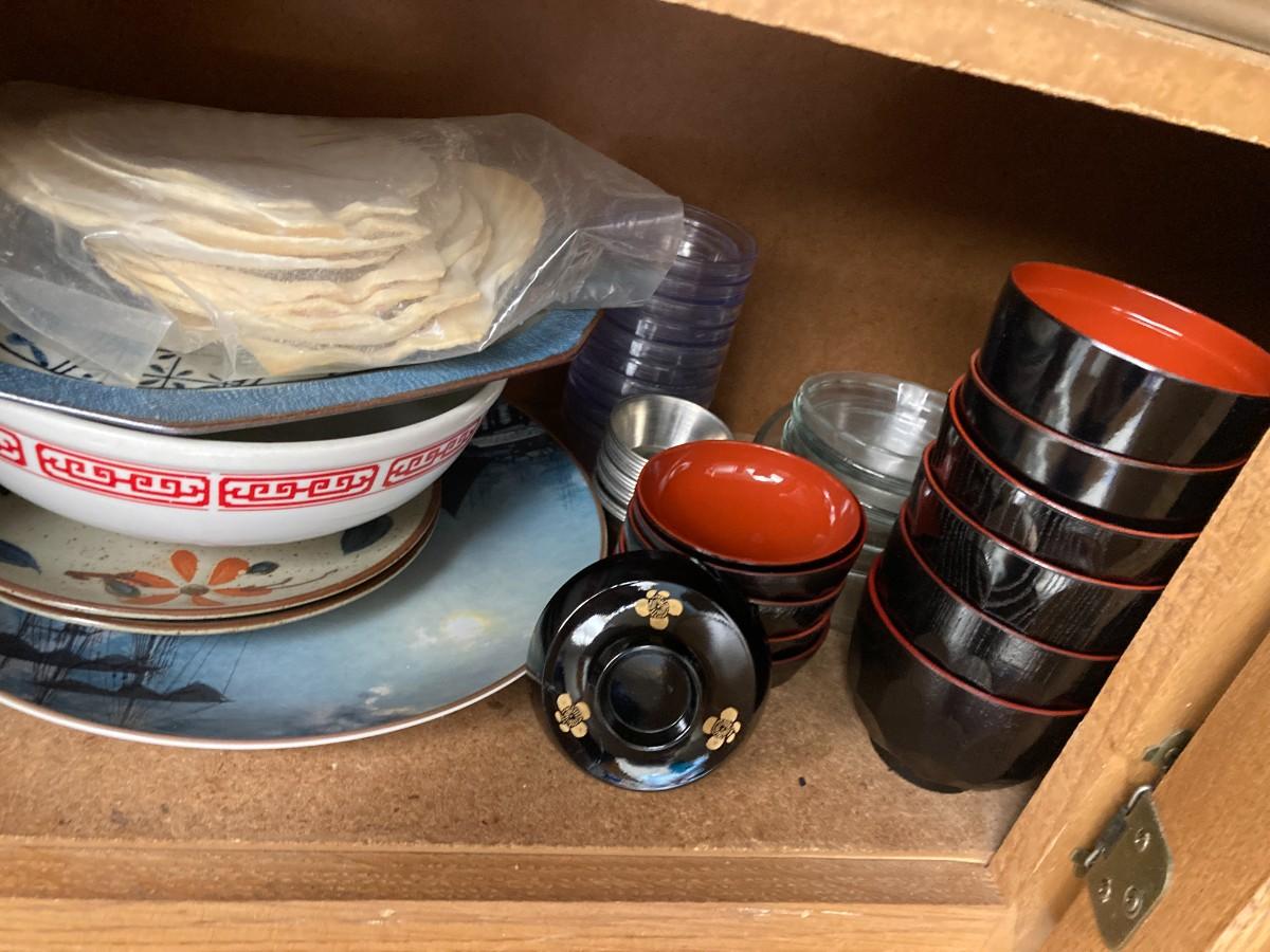 Set of lacquered soup bowls. Assorted porcelain and glass bowls. Includes set of shell servers.