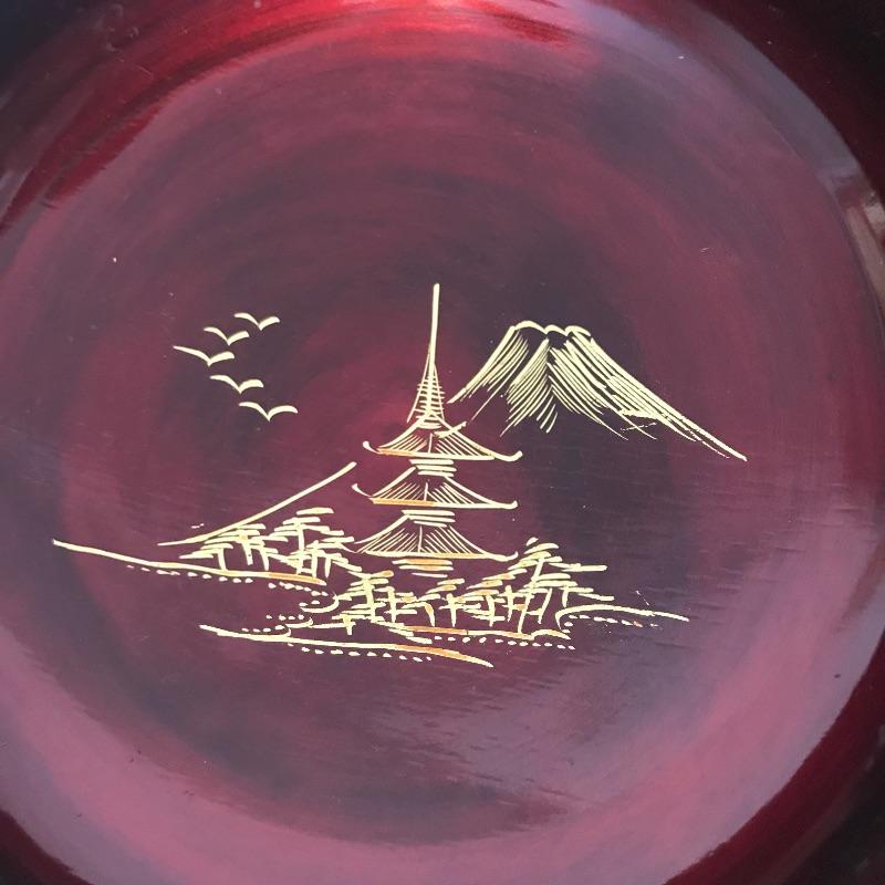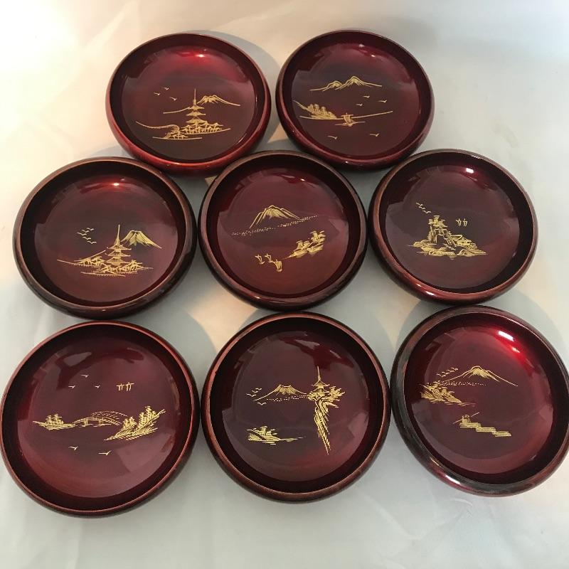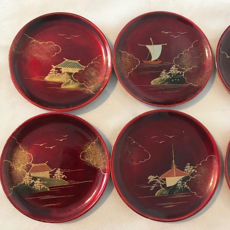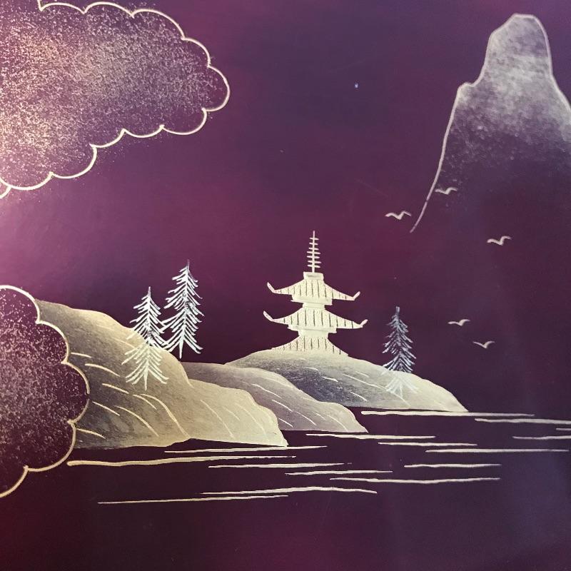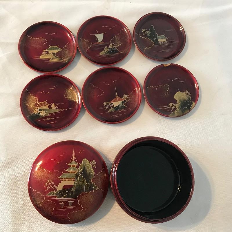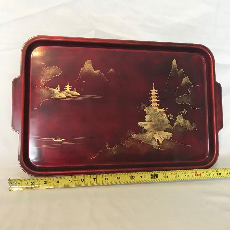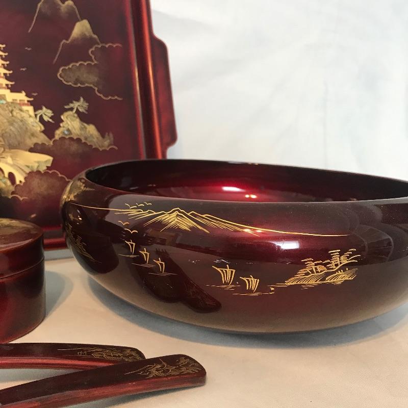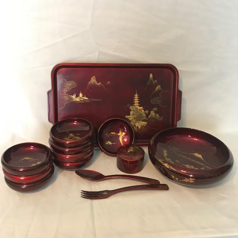 Beautiful deep red serving set with Japanese style art on every piece. All pieces appear to be hand painted lightweight material. The tray is stunning, with gold decor throughout and thicker golden painted waves with what appears to be abalone shell sprinkled in the water. The tray has a blurry marking on its backside stating it’s plastic. The other pieces are possibly a lightweight wood/bamboo or a quality man made material. Lot includes eight bowls with a large serving bowl and two serving utensils. The bowl is approximately 11.25”d x 3.75”. Last, but certainly not least is a boxed set of six painted wood 3”d plates or coasters. The set is very similar to the other items, but showcases more color in the waterscapes. One plate is chipped showing its wooden material. See photos. Shipping available.