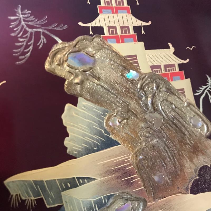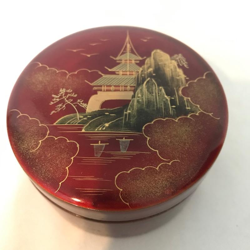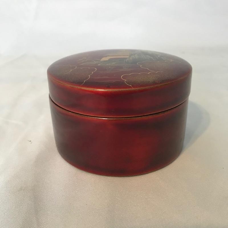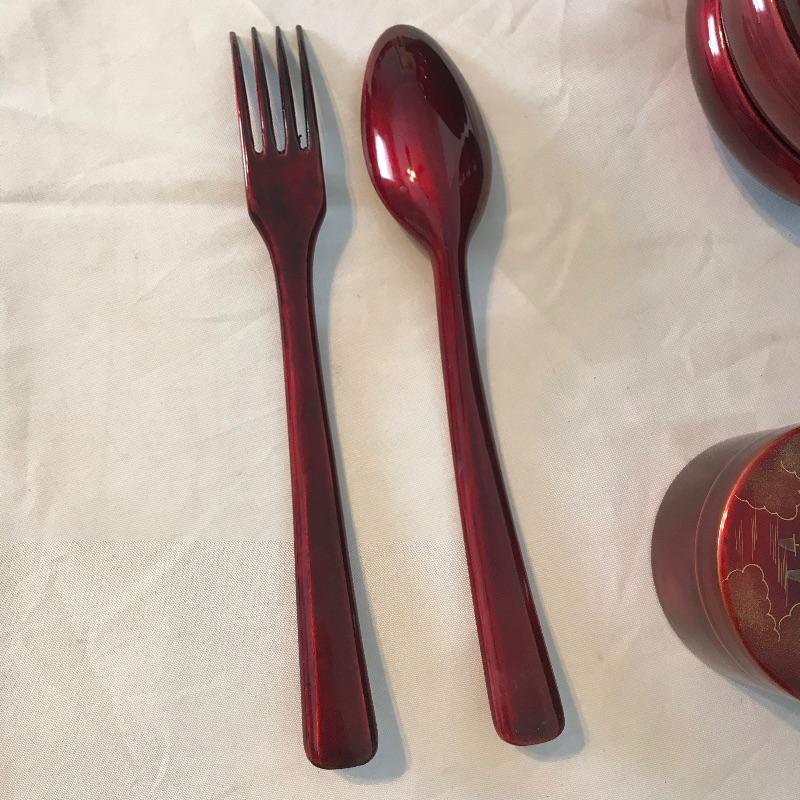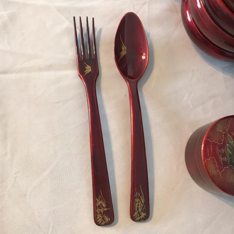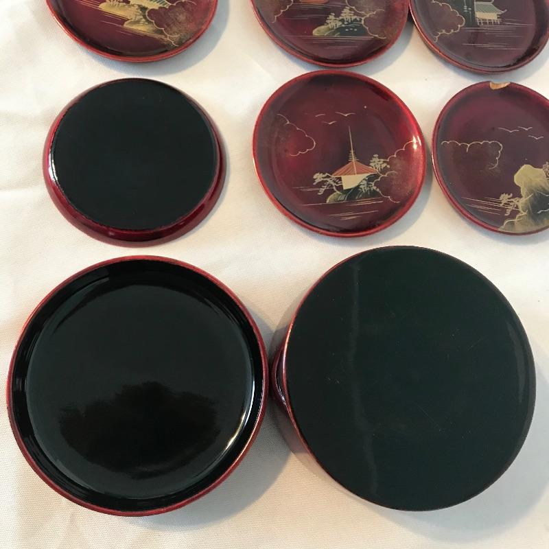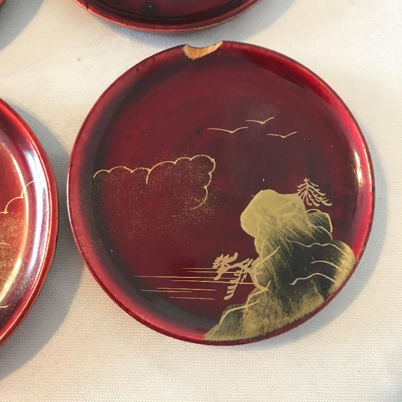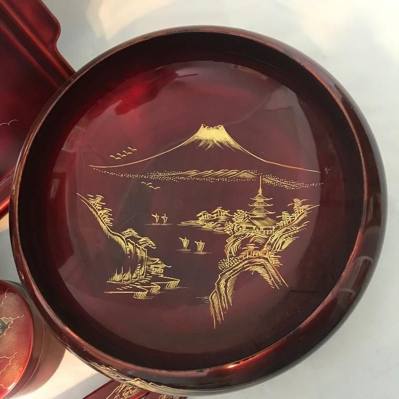 Beautiful deep red serving set with Japanese style art on every piece. All pieces appear to be hand painted lightweight material. The tray is stunning, with gold decor throughout and thicker golden painted waves with what appears to be abalone shell sprinkled in the water. The tray has a blurry marking on its backside stating it’s plastic. The other pieces are possibly a lightweight wood/bamboo or a quality man made material. Lot includes eight bowls with a large serving bowl and two serving utensils. The bowl is approximately 11.25”d x 3.75”. Last, but certainly not least is a boxed set of six painted wood 3”d plates or coasters. The set is very similar to the other items, but showcases more color in the waterscapes. One plate is chipped showing its wooden material. See photos. Shipping available.