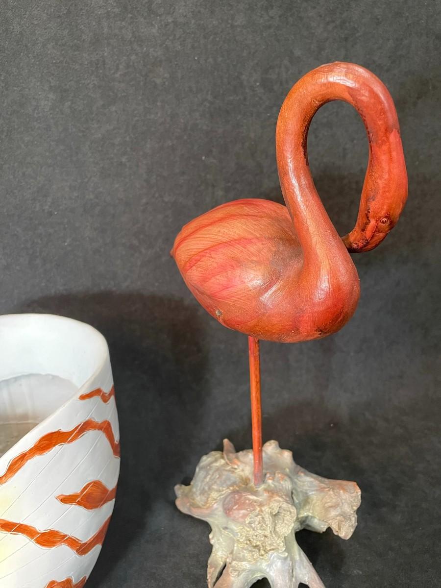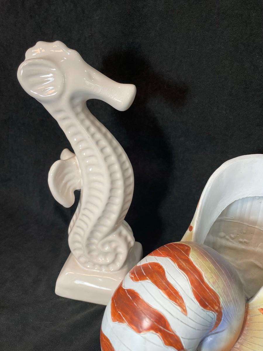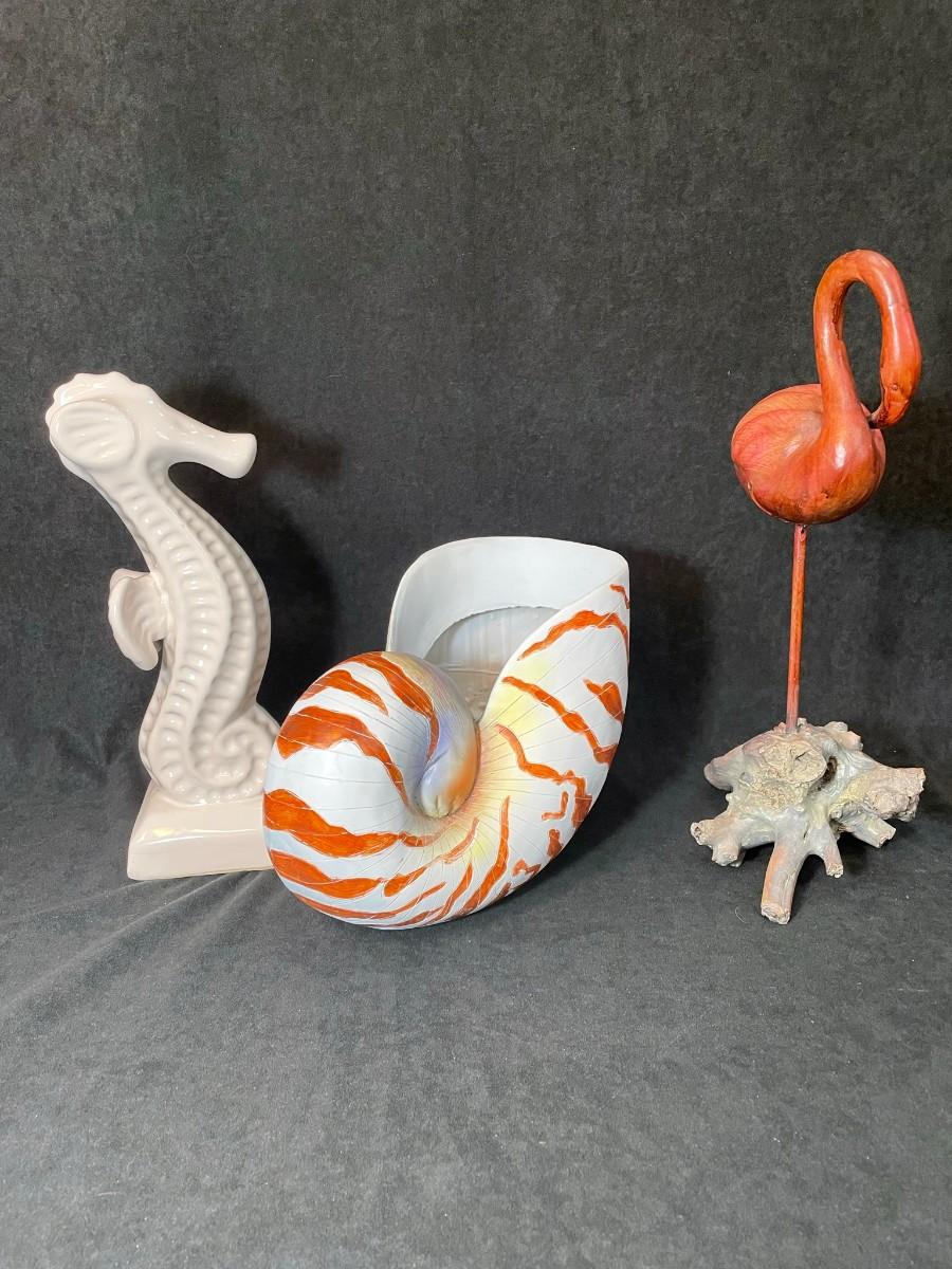 Three pieces included: Ceramic shell, seahorse figurine, and flamingo