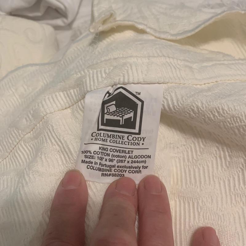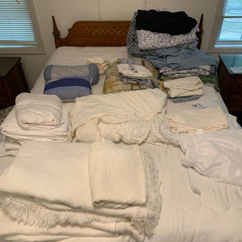 This predominately white and blue colored bed linens consists of several king coverlets, a couple queen coverlets, duvet covers, fitted and flat sheets as well as plush blankets and bed skirts. Two small accent pillows and much more. Local pick up only.