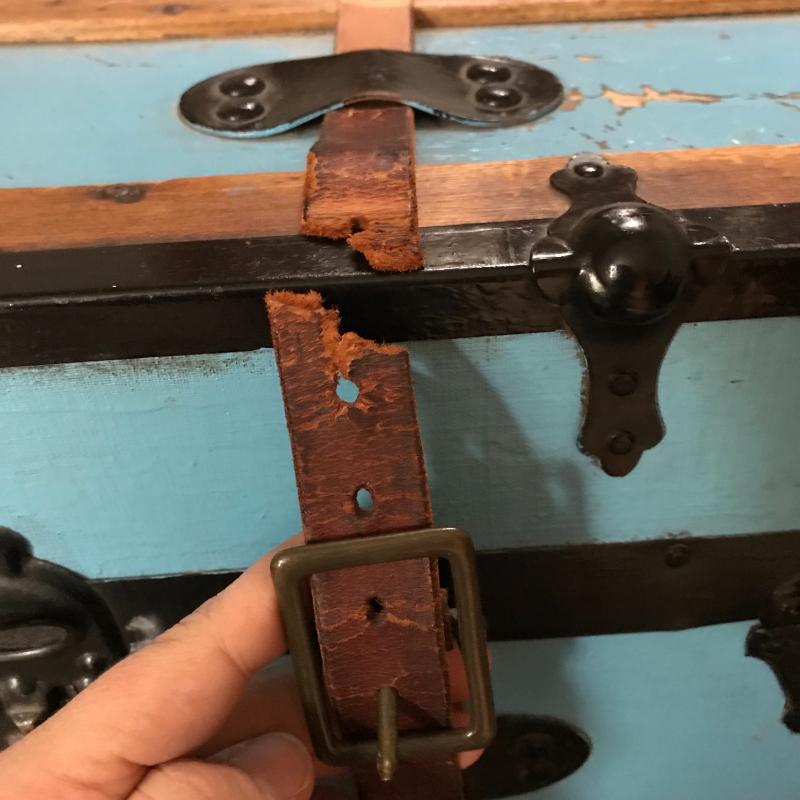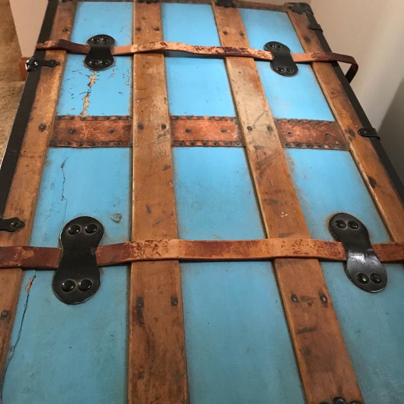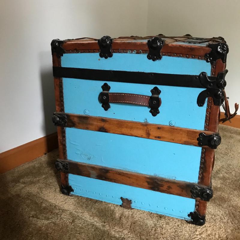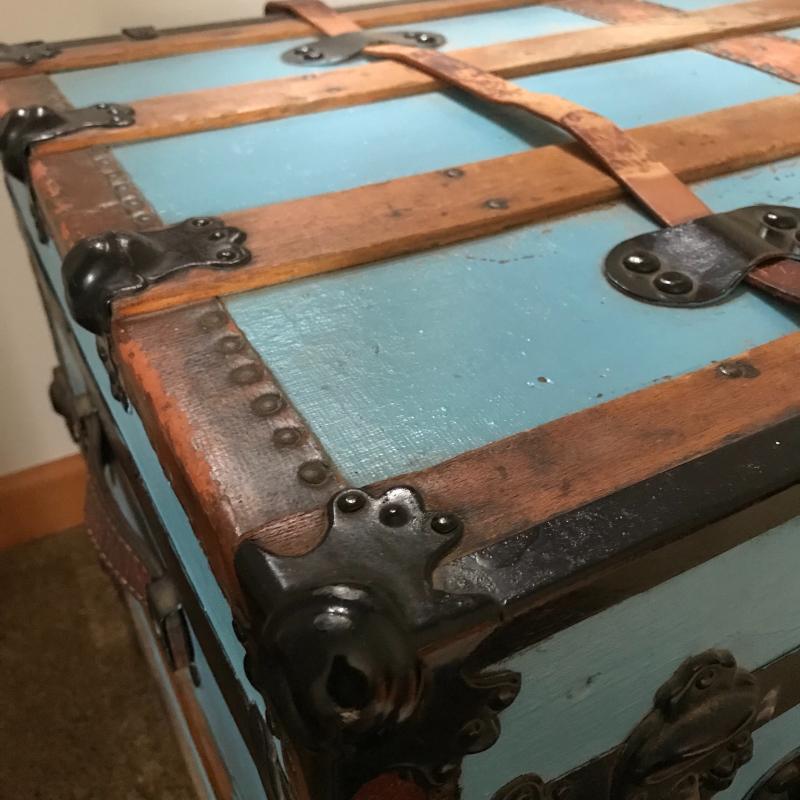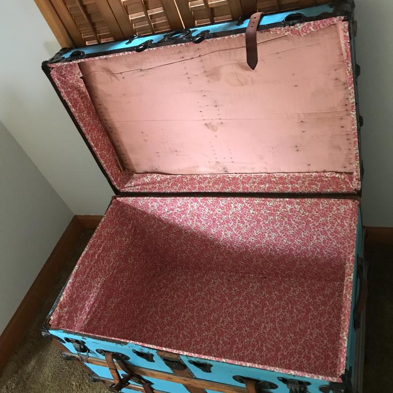 Unique vintage find! Baby blue trunk with wood and metal adornments and leather straps. Trunk measures 32.25” x 25” x 22”. Inside you’ll find pink flowered paper that appears to be easily removed. It doesn’t have a lock or key and one strap is broken, see photos. The leather handles on each side appear to be in great shape for its age! No shipping.