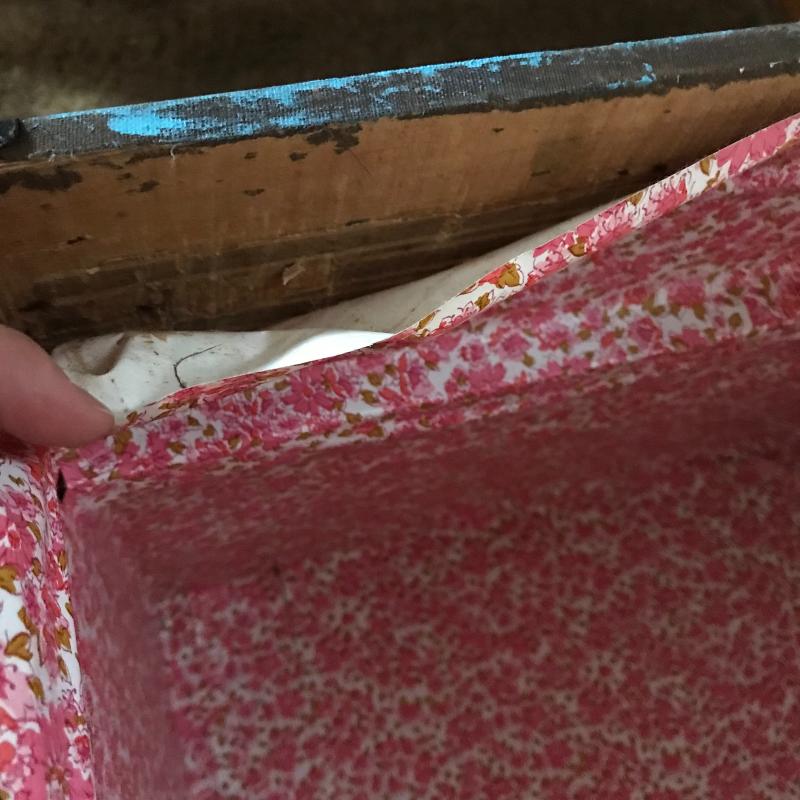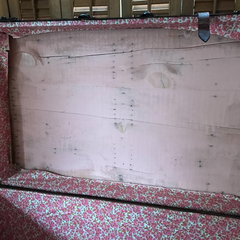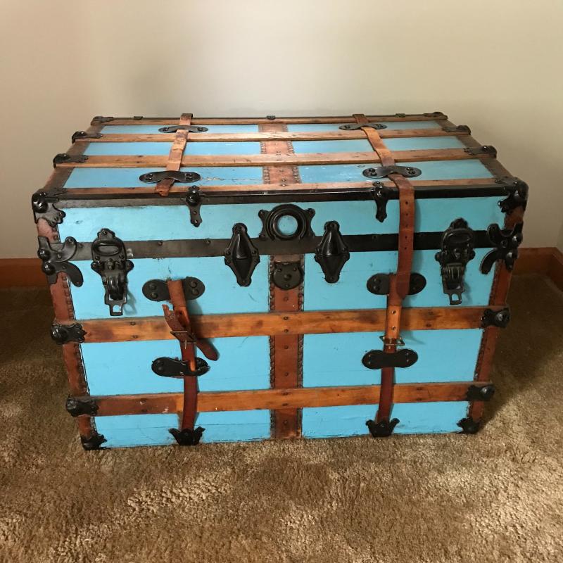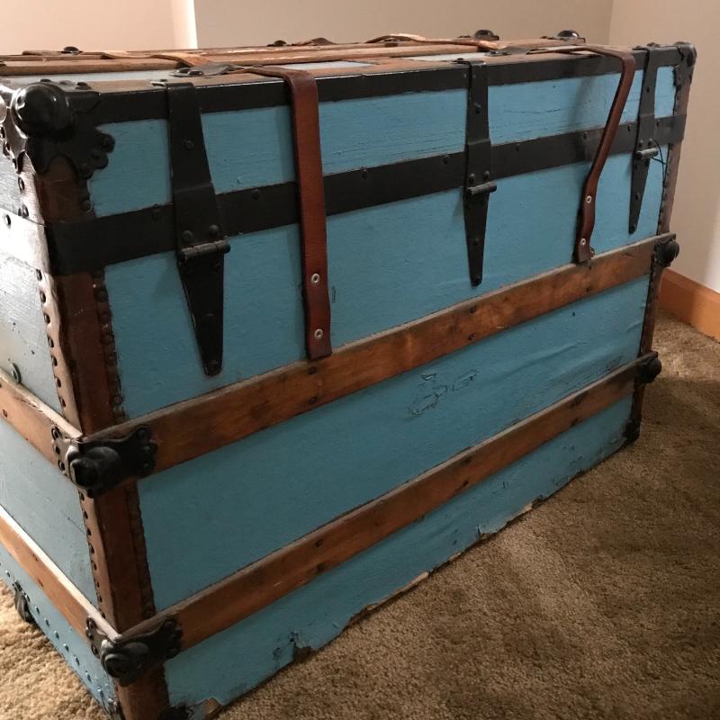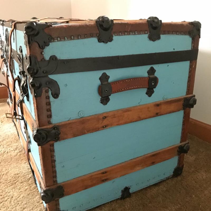 Unique vintage find! Baby blue trunk with wood and metal adornments and leather straps. Trunk measures 32.25” x 25” x 22”. Inside you’ll find pink flowered paper that appears to be easily removed. It doesn’t have a lock or key and one strap is broken, see photos. The leather handles on each side appear to be in great shape for its age! No shipping.
