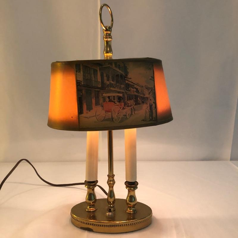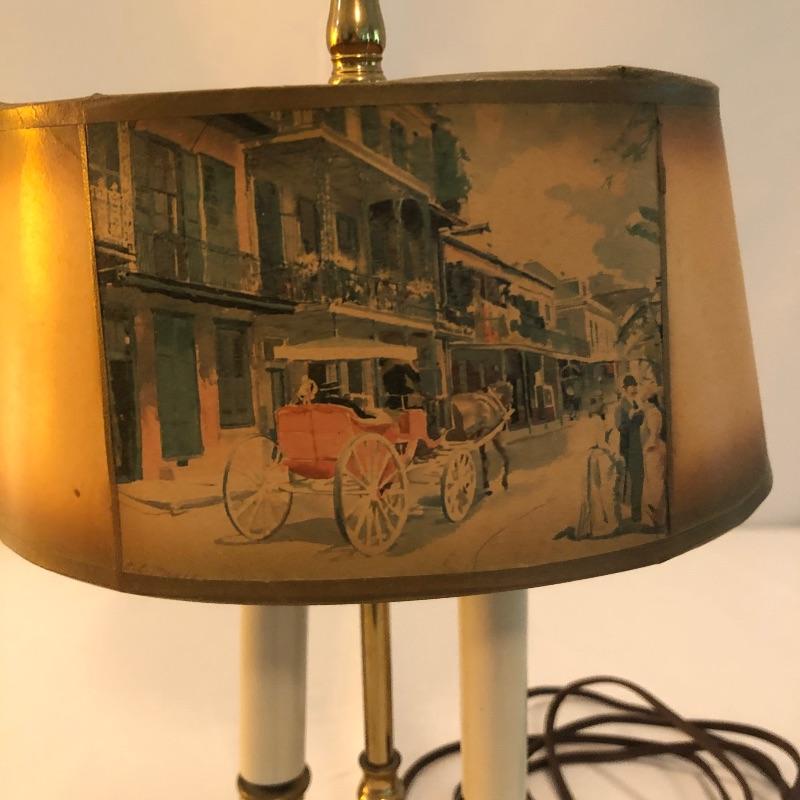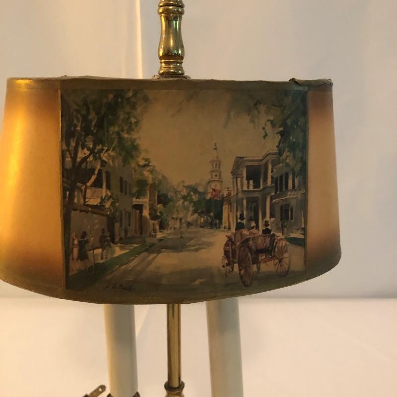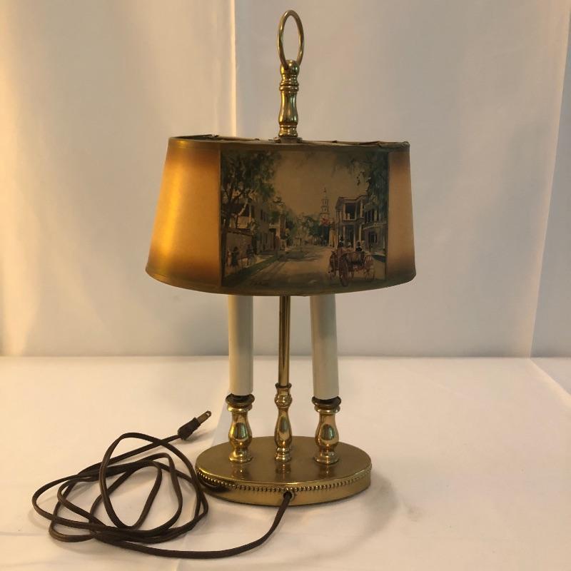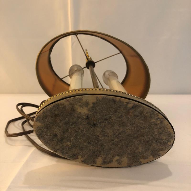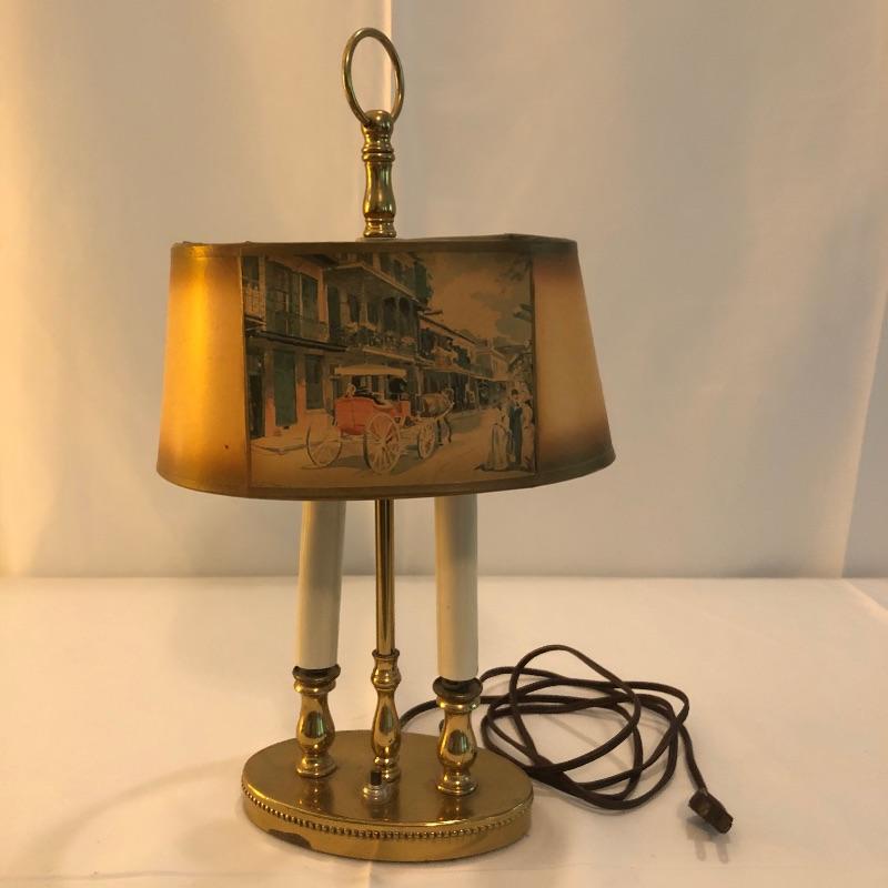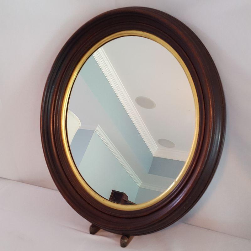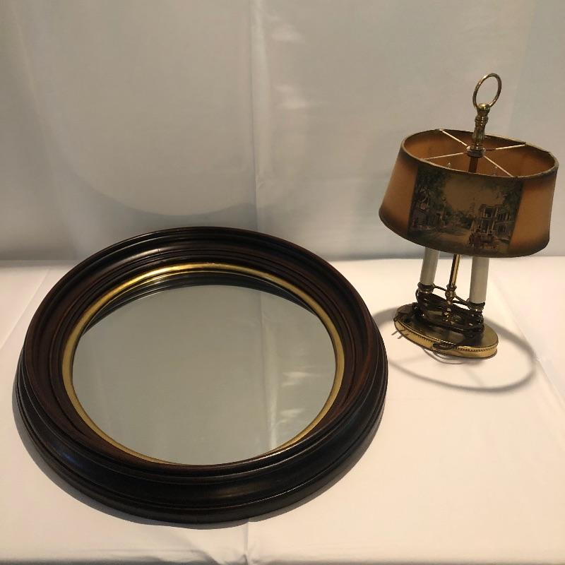 This lot includes a wood framed mirror with gold trim. The mirror measures 21"x23". This mirror would be great for an entry way or hallway. The brass based lamp is in working condition and will add charm to a side table. Both pieces are good condition.