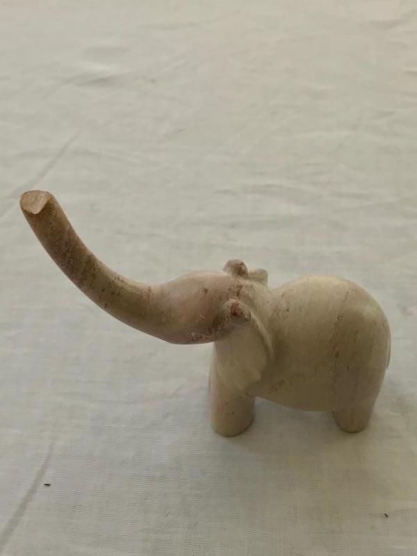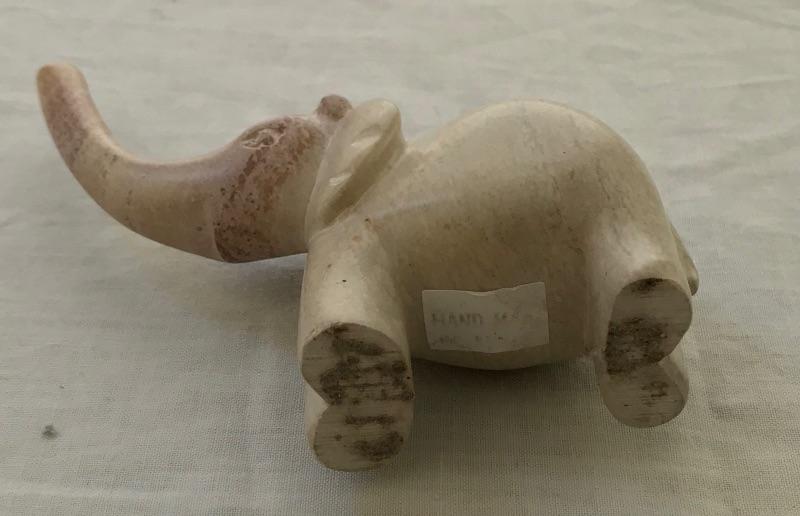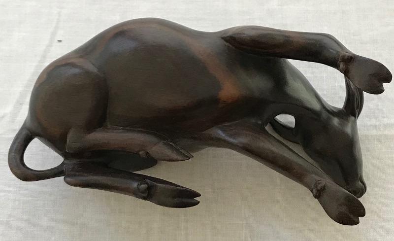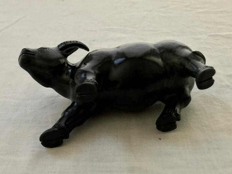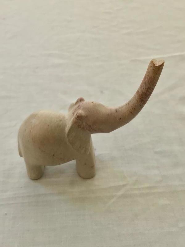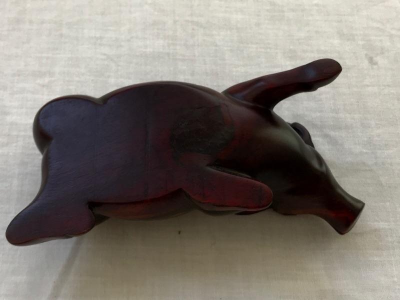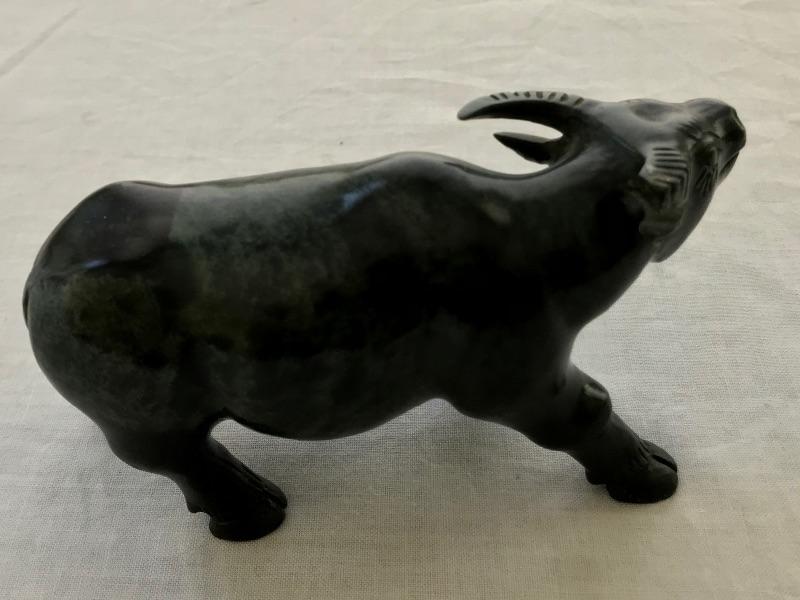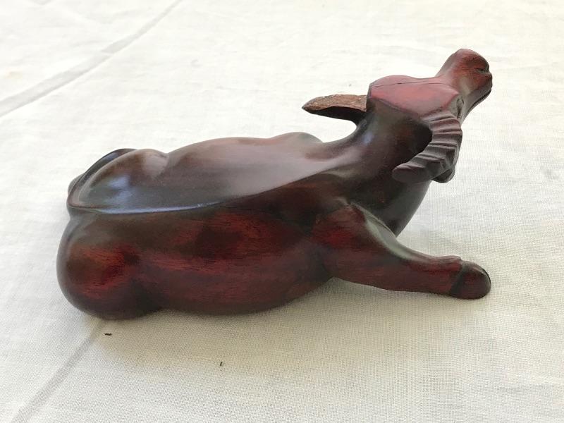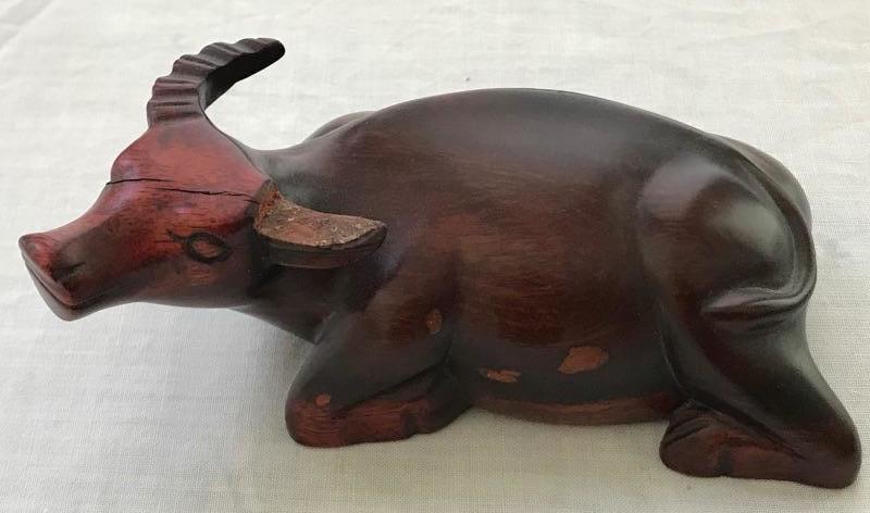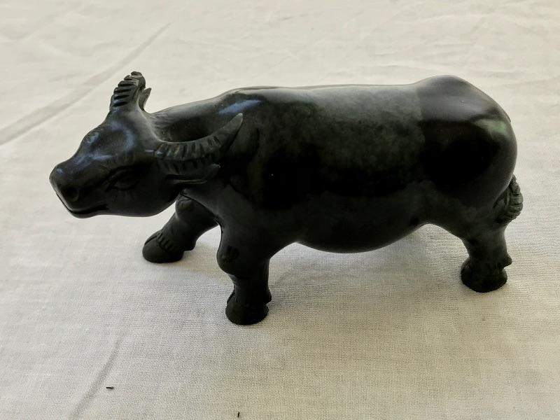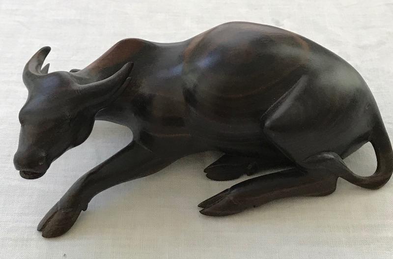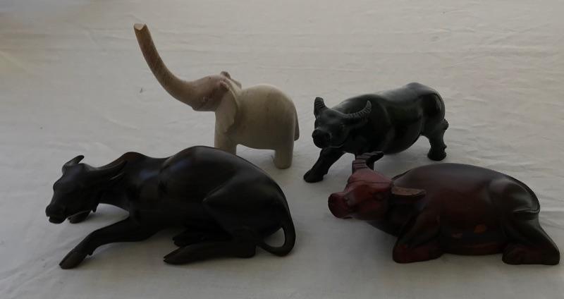 2 Carved Rosewood Burmese Cows , one has small piece of horn missing, carved stone Burmese Cow, has small piece of horn missing and a carved stone Elephant