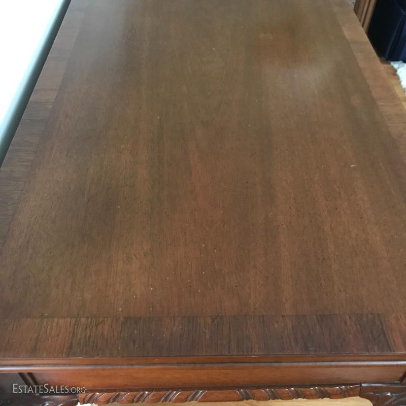Nice wooden writing desk with claw feet. Two Drawers. Nice details. Great condition. 40"l x 21"w x 29.5"h. No Shipping. Local pick up in Asheville, NC.