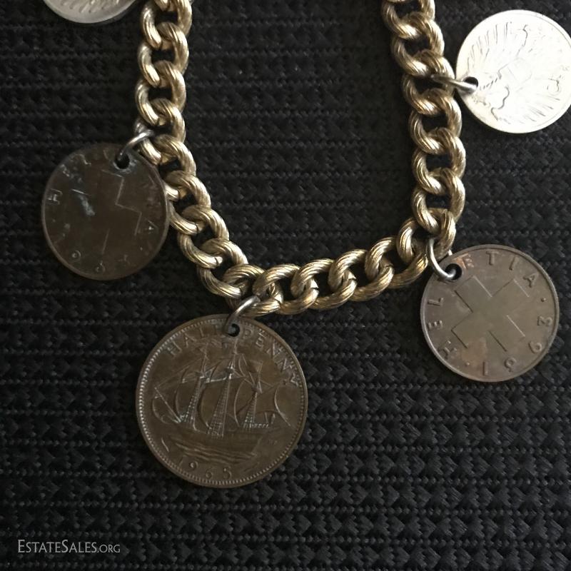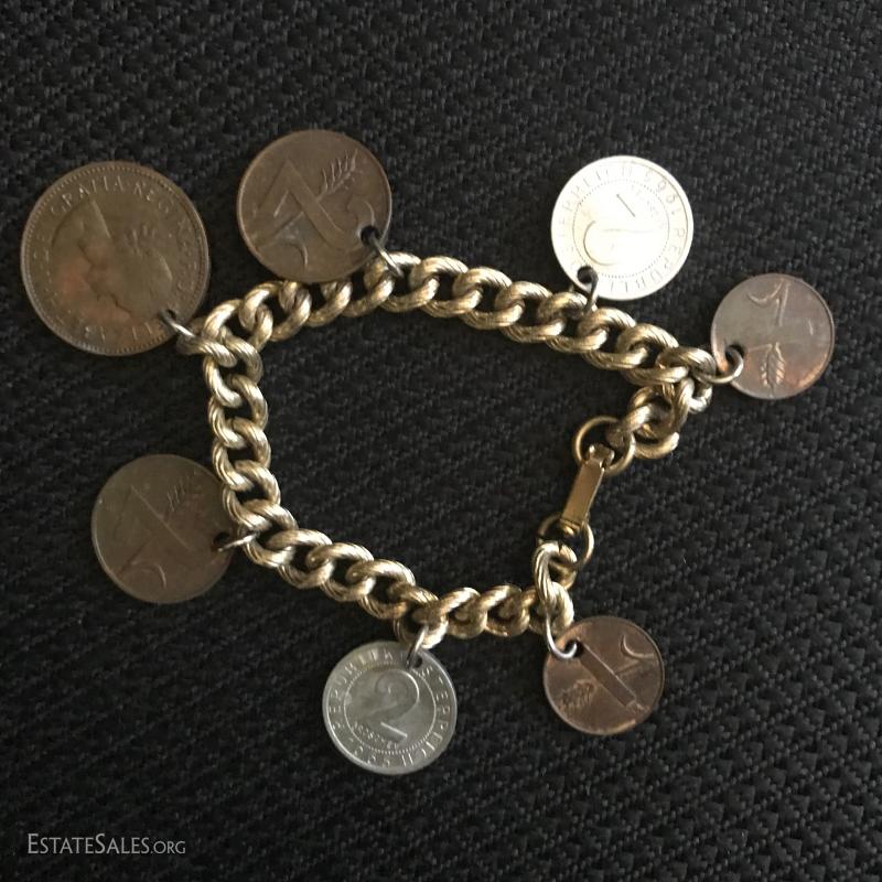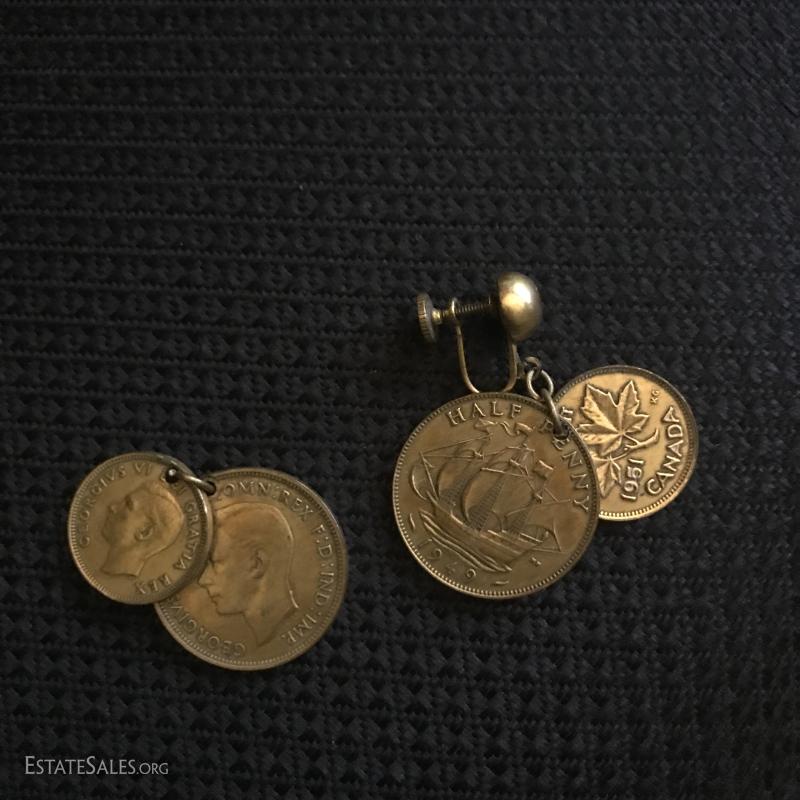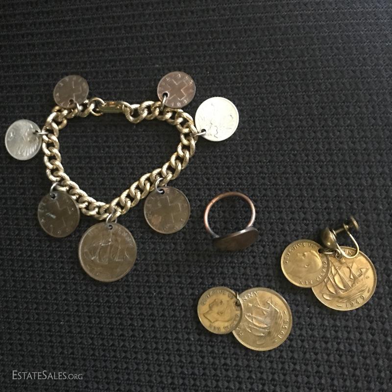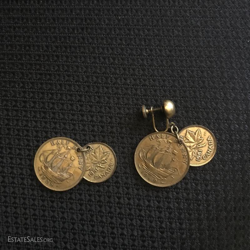 Canadian Coin Bracelet, Coin Pair of earrings (one broken) and Copper 1976 USA Penny Ring (size 7).No markings on any of gold jewelry. We can not verify the authenticity of any of these items. We are stating what is seen to the naked eye. Shipping available or local pick up in Saluda, NC.