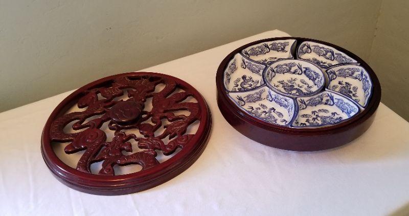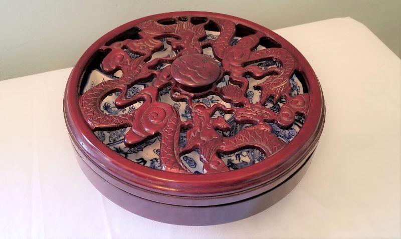 Attractive serving piece with pierced cover - blue/white in the Asian style. Lazy Susan. 13" across - good condition.