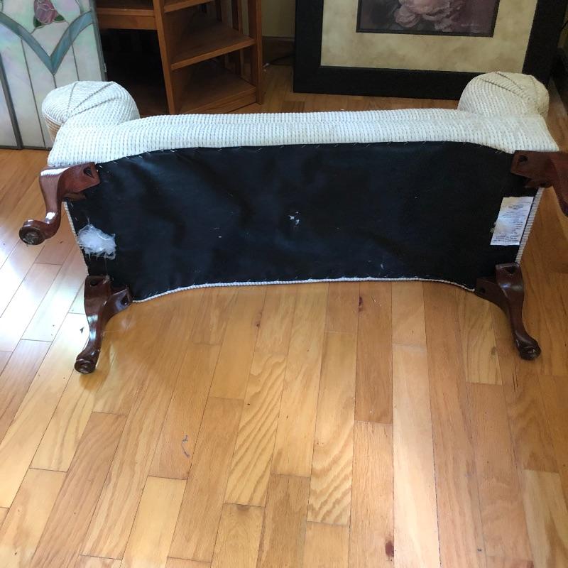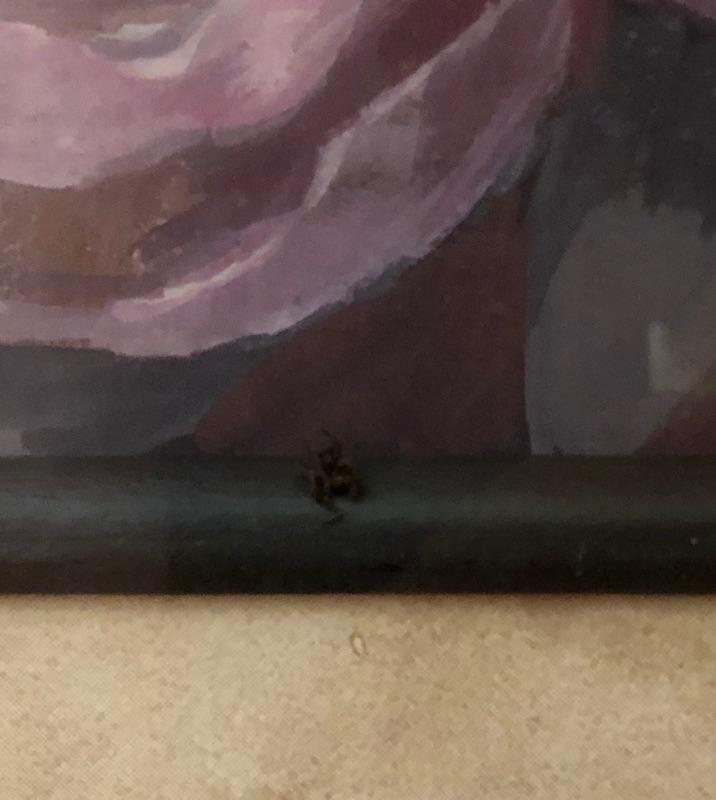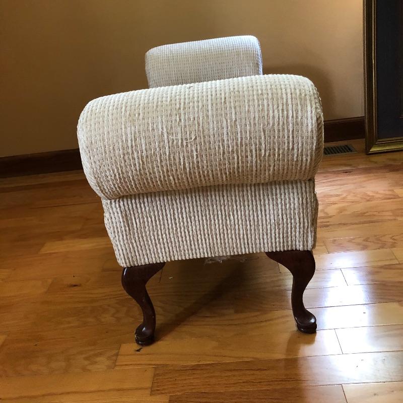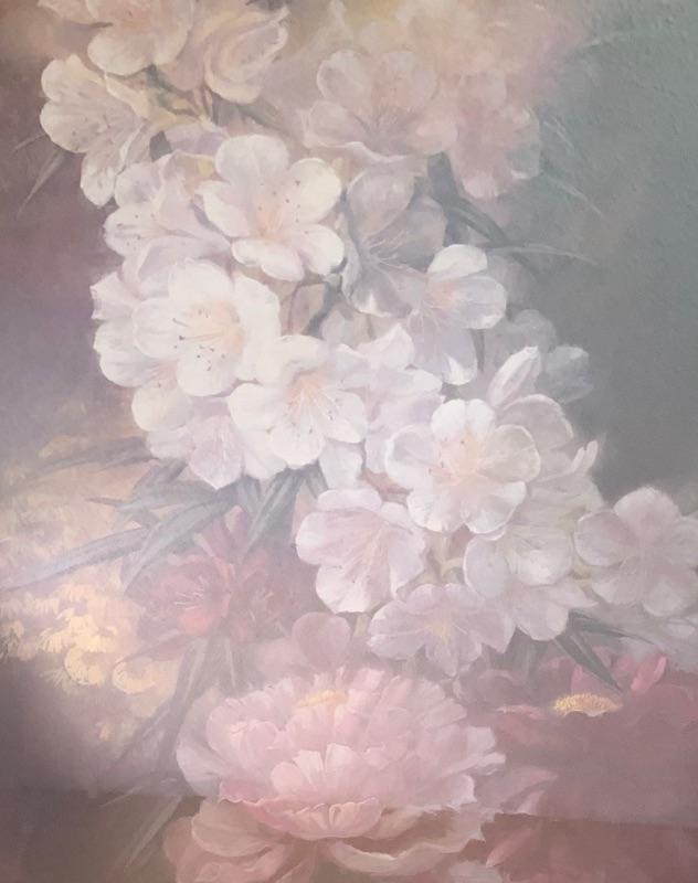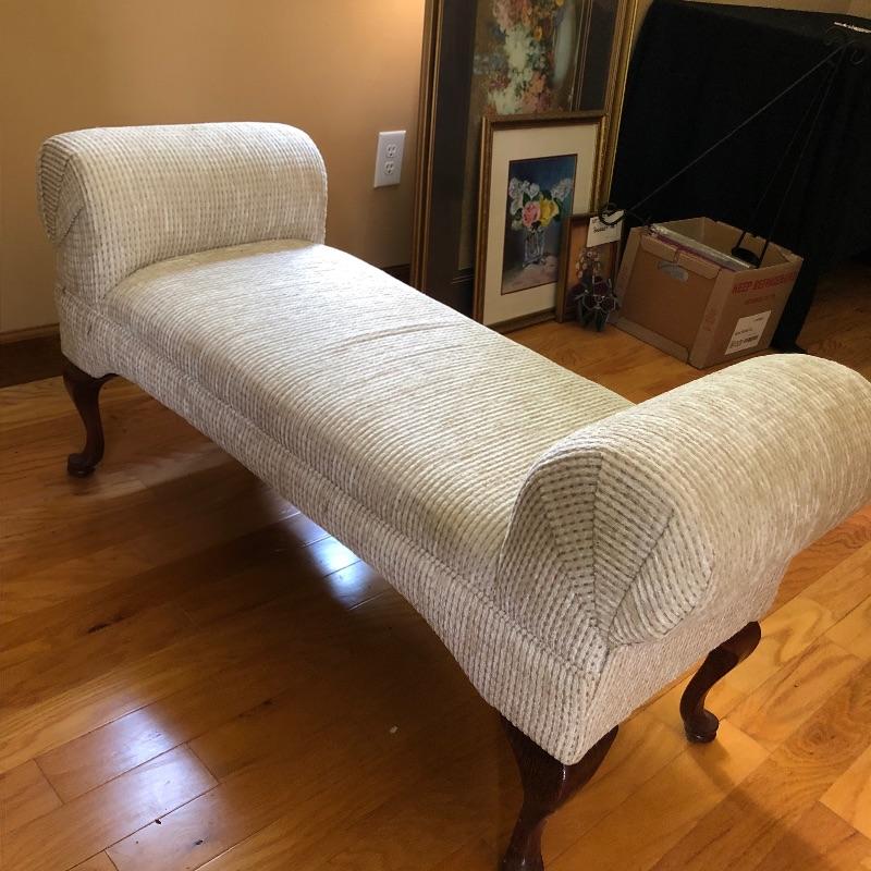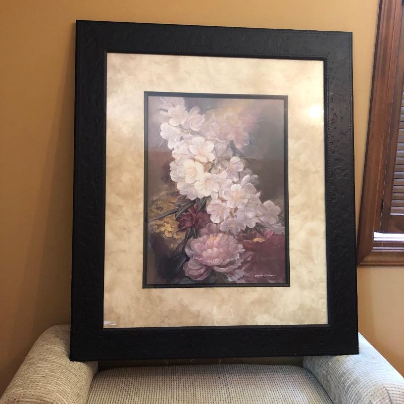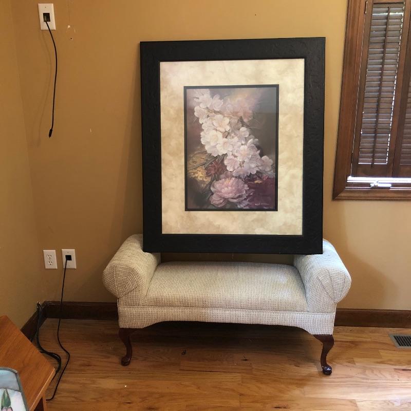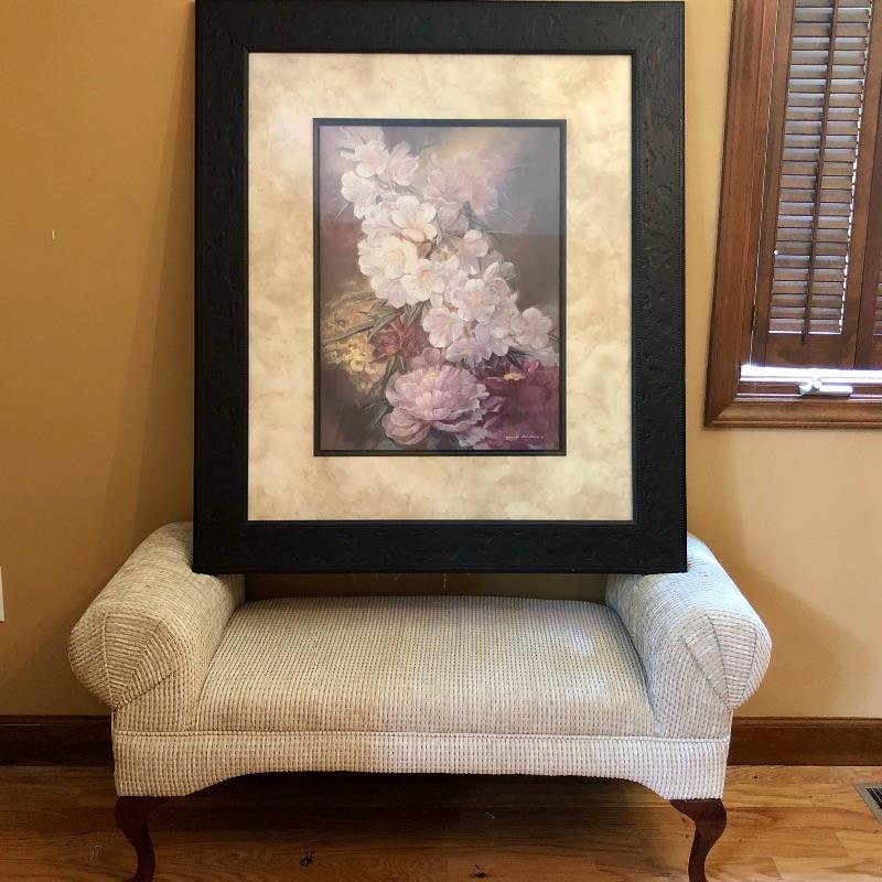 We put these two pieces together because they compliment each other so well; the ivory bench picks up similar colors in the print. This floral inspired art is very large with the matted frame measuring 35” x 41”. The dark, almost black frame has a hammered effect and appears to be a hard resin like material. The last image of the art shows what looks like a bug that got stuck under the glass and has become immortalized within the frame. The bench is very elegant with its ivory colored plush upholstery and cabriole style wood legs.