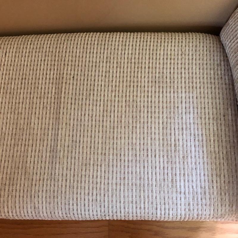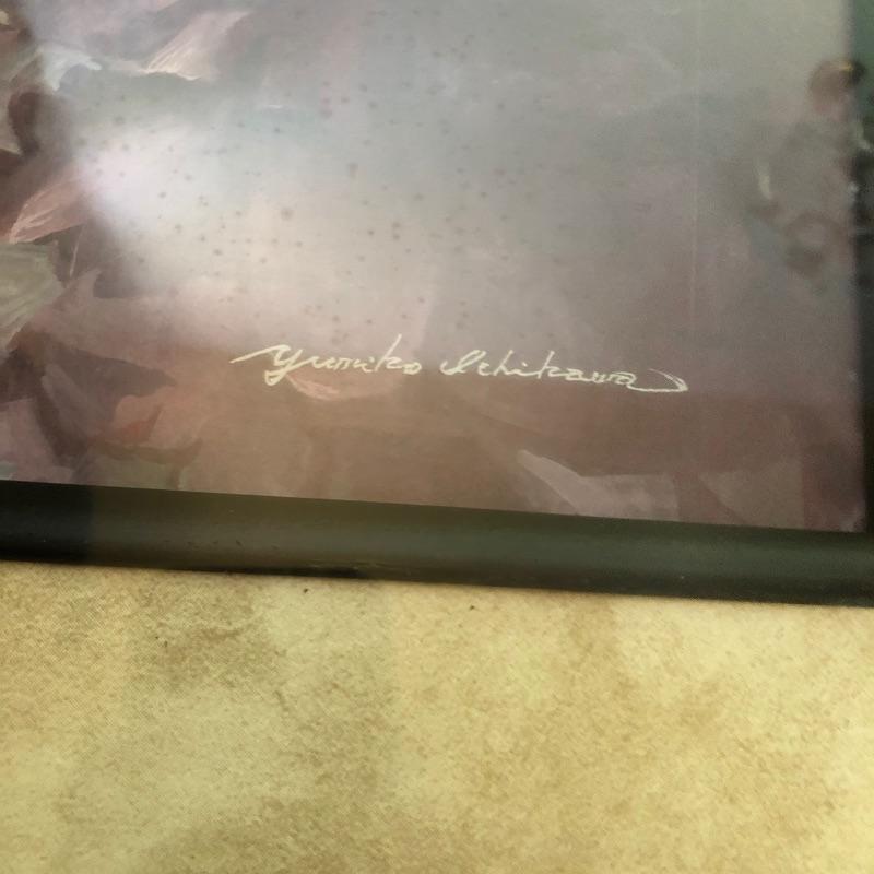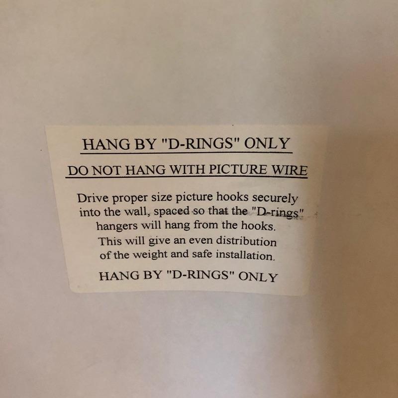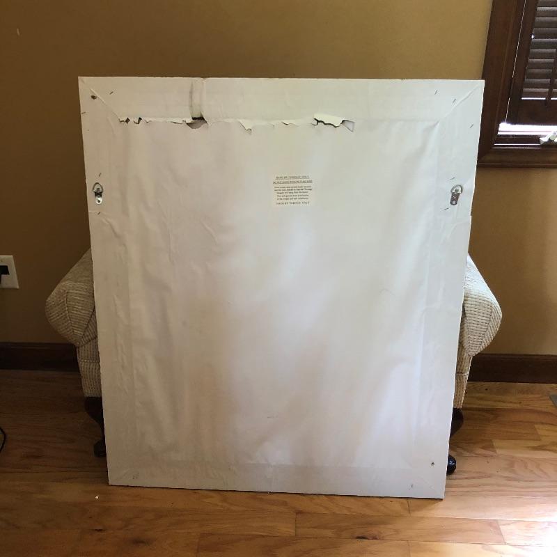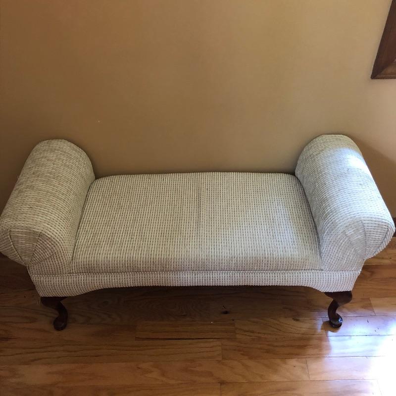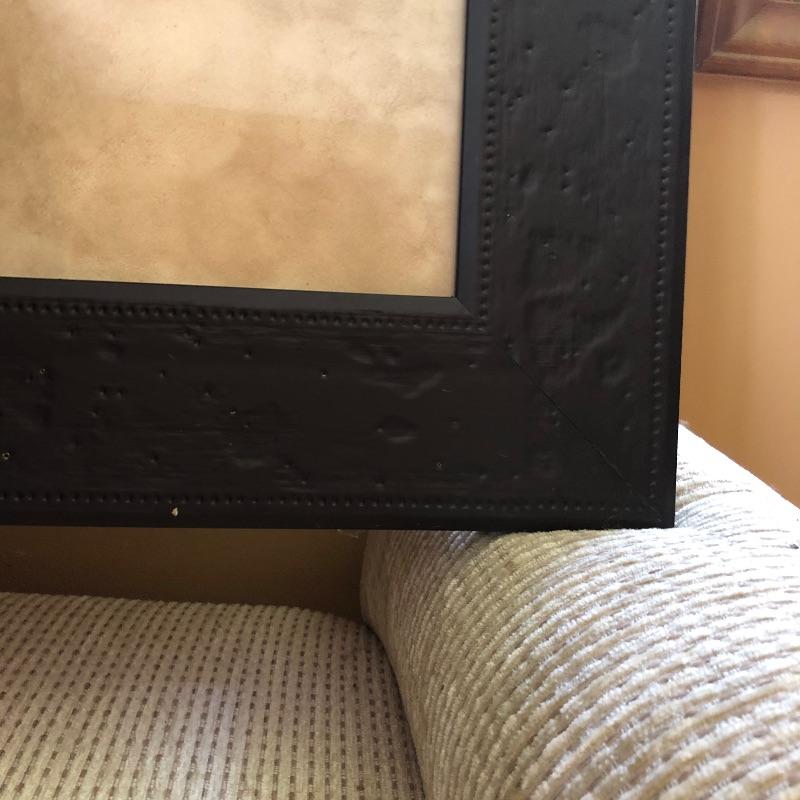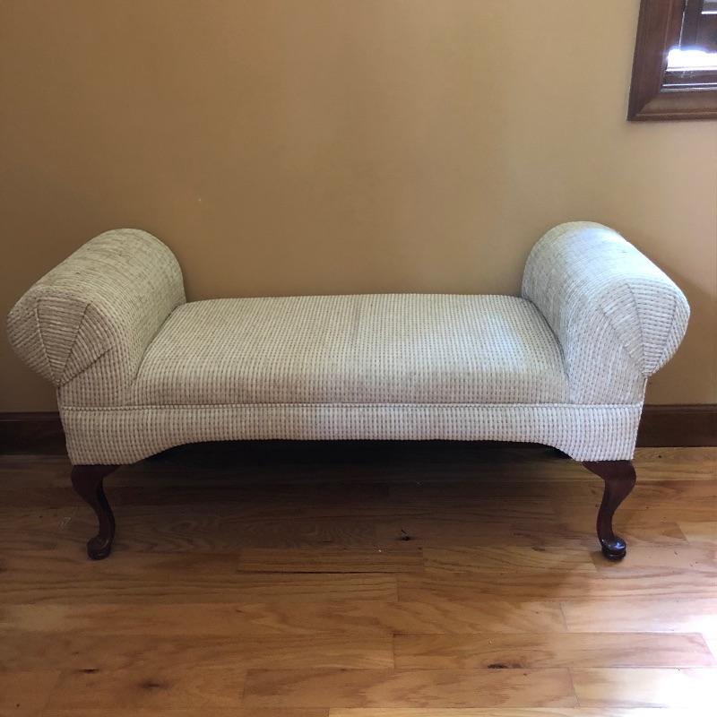 We put these two pieces together because they compliment each other so well; the ivory bench picks up similar colors in the print. This floral inspired art is very large with the matted frame measuring 35” x 41”. The dark, almost black frame has a hammered effect and appears to be a hard resin like material. The last image of the art shows what looks like a bug that got stuck under the glass and has become immortalized within the frame. The bench is very elegant with its ivory colored plush upholstery and cabriole style wood legs.