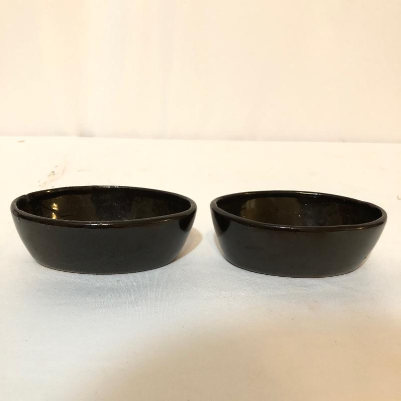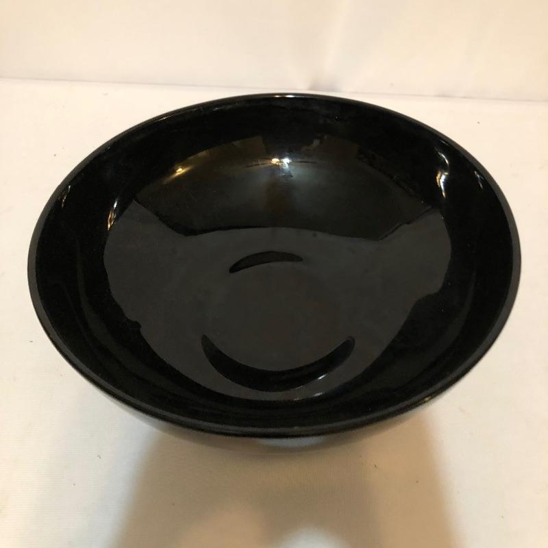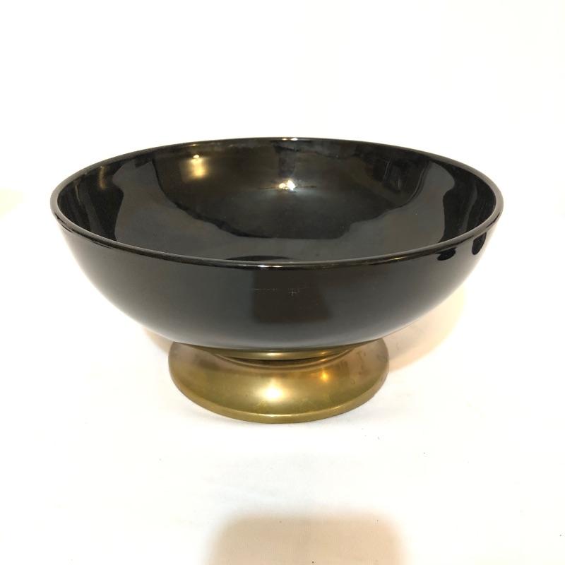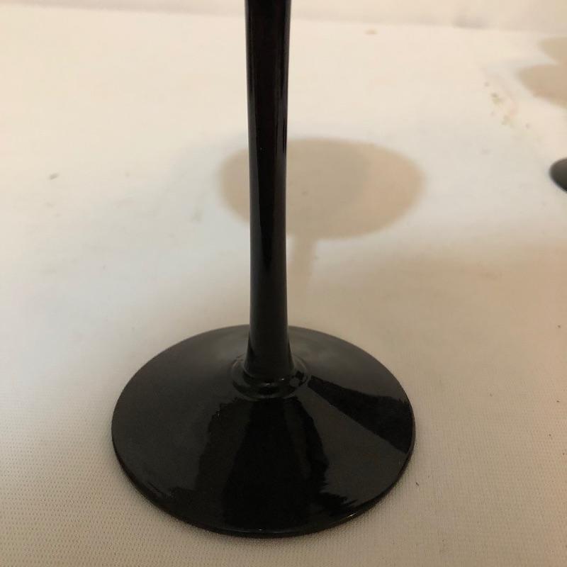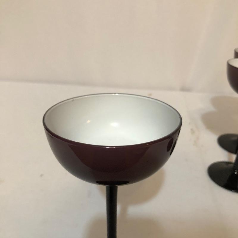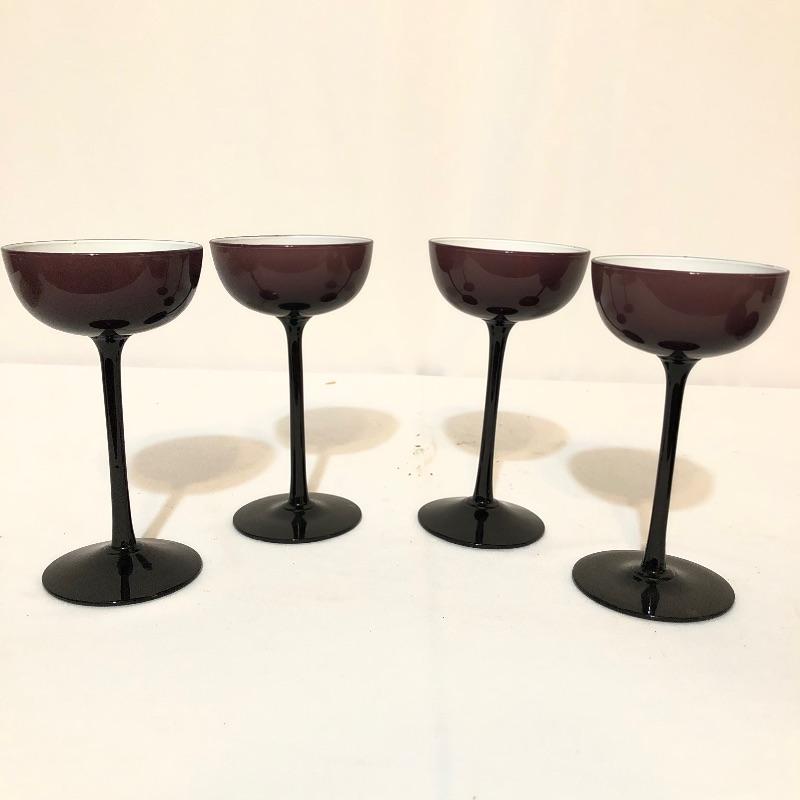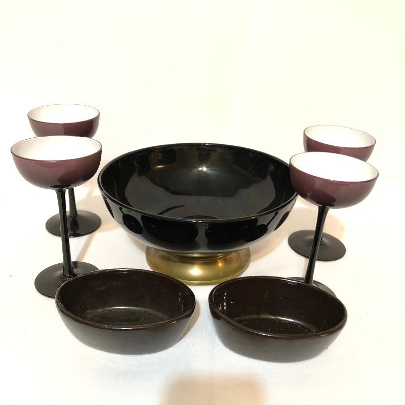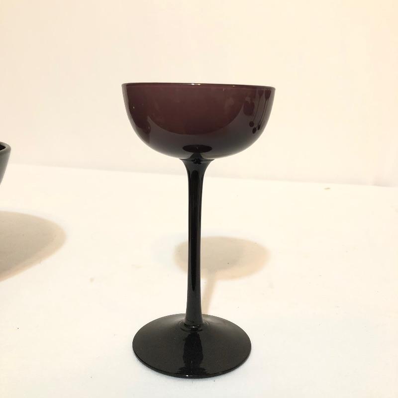 Attractive assortment of dark glass pieces that includes a large bowl, four stemmed glasses and two small bowls. Great for entertaining, the four glasses could be used for cocktails, the small bowls for nibbles and the large bowl could hold punch or fruit, the possibilities are many.