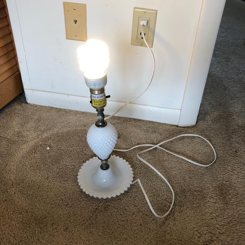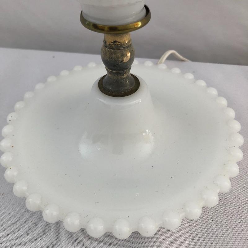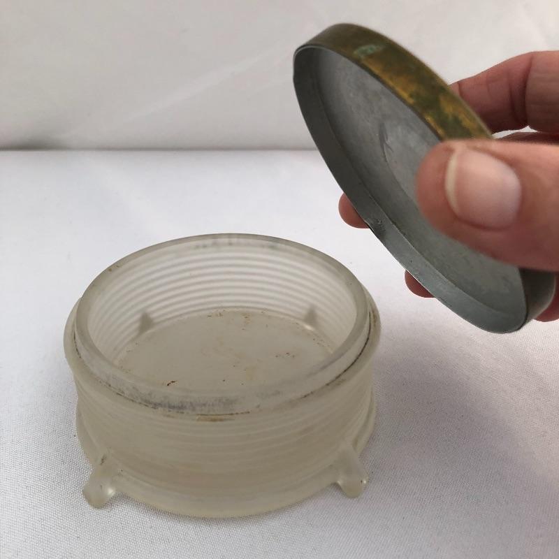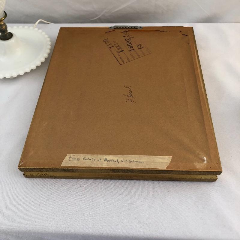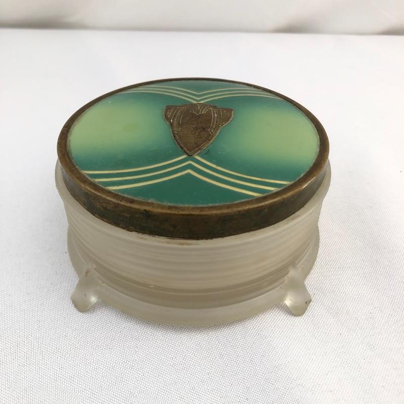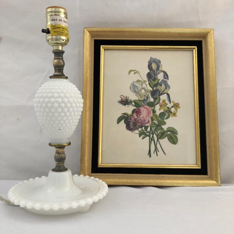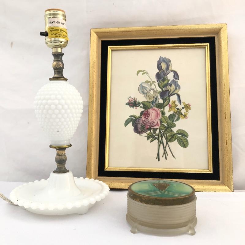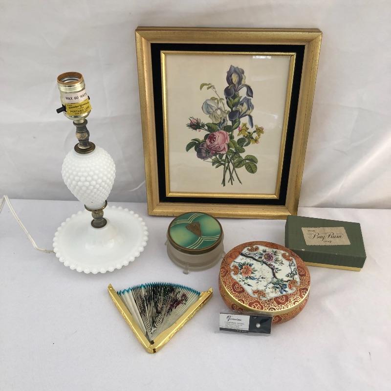 This adorable lot will add vintage elegance to your vanity space. The small lamp is white milk glass with brass accents. The floral art is mounted in a gilded frame that measures 10.5” x 12.5”. Also included is a metal lidded decorative tin, an Art Deco style glass and metal lidded jar, a cultured Pearl and more.