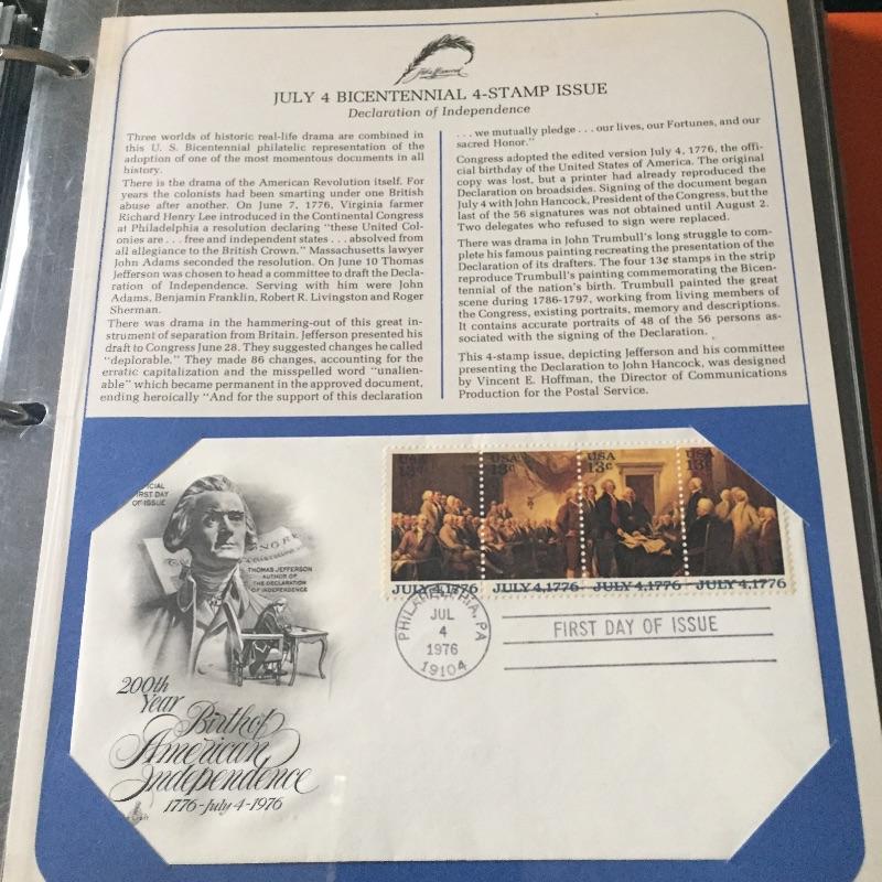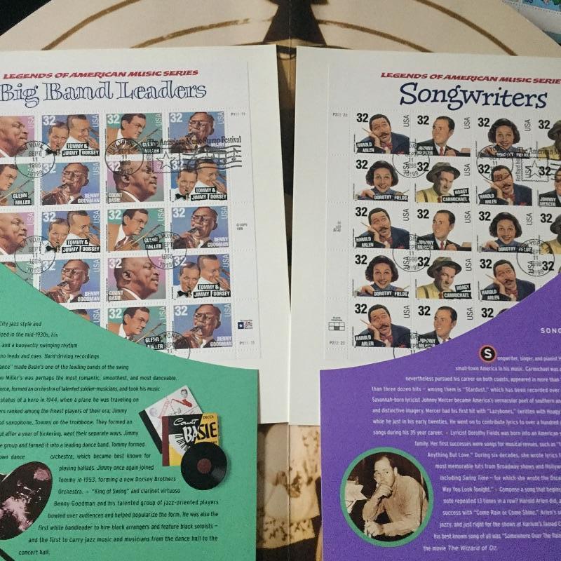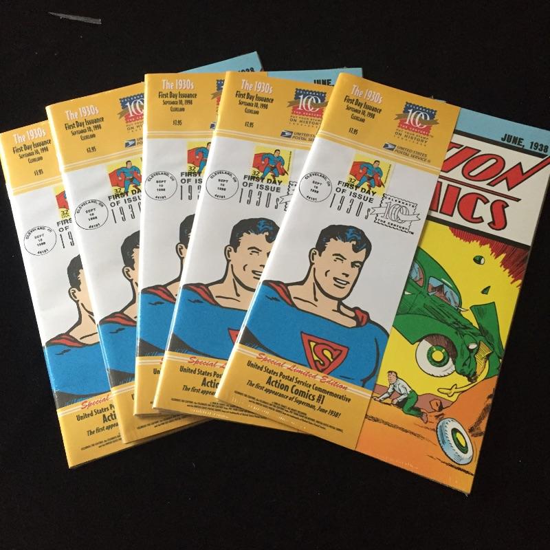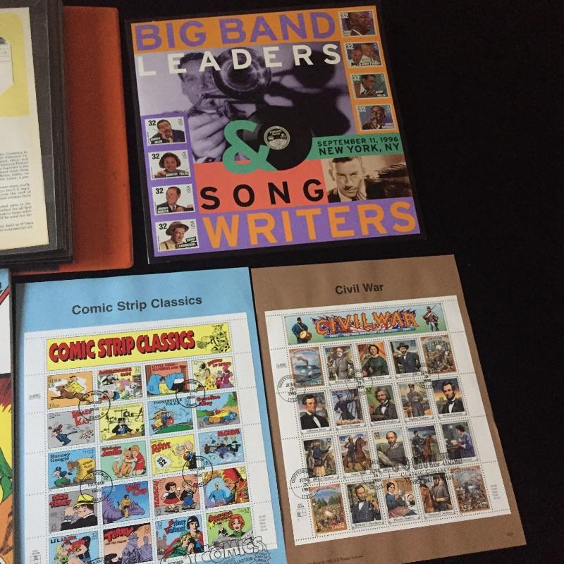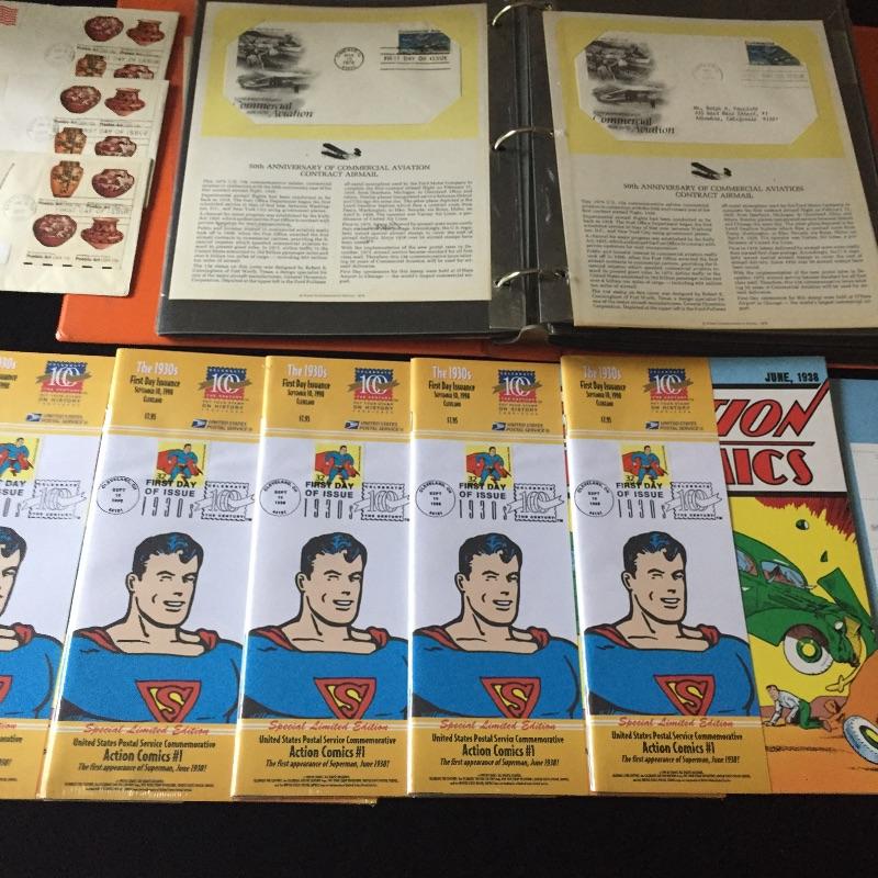 Five Superman comics with first day of issue 1998 Superman stamp with comic. Also include a binder full of over forty first day issue stamps and a Big Band Leaders Stamps and Folder.