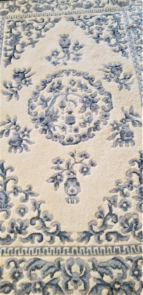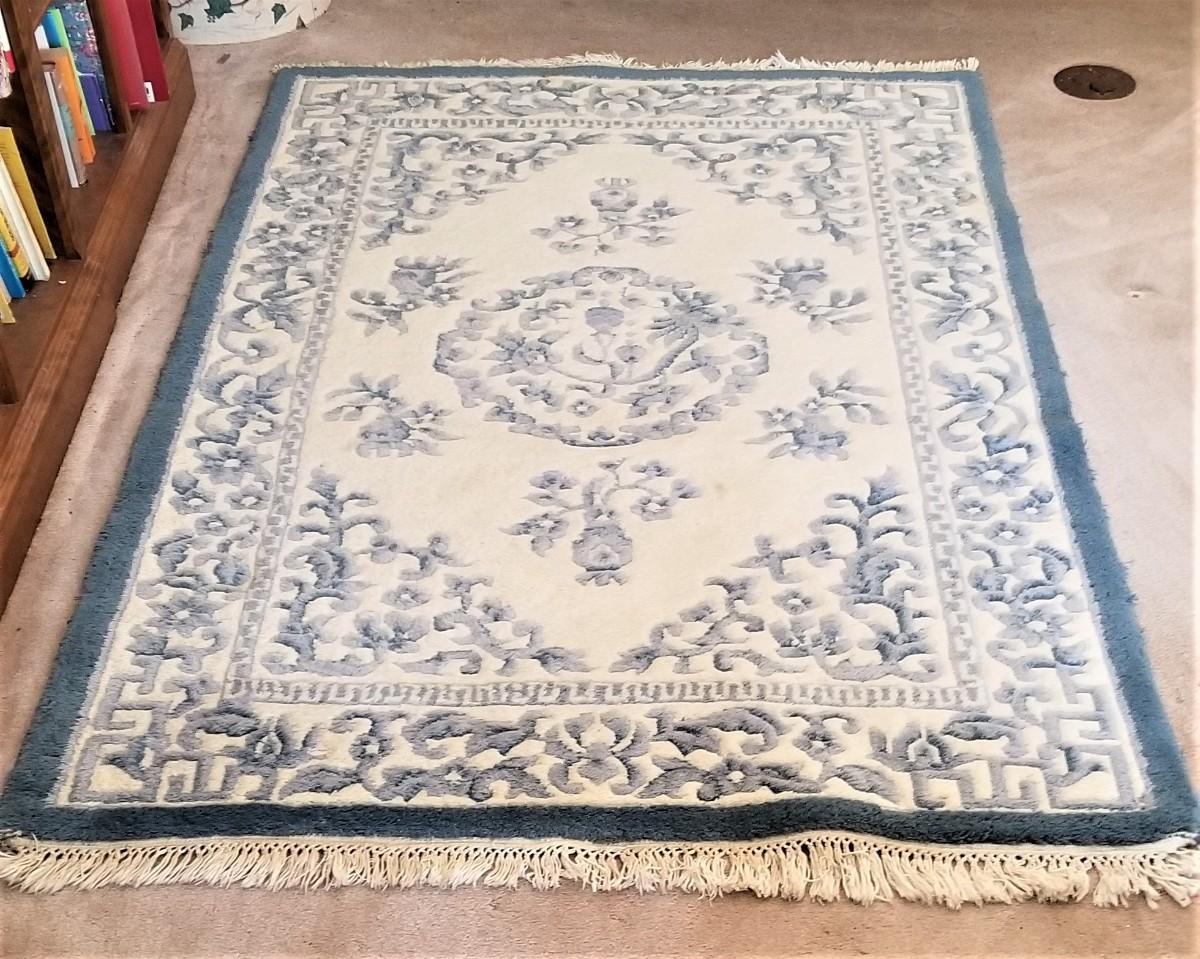 Nice thick pile rug in french blue/ivory. Classic design - gently used. Measures 75.5" x 48".