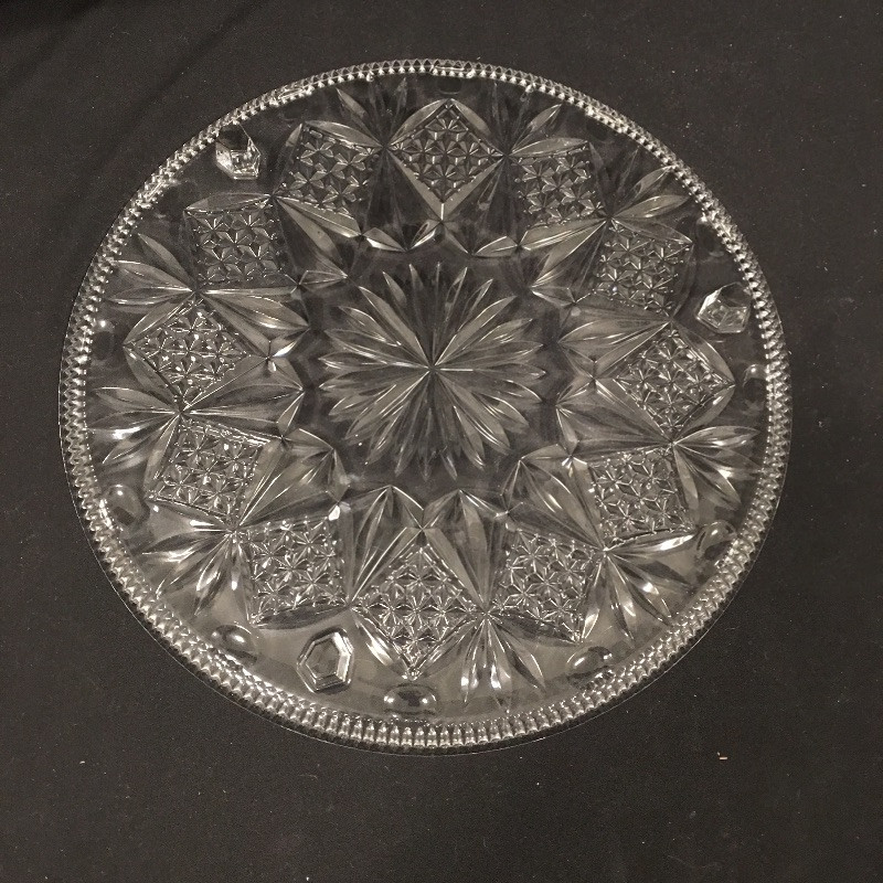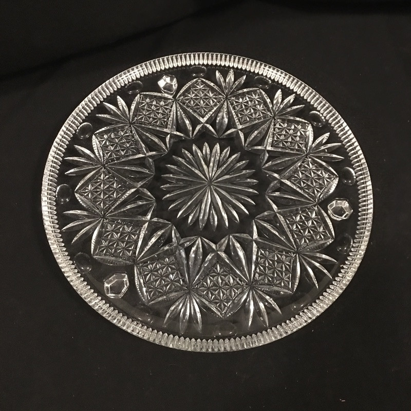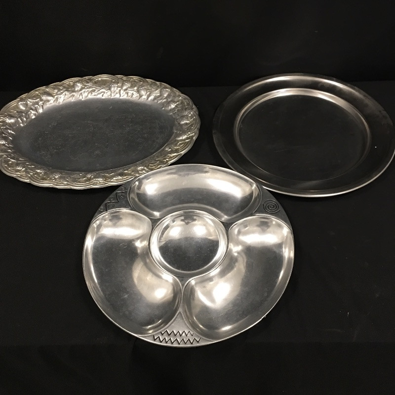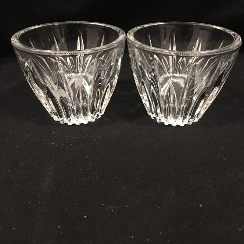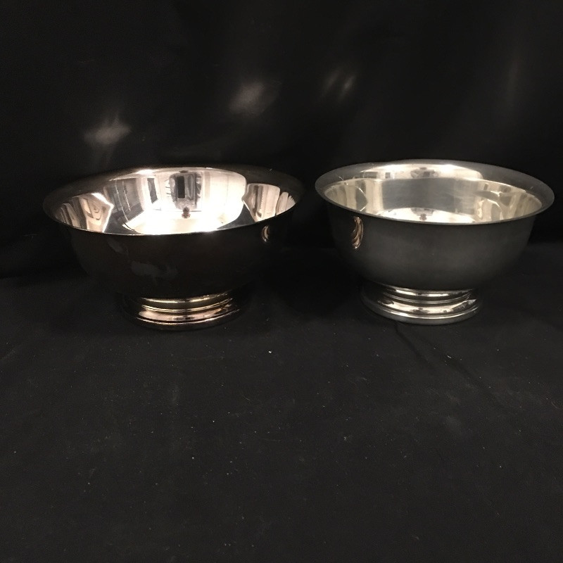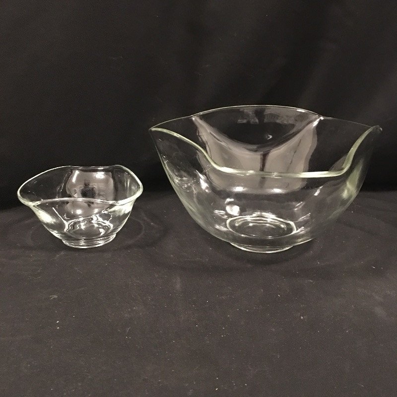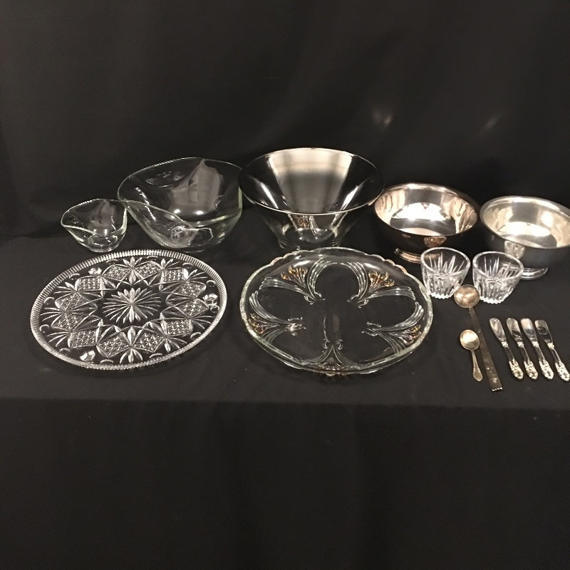Glass and silver are included in this lot with three glass bowls, two glass platters, two glass cups, two bowls, four small knives, two platters, large dip platter and two spoons, see images for everything that is included Largest bowl measures 10.75” D x 5.75”.
