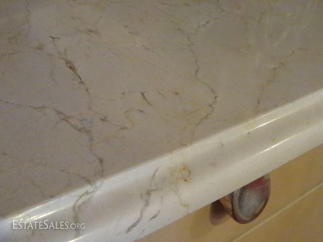 LOT 83: HENREDON MARBLE TOP SIDEBOARD, BOW FRONT, MARBLE TOP, OVAL DRAWER PULLS, 3 DRAWERS ABOVE 4 DOOR LOWER CABINET, VERY GOOD GENTLY USED CONDITION WITH LIGHT WEAR TO CABINET PULLS, 79"W X 39"H X 26"D, SKU3916.01