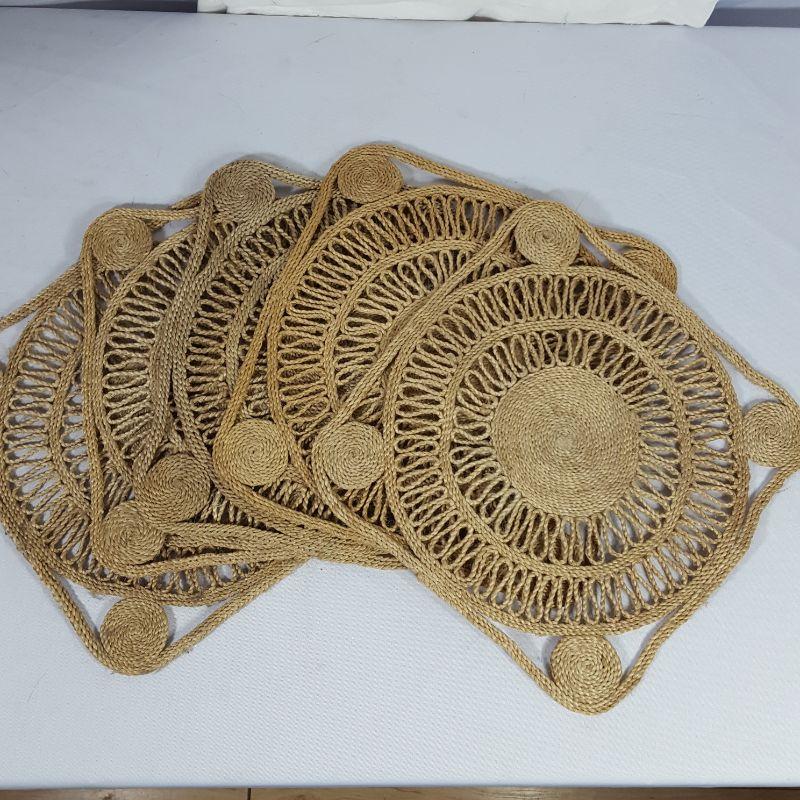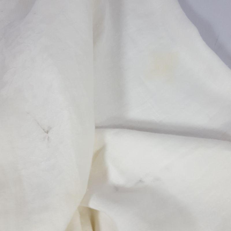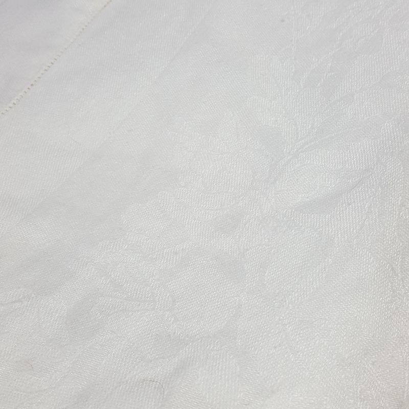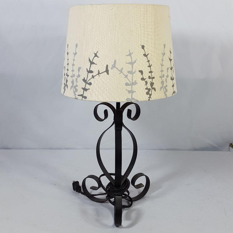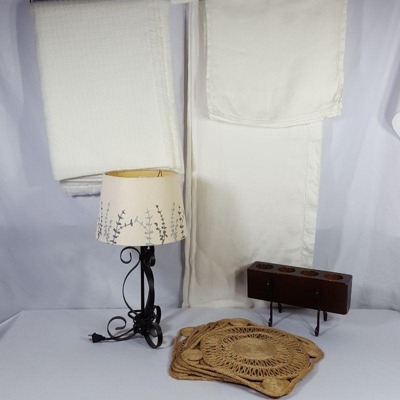 A metal lamp with a cream shade embellished with grey flowers to light up your bedroom or living room. The lamp is 20 in high and works like a charm! Pair it with a wooden and metal votive candle holder for that finished touch. Next add 5 woven placemats to your rectangular 61x81 white linen table cloth trimmed with shiny flowers, which is difficult to photograph, but zoom in and you'll see! The table cloth has 6 matching white linen napkins. Lastly, a white, soft blanket 61x81. Blanket has a few yellowing spots, shown in the pictures.