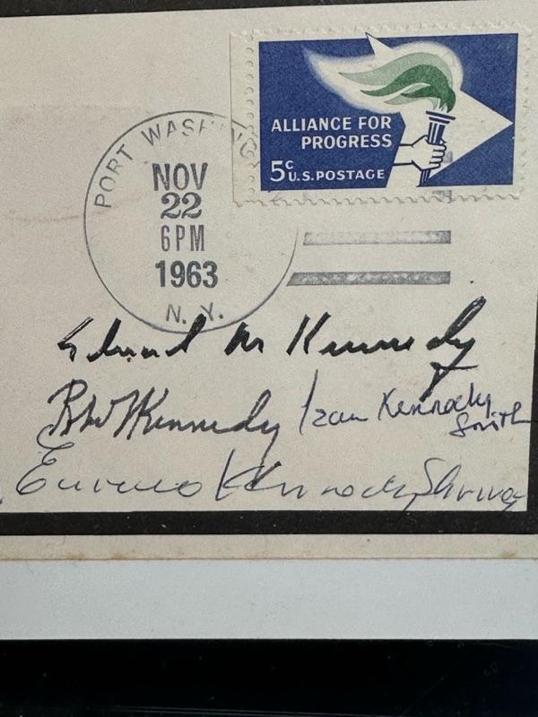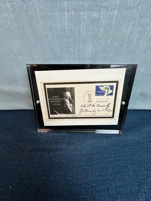 JFK postcard signed by various Kennedy members in Acrylic frame