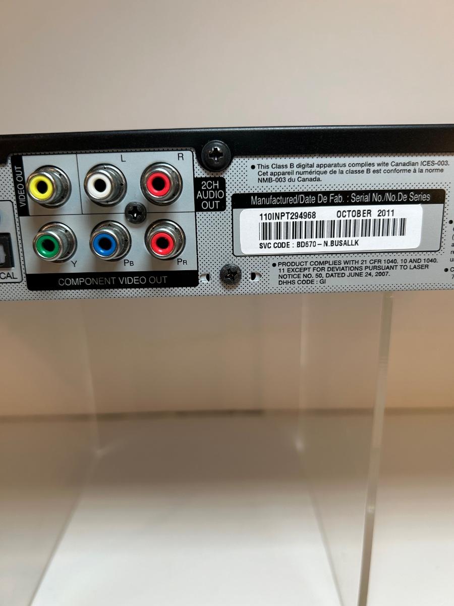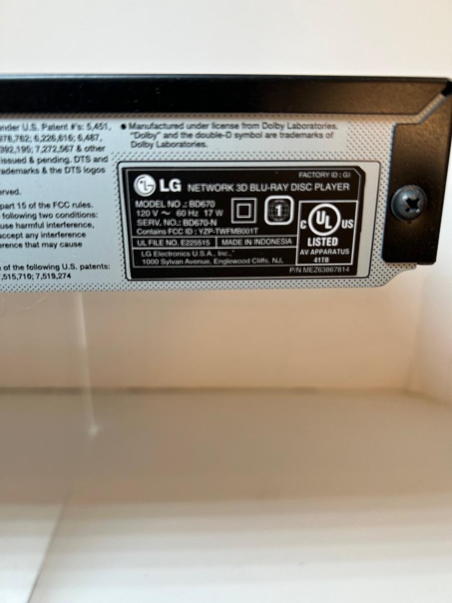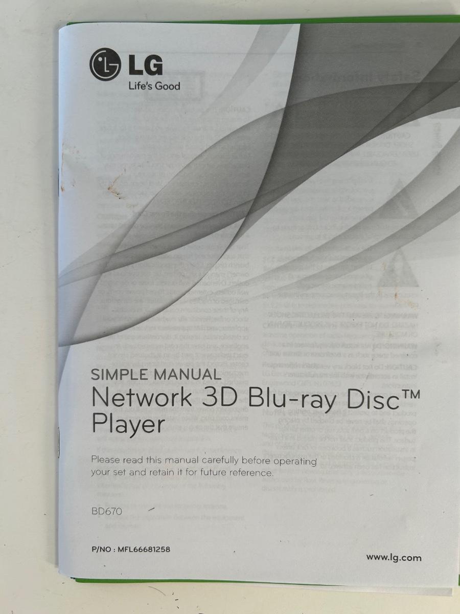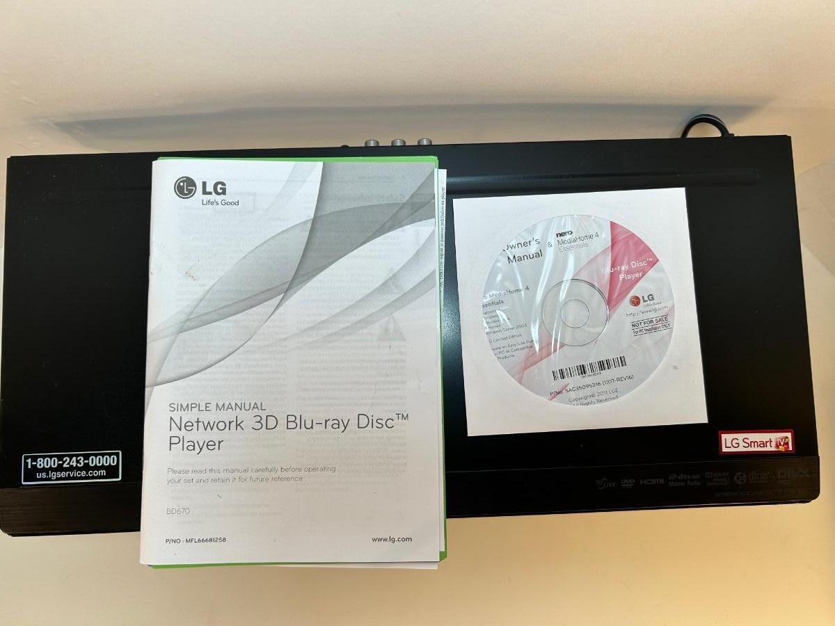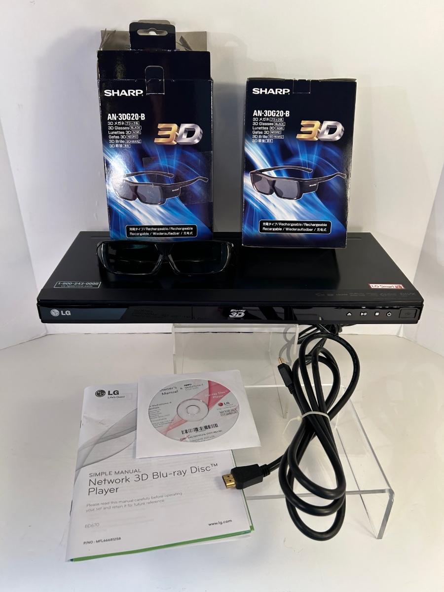 Includes LG Network 3D Blu-ray Disc player Model BD670, manufactured in October 2011, Instruction manual, Owner’s manual & Nero MediaHome 4 Essentials disc, 2 like new Sharp 3D rechargeable glasses Model AN-3DG20-B. *No Remote