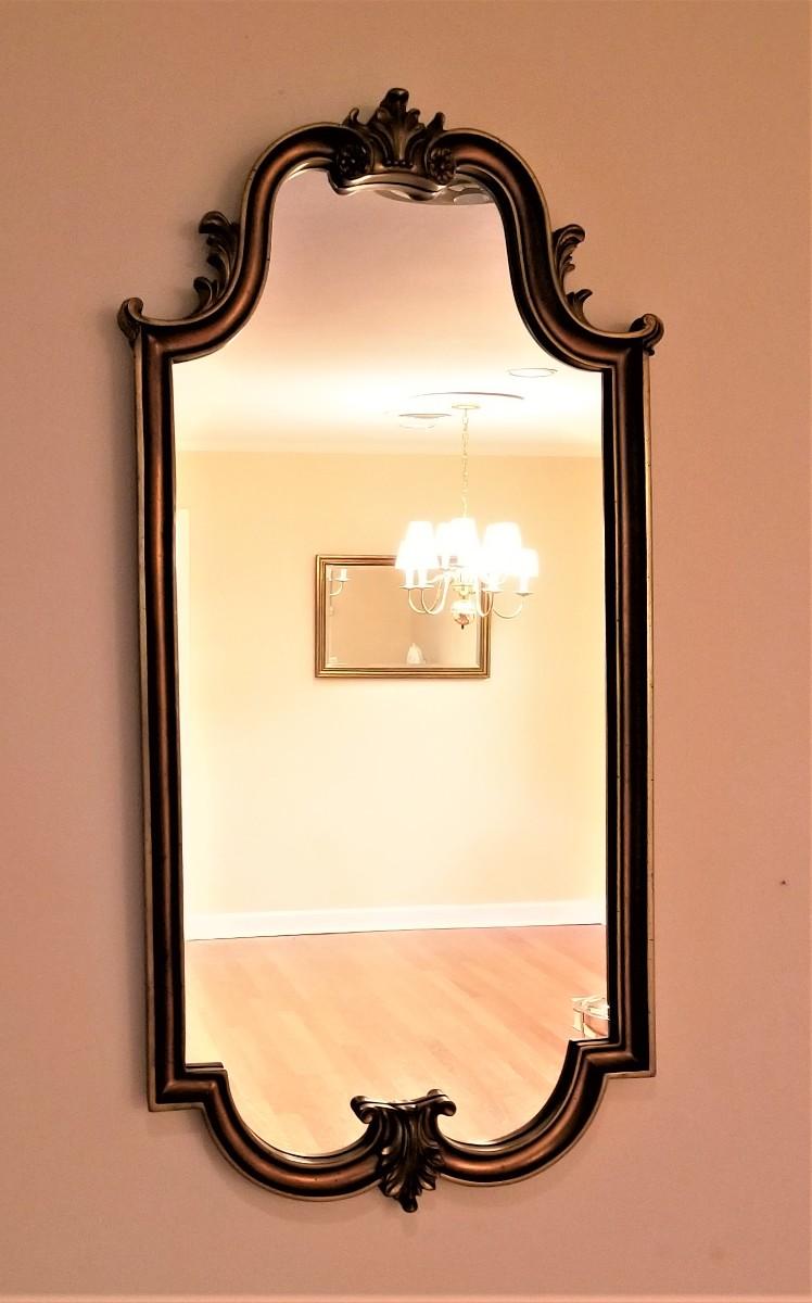 Classic Wall mirror in excellent condition - burnt gold frame. Measures 41" tall, 19" across.