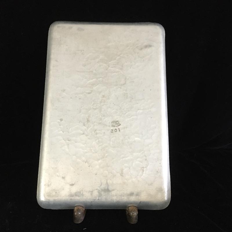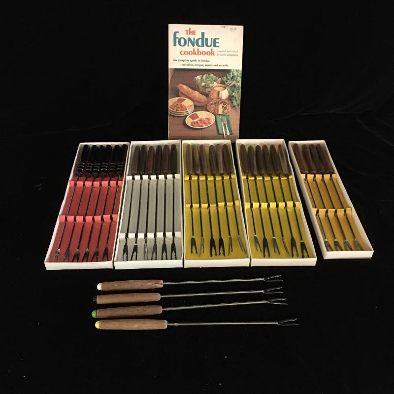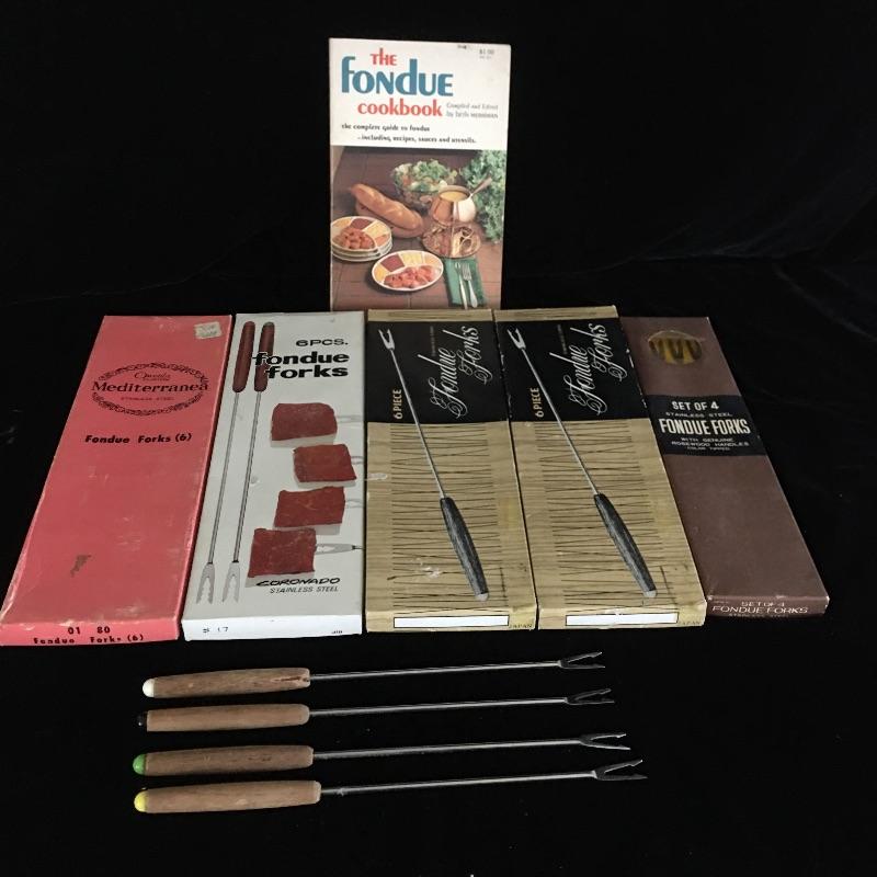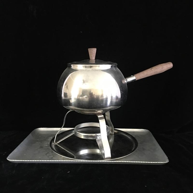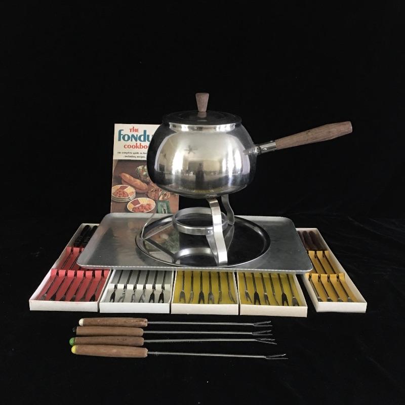 MCM fondue set with tray. Lot includes stainless steel fondue pot and tray, six sets of fondue forks, fondue cookbook and a Everlasting forged aluminum tray that measures 9.25” x 14.25”. Enjoy a nice evening cooking with this cool vintage fondue set.