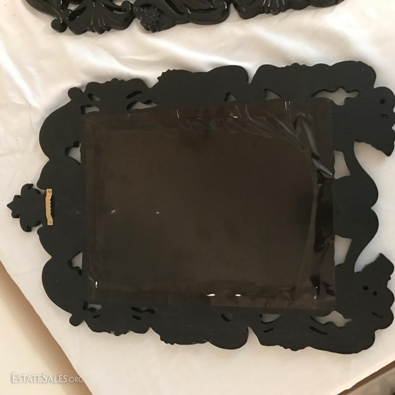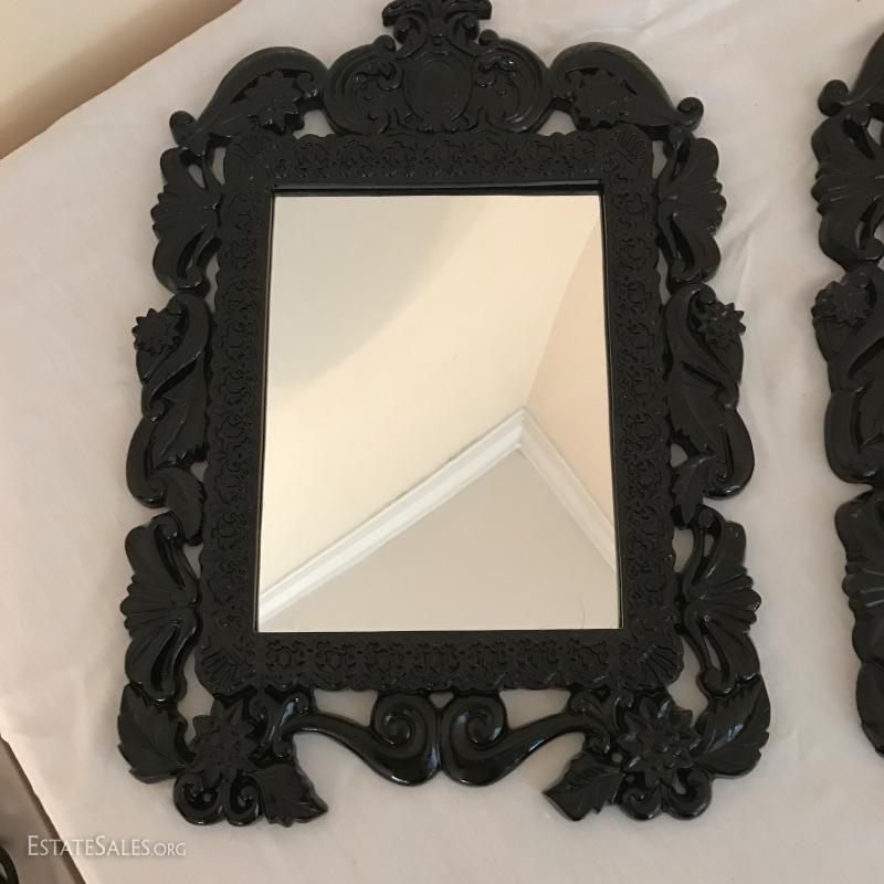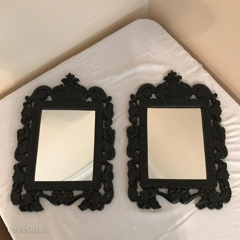 2 matching mirrors in black framing. Appear to be a heavy plastic resin material. Each measures 17" x 12". This lot is available for local pick up in Mills River, NC only.
