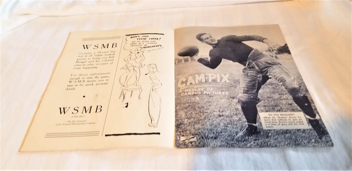 Dated November 16, 1940 - Tulane vs. the Georgia Bulldogs. Full of great vintage ads, i..e "have dinner at the Roosevelt for $1.50!" Complete. A few pencil marks in the centerfold, back cover has a fold in it, minor damage (does not affect content) on last several pages.