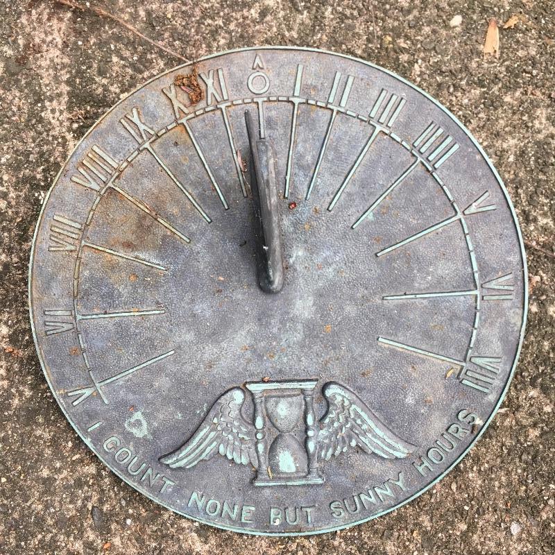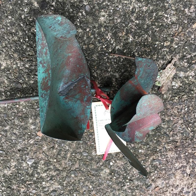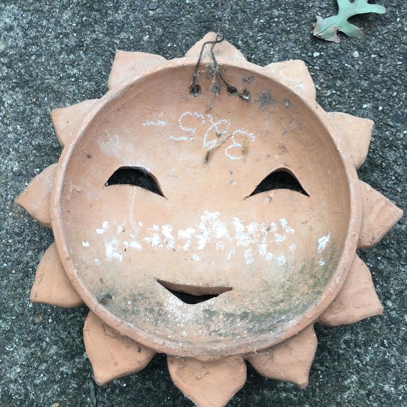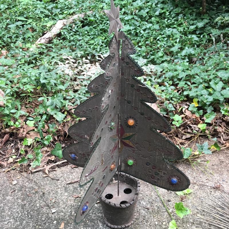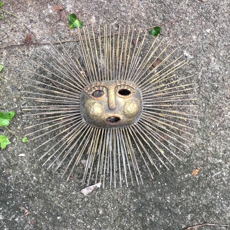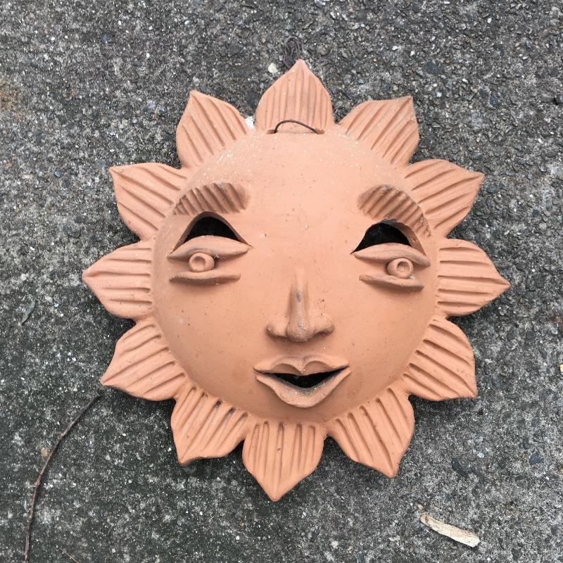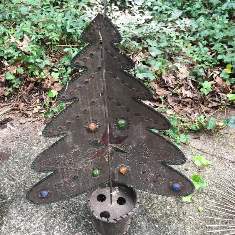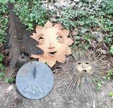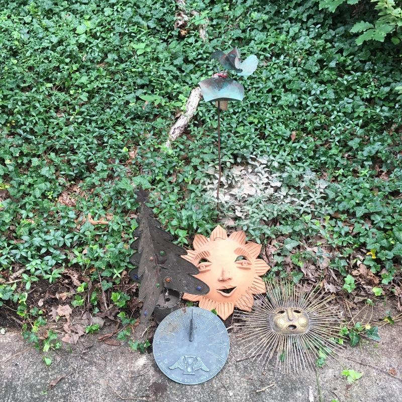 Outdoor art includes clay and brass sun, metal tree, sundial and copper hummingbird. These unique pieces of art are sure to bring beauty to your garden and a smile to your face. Tree measures 13”D x 21” tall.