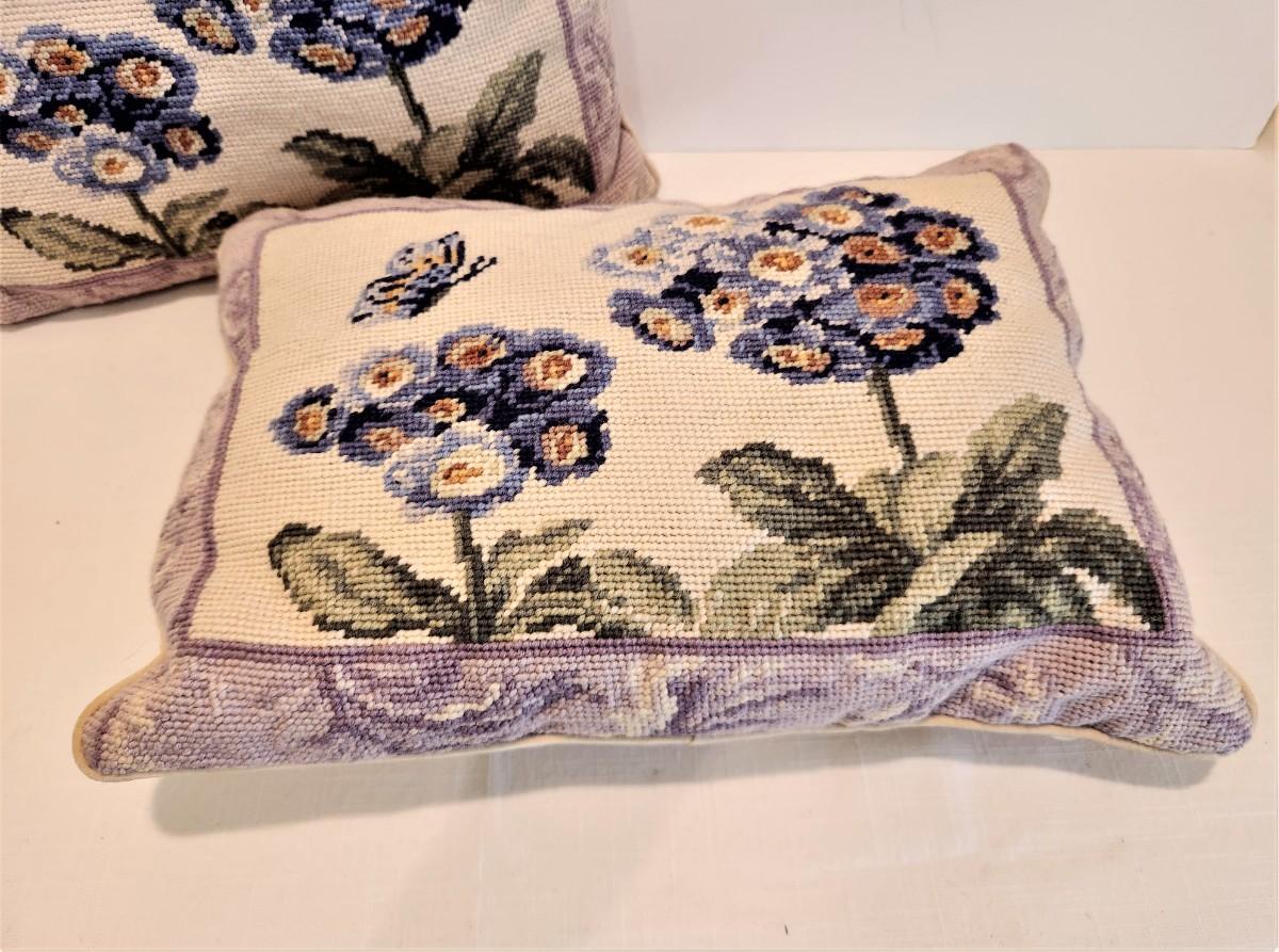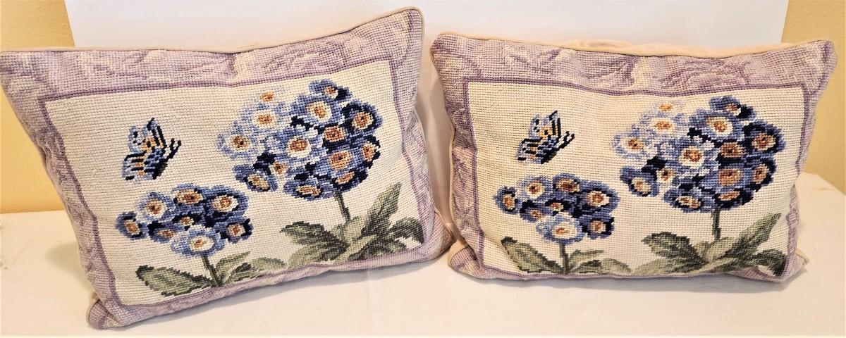 Nice pair of matching needlepoint pillows, each 15" x 11" Clean - blue/violet color motif, floral design with butterfly.