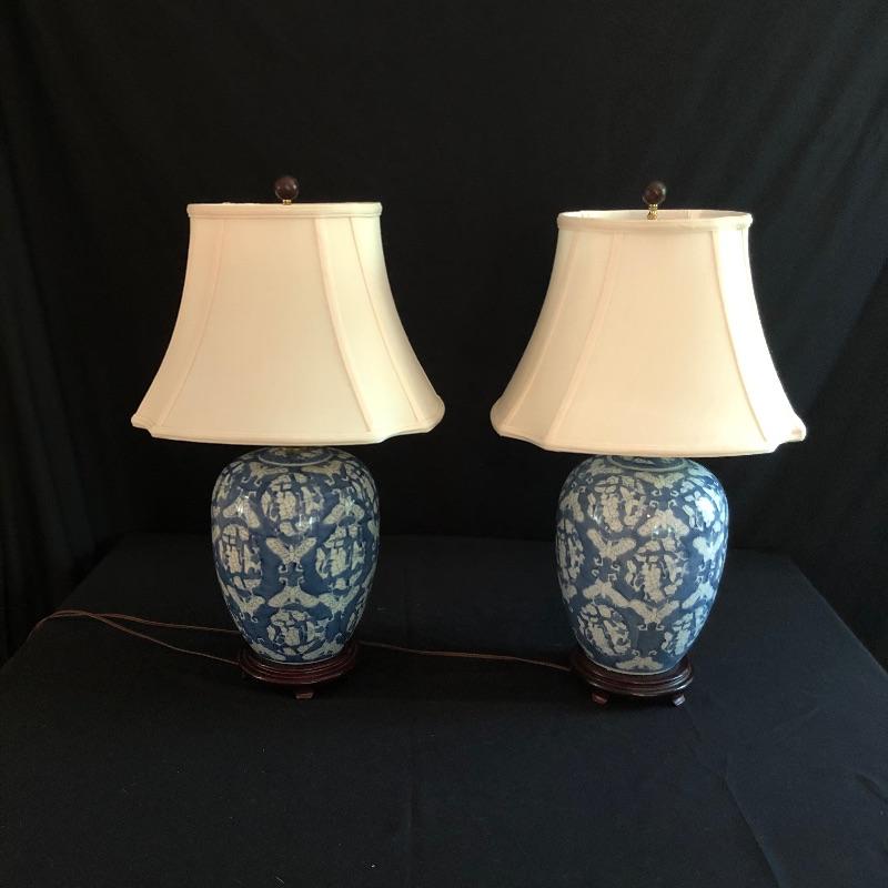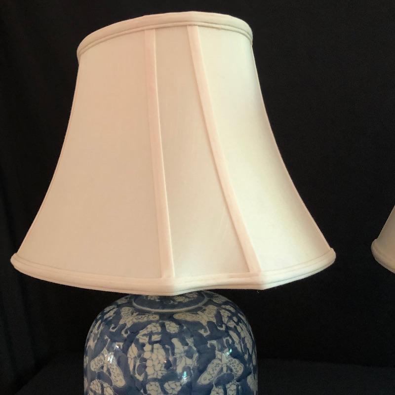 This attractive pair of lamps have 3 way bulbs and are a butterfly design on a pretty blue background. These nice sized ceramic lamps are on wood bases and come with matching ivory colored shades that appear to be in great shape. Worked when tested.