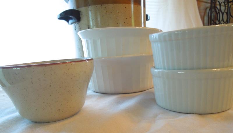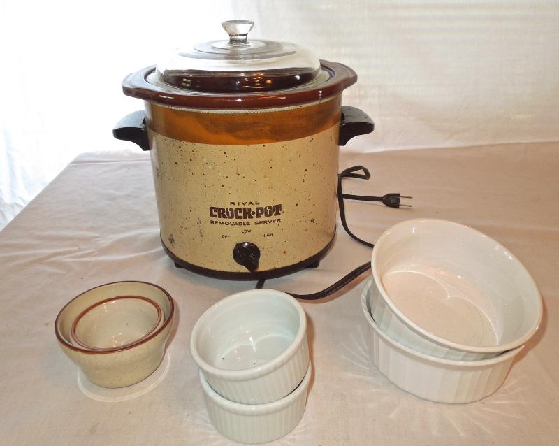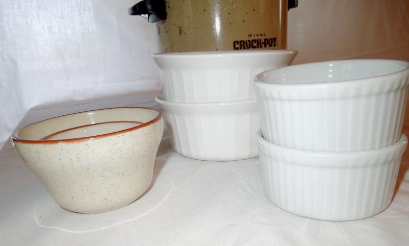Two souffle bowls, four ramekins, small chip on rim of lid of Crockpot.