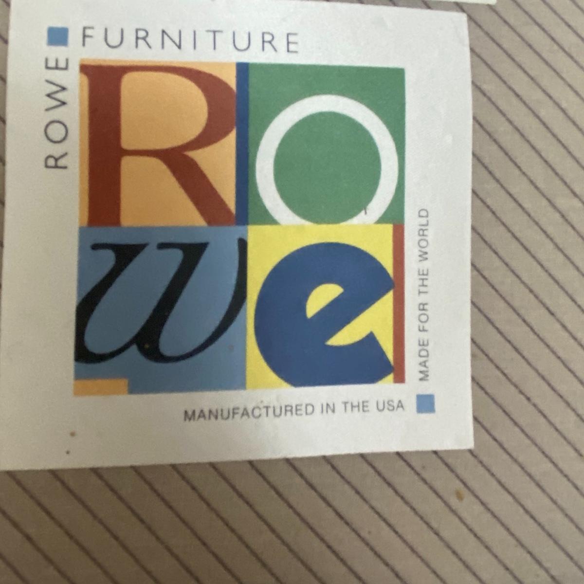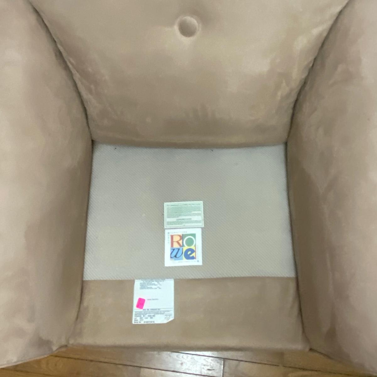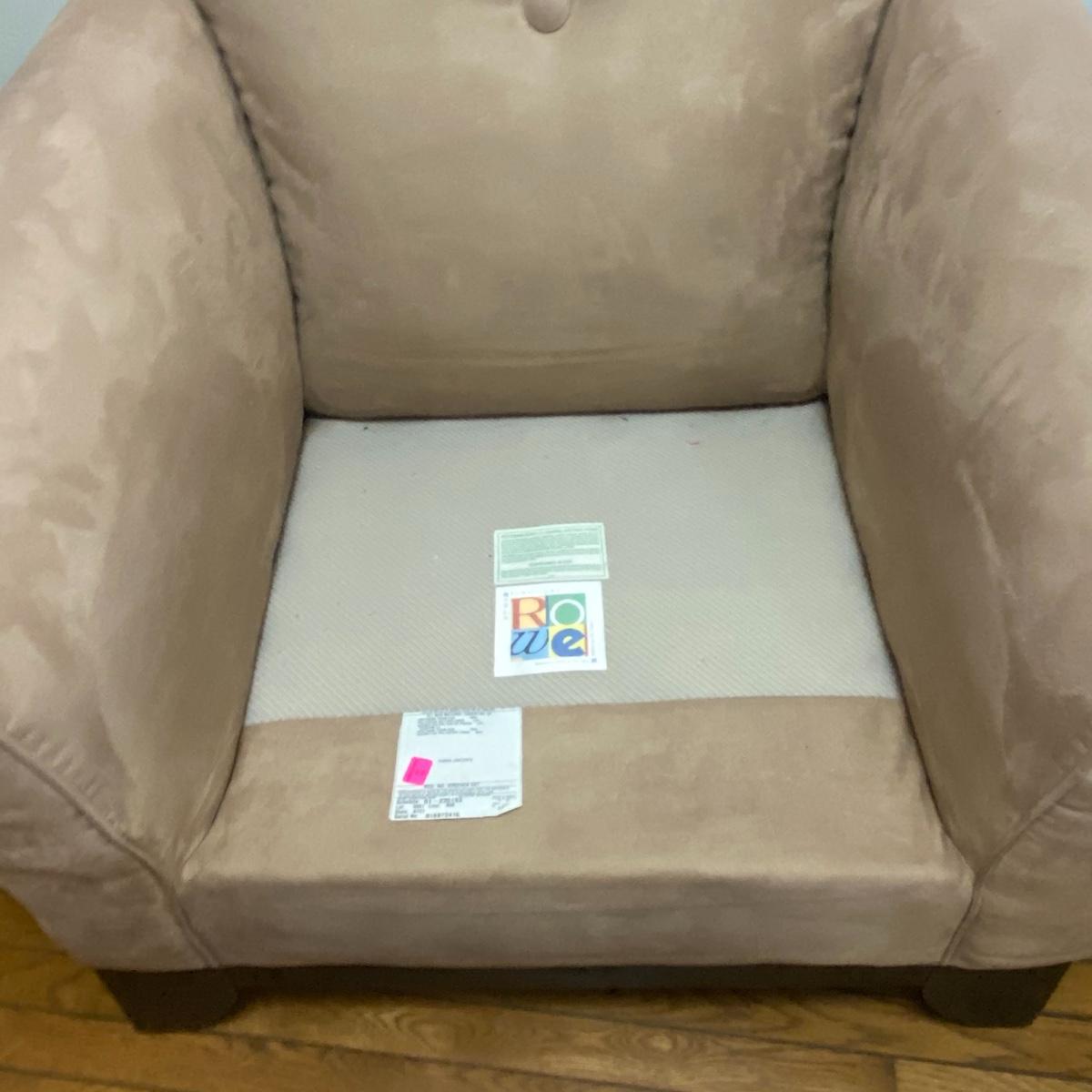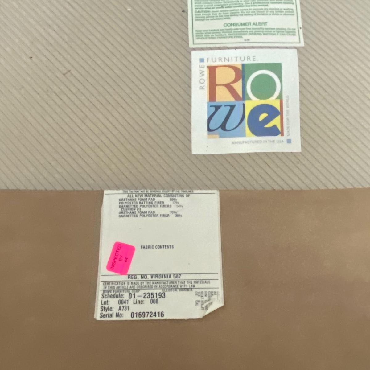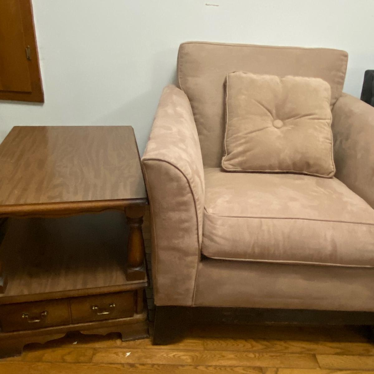 Lot includes tan Rowe chair paired with a side table. Rowe chair includes a pillow and has measurements of 37"x21"x20". Back of the chair stands 34" tall. Wooden side table measures 28"x21"x20". The table has one bottom drawer with two brass-like handles and one open shelf/magazine slot. See photos. Local pickup only.