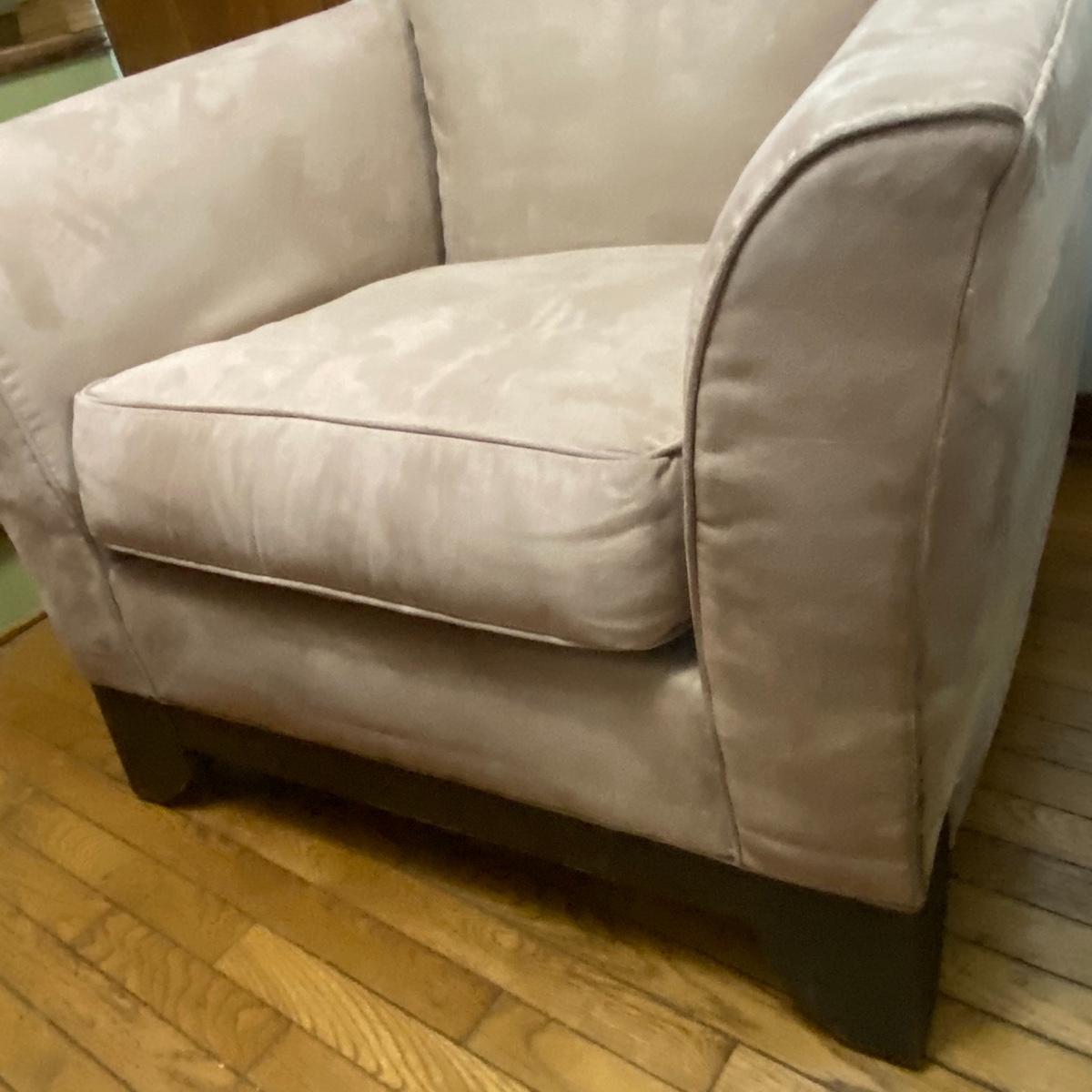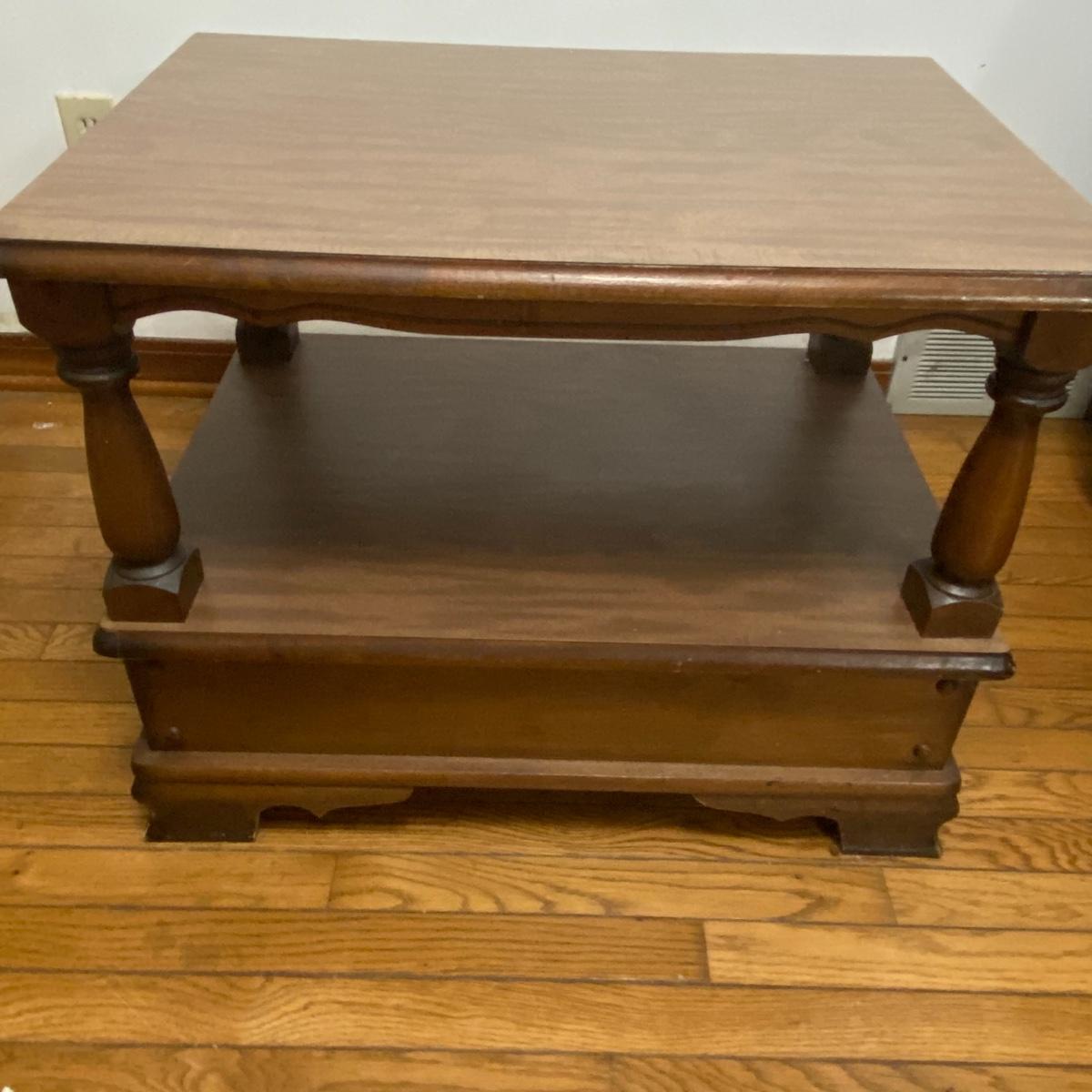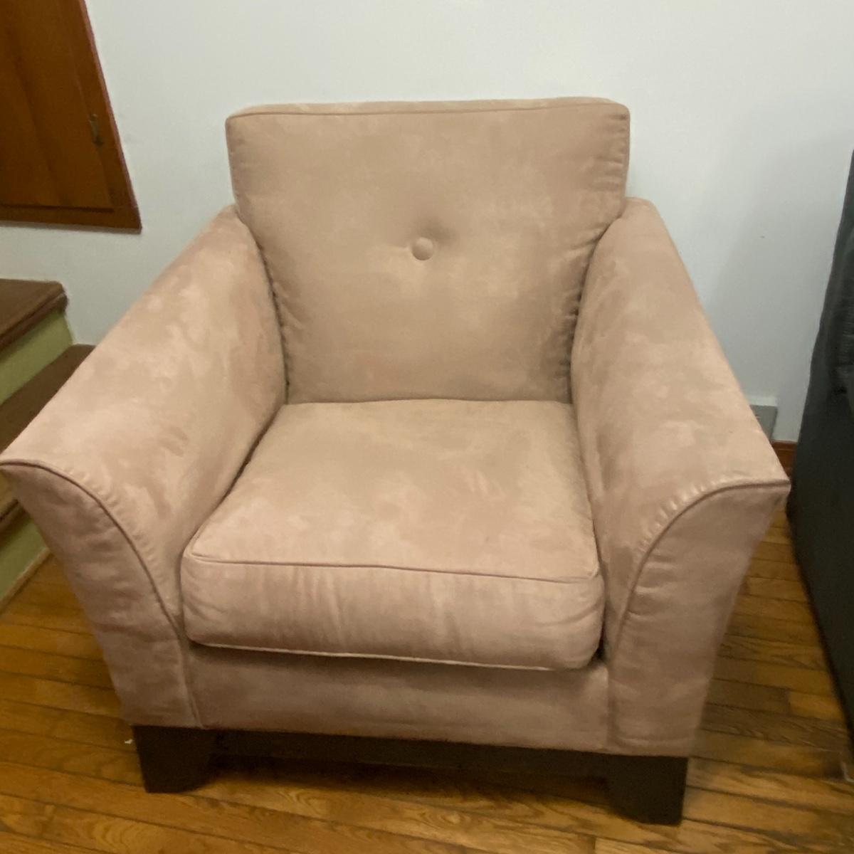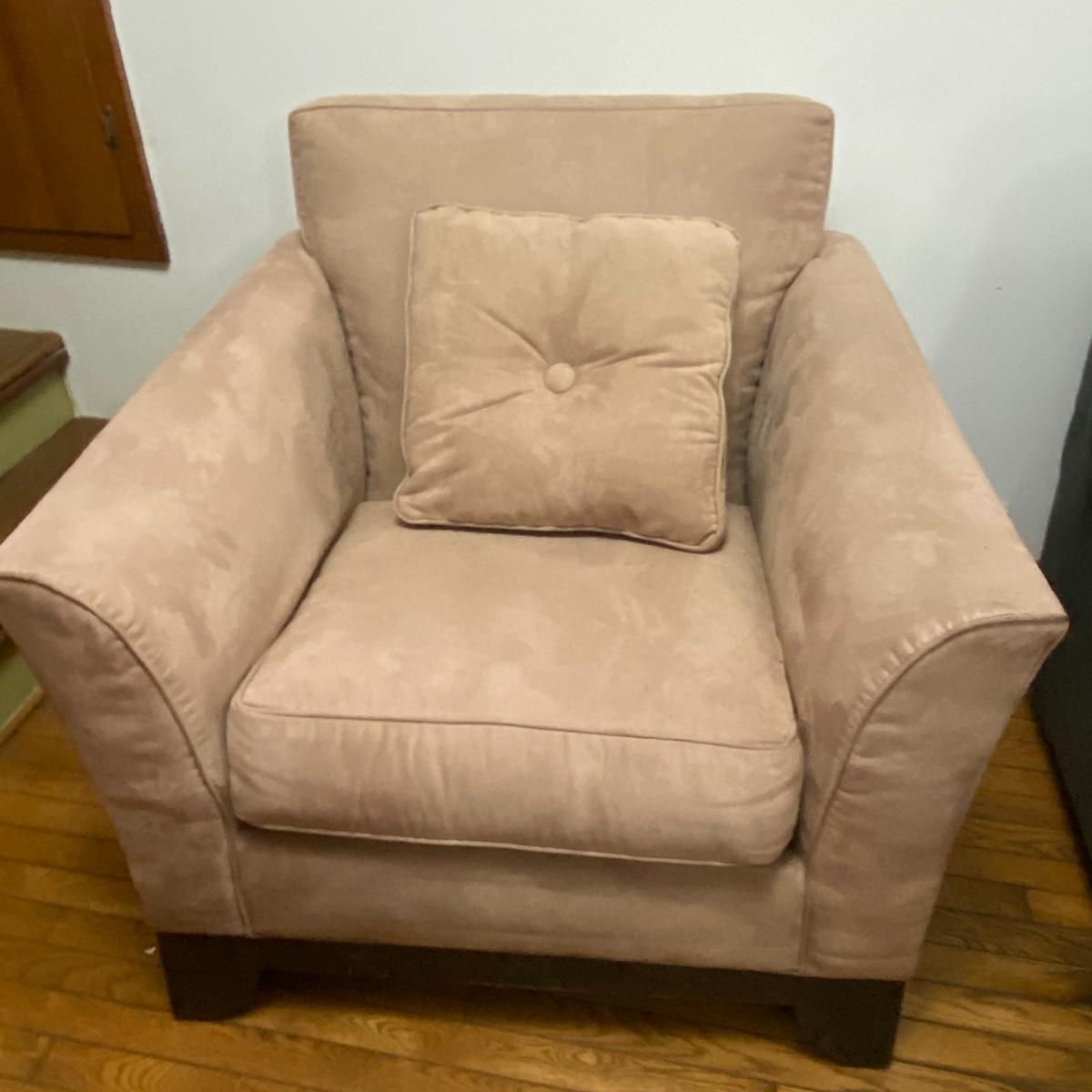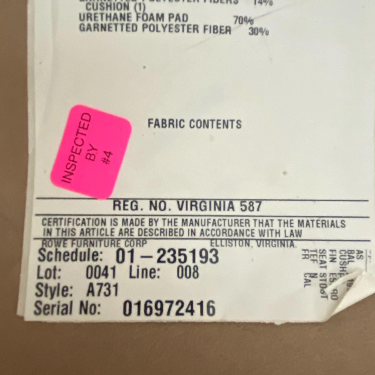 Lot includes tan Rowe chair paired with a side table. Rowe chair includes a pillow and has measurements of 37"x21"x20". Back of the chair stands 34" tall. Wooden side table measures 28"x21"x20". The table has one bottom drawer with two brass-like handles and one open shelf/magazine slot. See photos. Local pickup only.