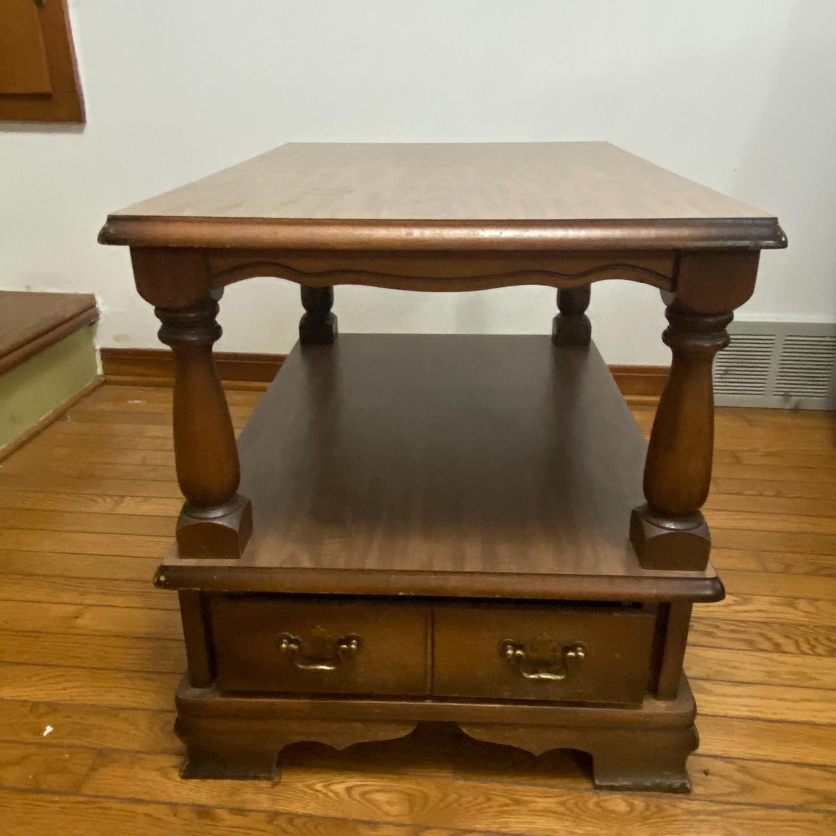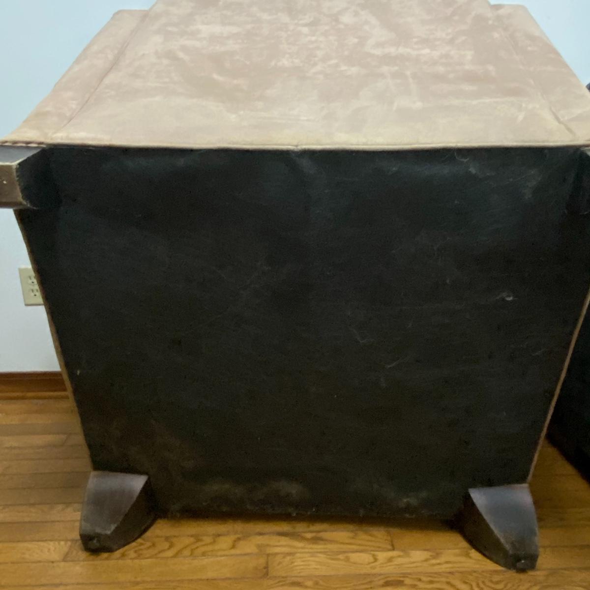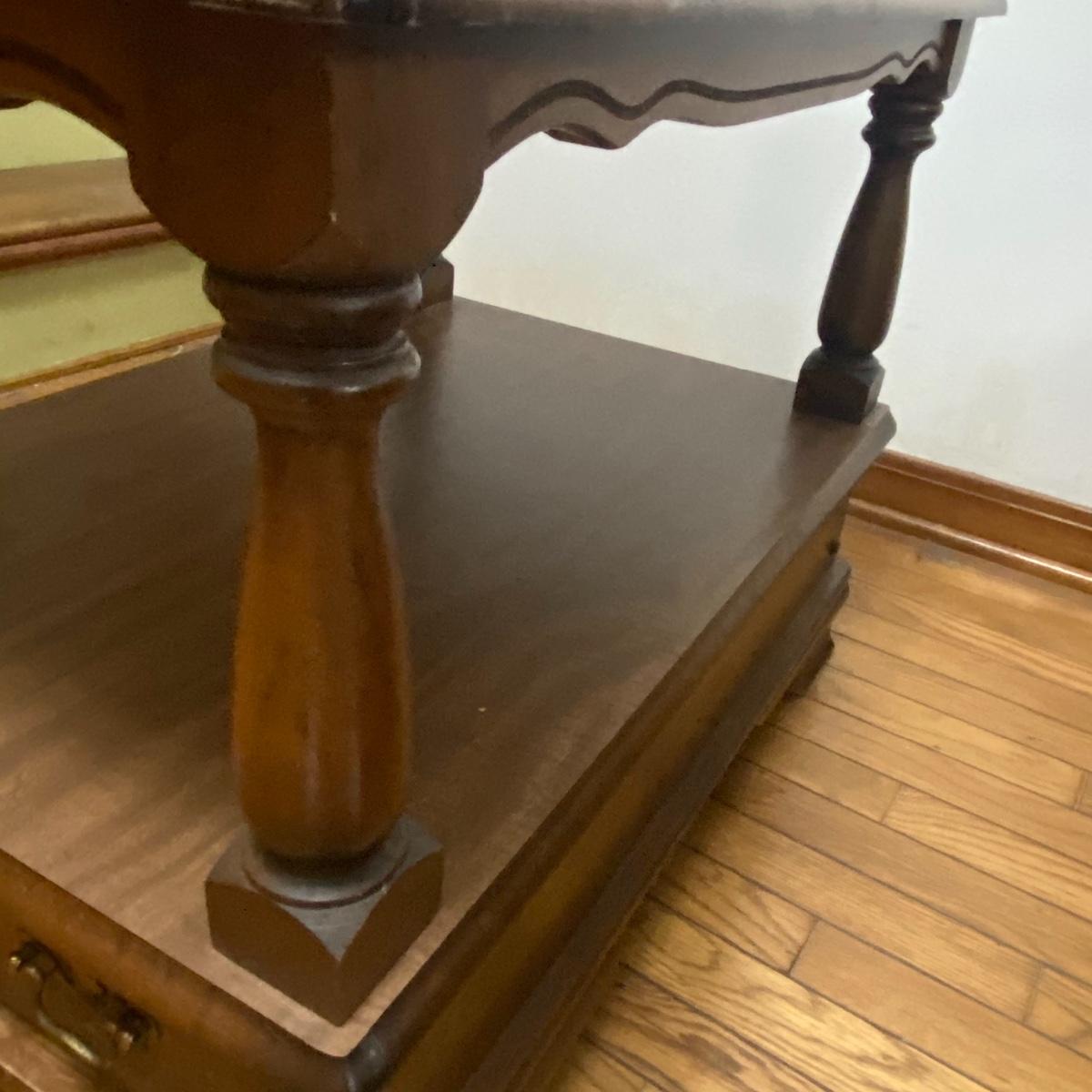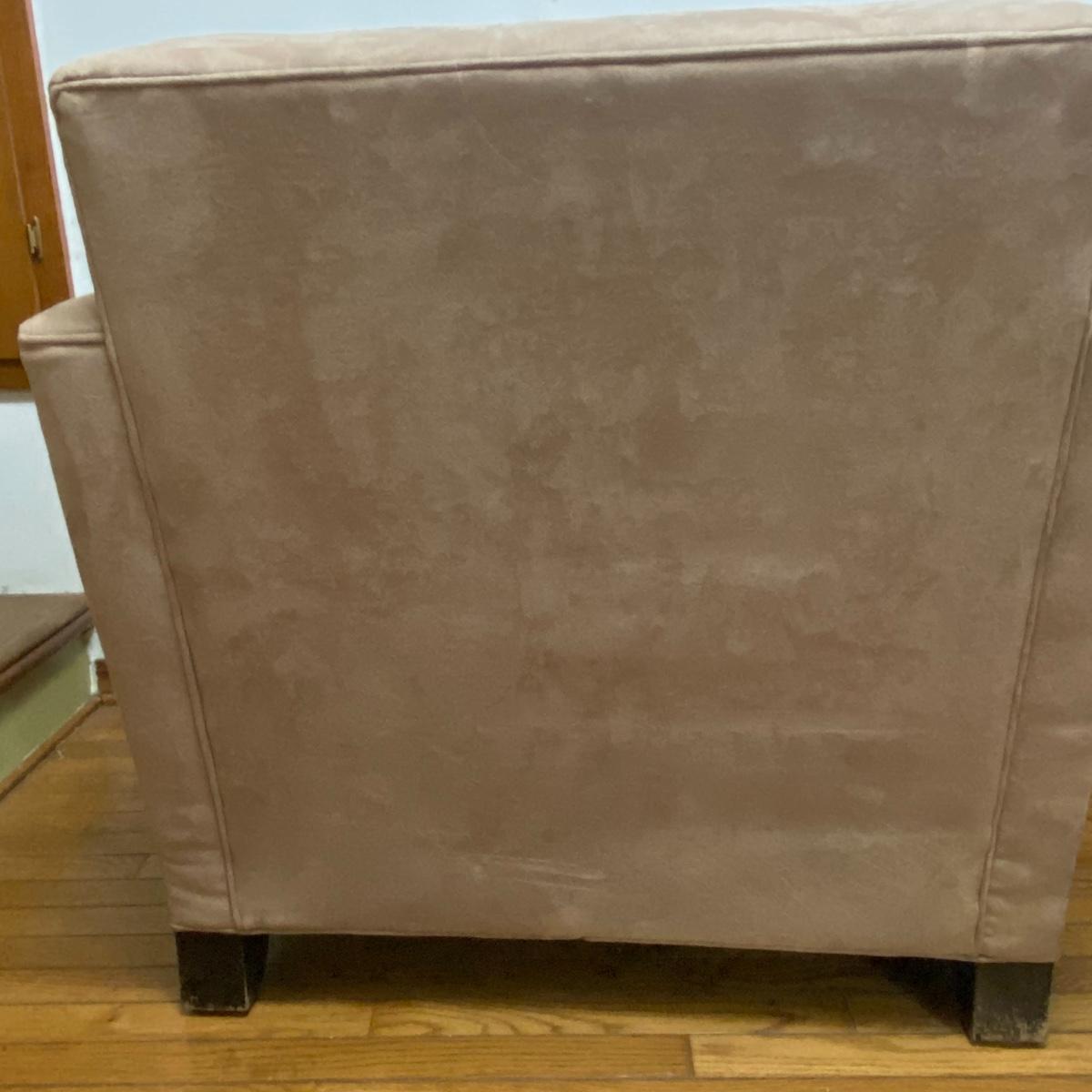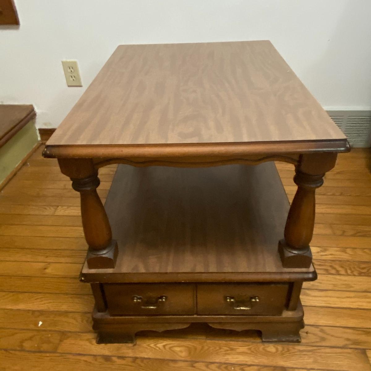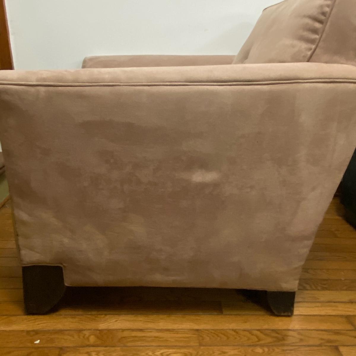 Lot includes tan Rowe chair paired with a side table. Rowe chair includes a pillow and has measurements of 37"x21"x20". Back of the chair stands 34" tall. Wooden side table measures 28"x21"x20". The table has one bottom drawer with two brass-like handles and one open shelf/magazine slot. See photos. Local pickup only.
