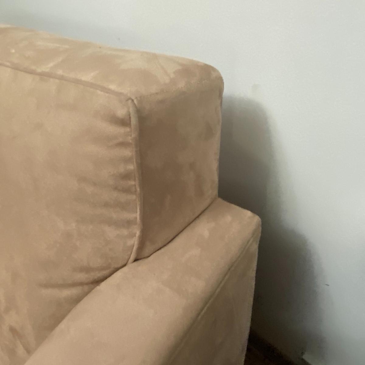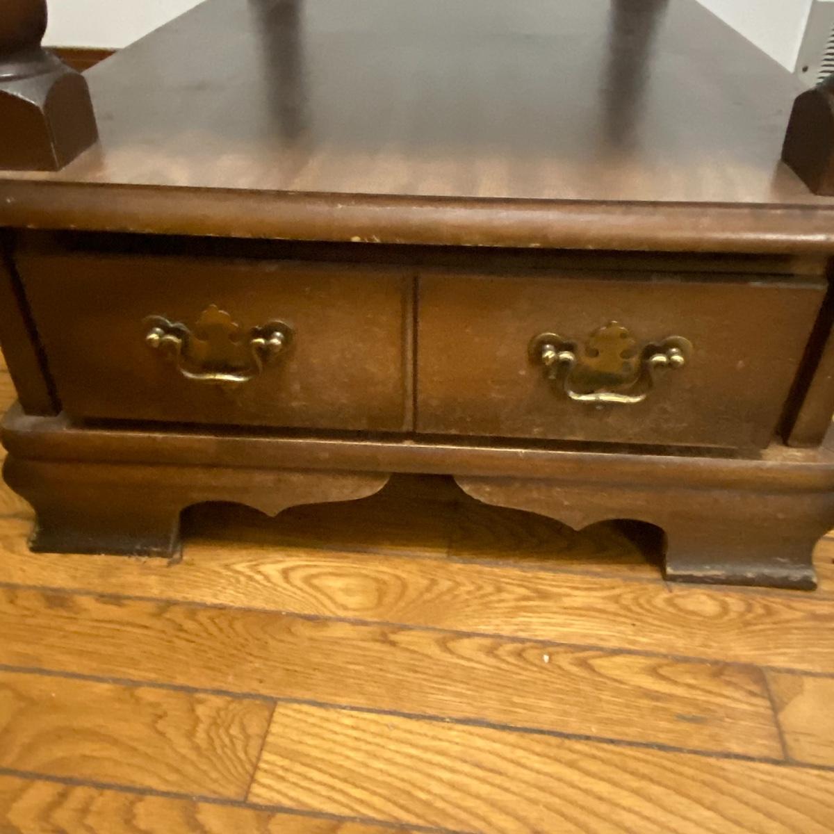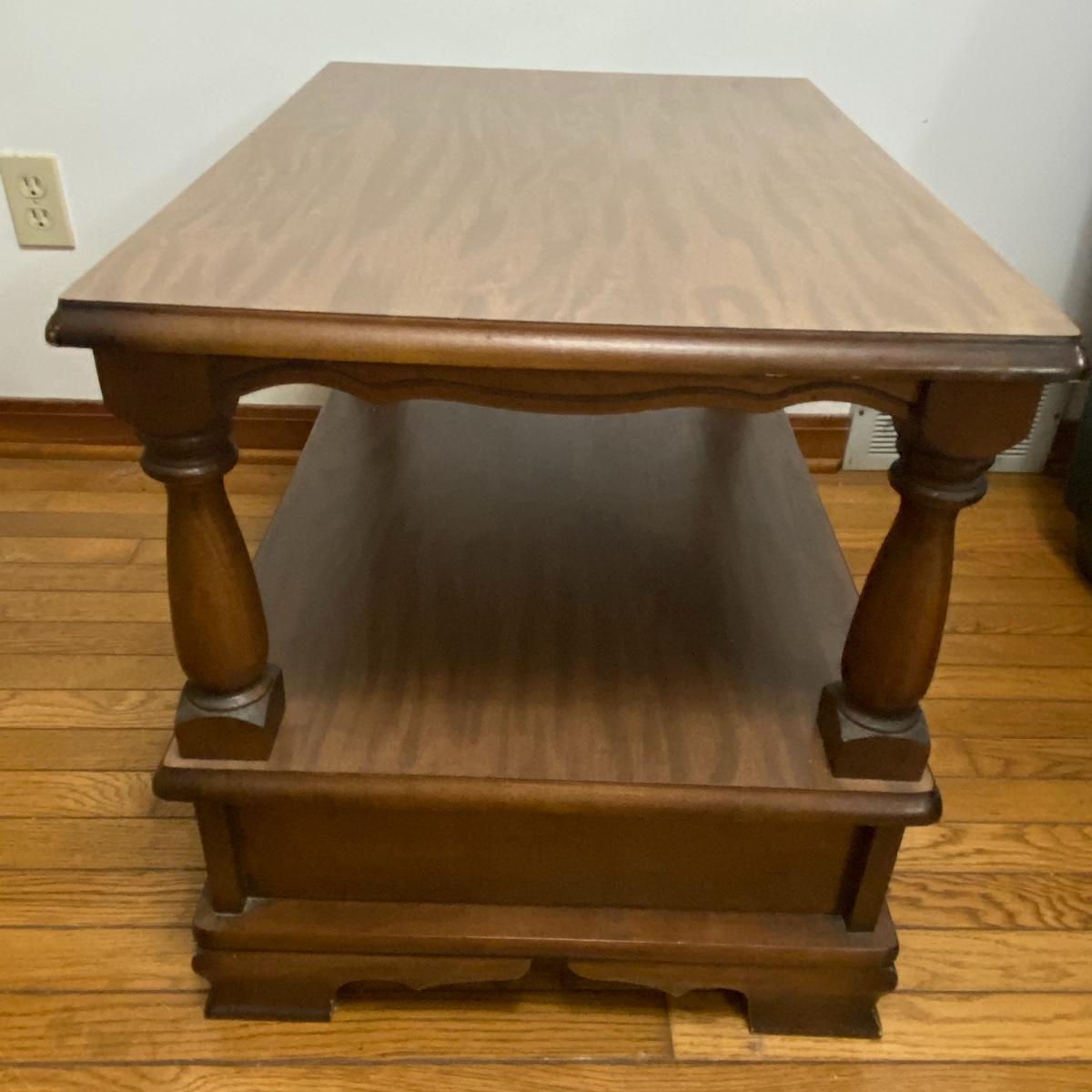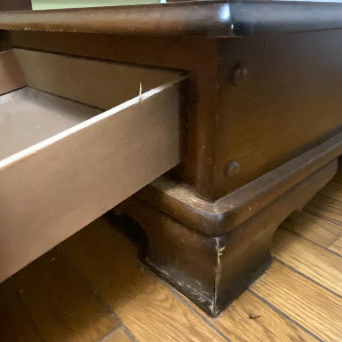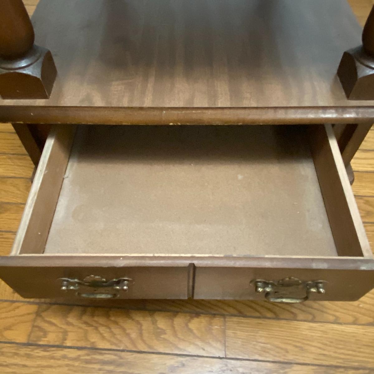 Lot includes tan Rowe chair paired with a side table. Rowe chair includes a pillow and has measurements of 37"x21"x20". Back of the chair stands 34" tall. Wooden side table measures 28"x21"x20". The table has one bottom drawer with two brass-like handles and one open shelf/magazine slot. See photos. Local pickup only.