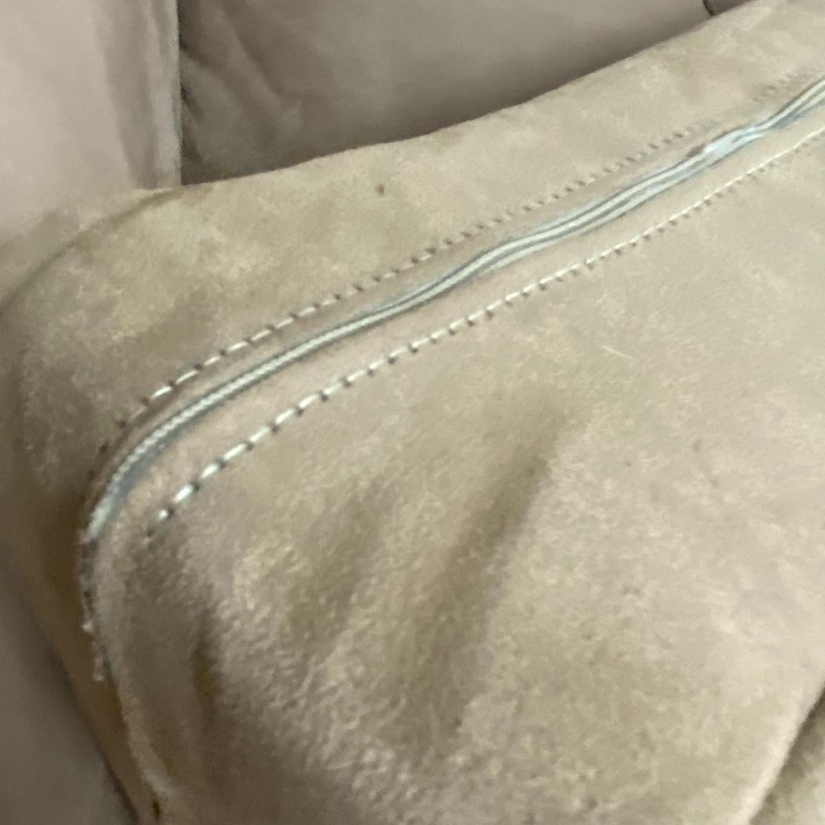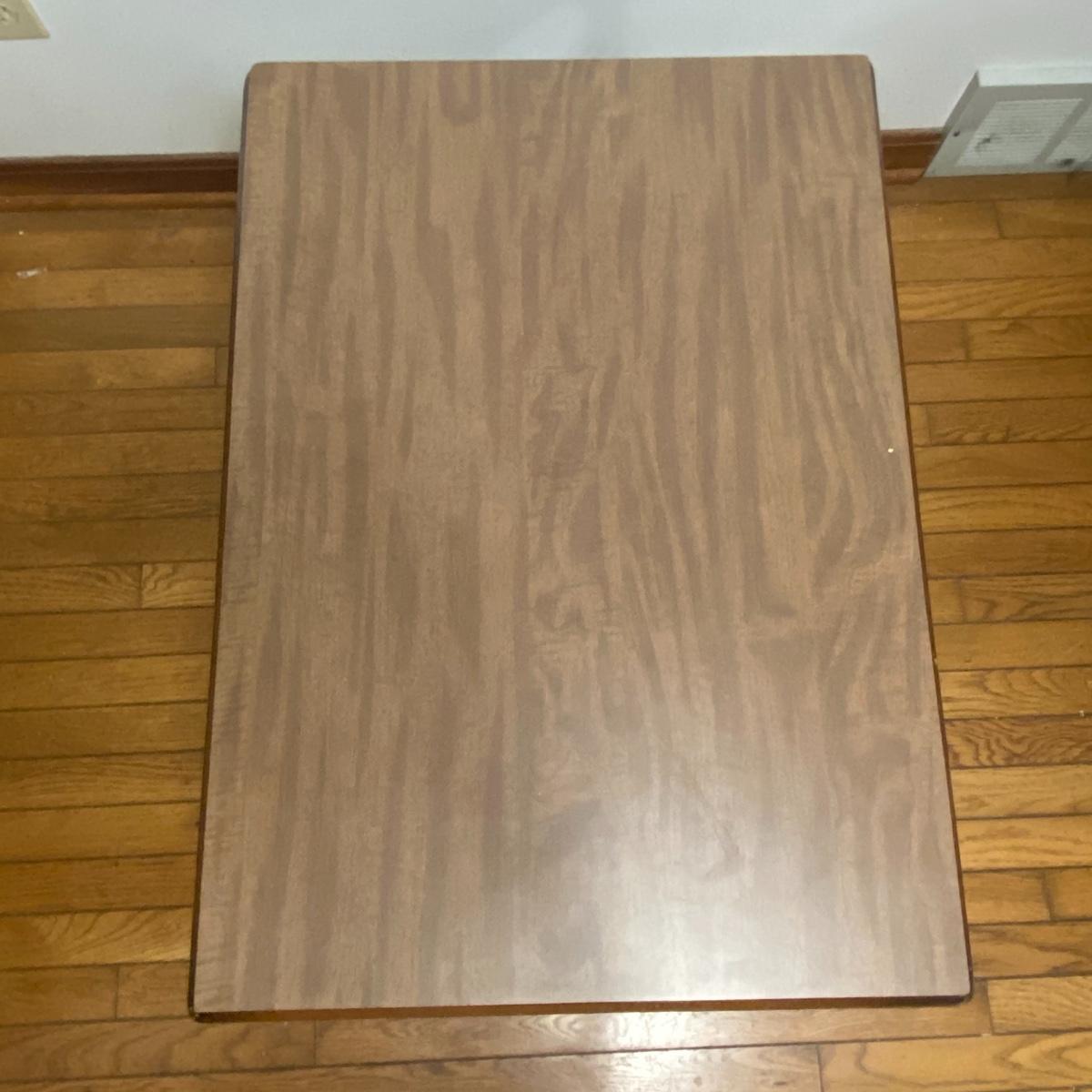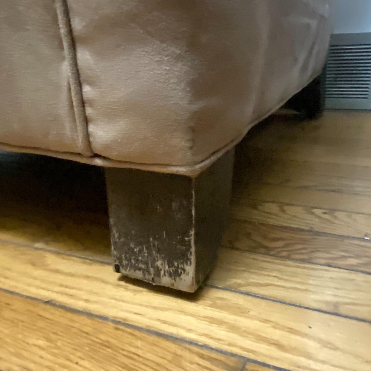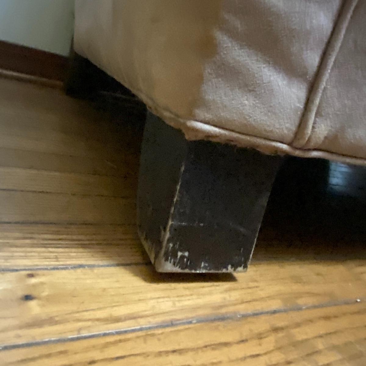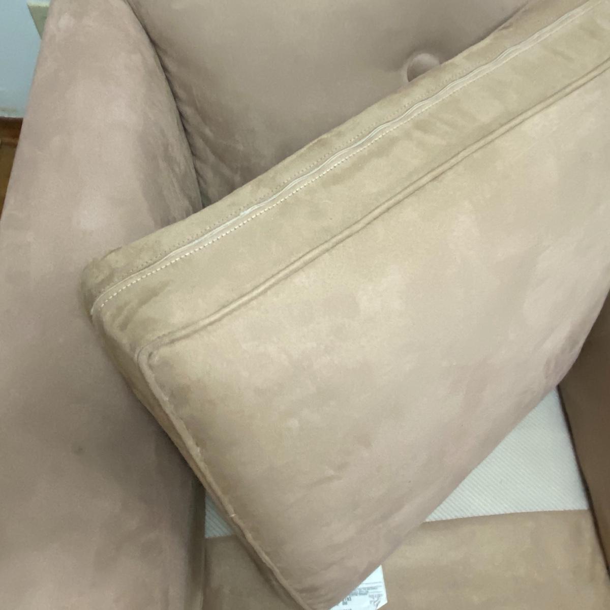 Lot includes tan Rowe chair paired with a side table. Rowe chair includes a pillow and has measurements of 37"x21"x20". Back of the chair stands 34" tall. Wooden side table measures 28"x21"x20". The table has one bottom drawer with two brass-like handles and one open shelf/magazine slot. See photos. Local pickup only.