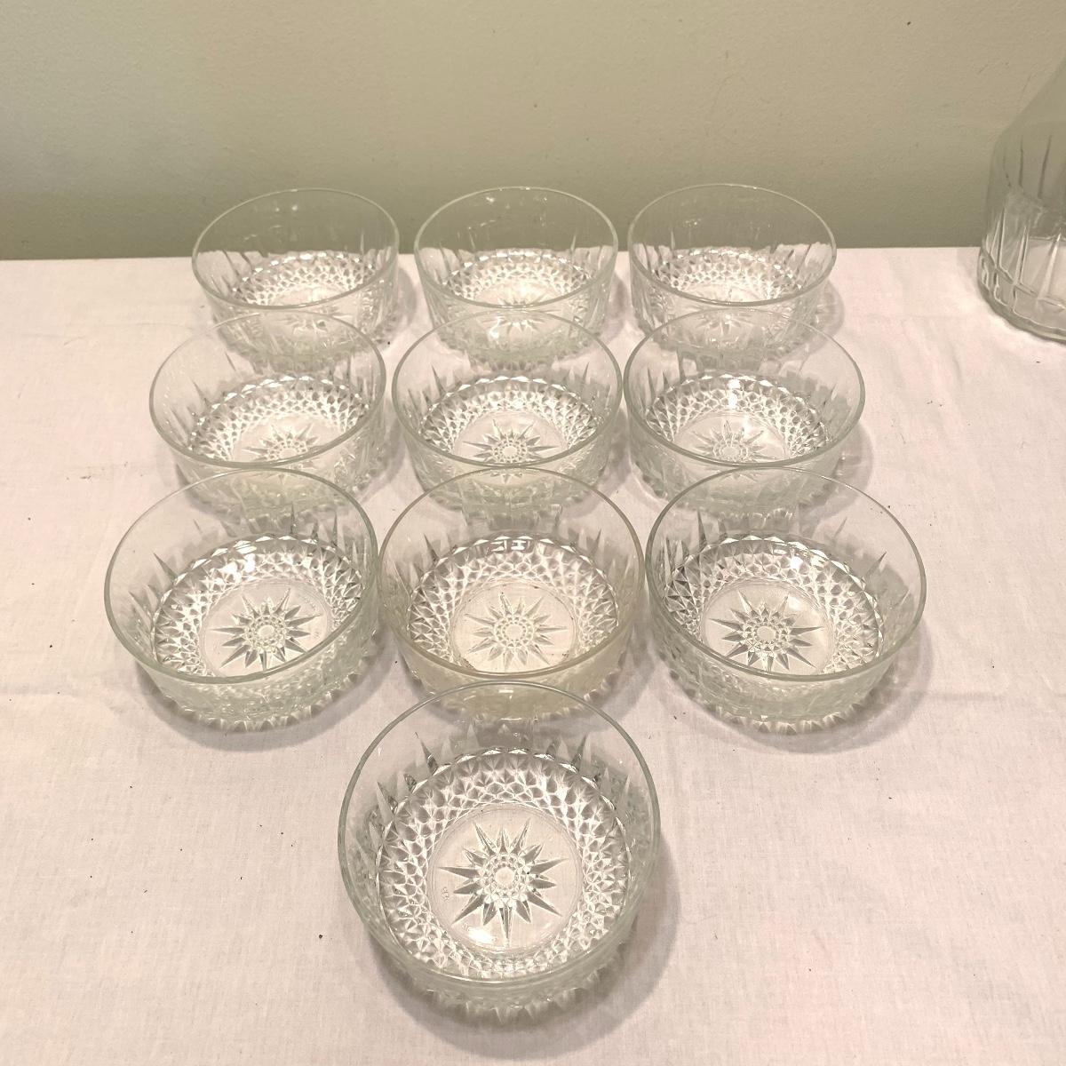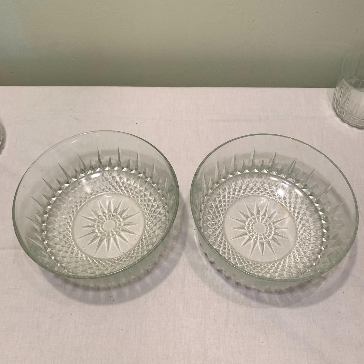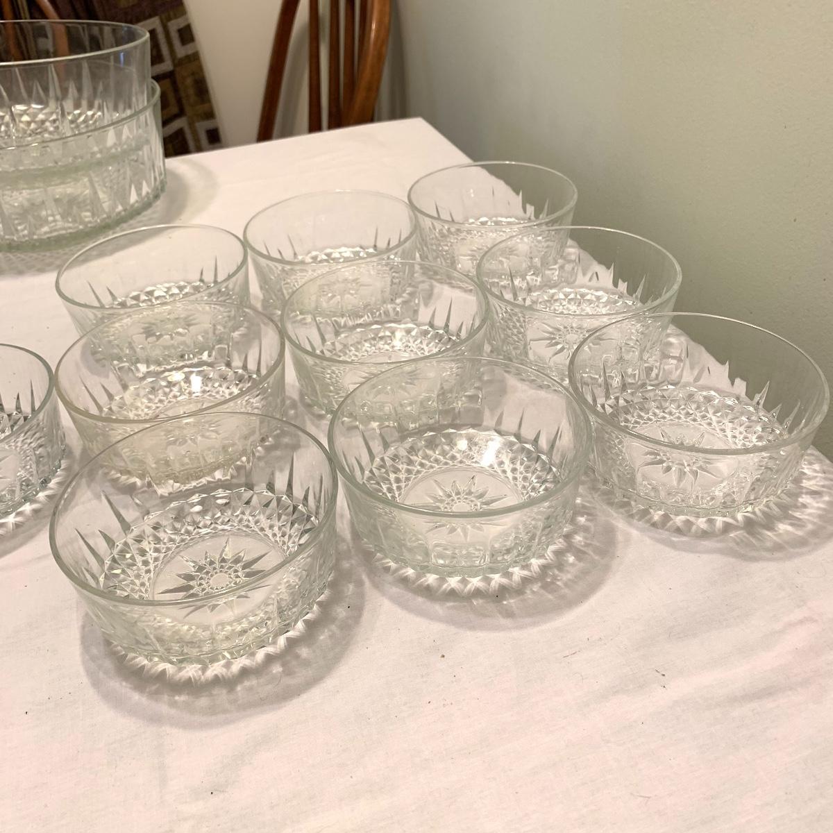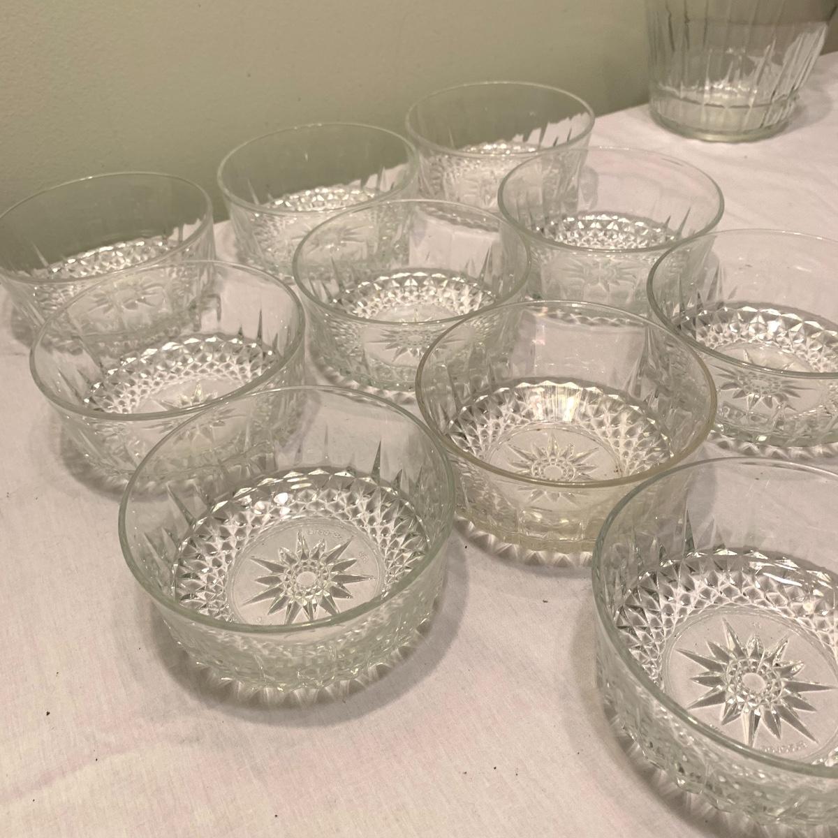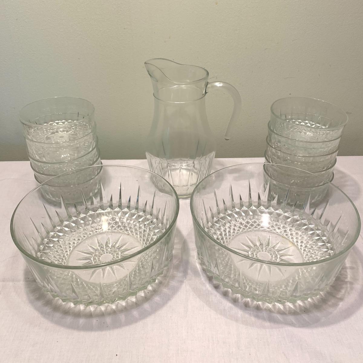 Your guests will love this salad set. Included are ten 5” salad bowls, two 9” serving bowls, as well as a 10” pitcher. The bowls have a star design at the bottom of each bowl (see pics for details). All these pieces are in great condition. Local pick up only.