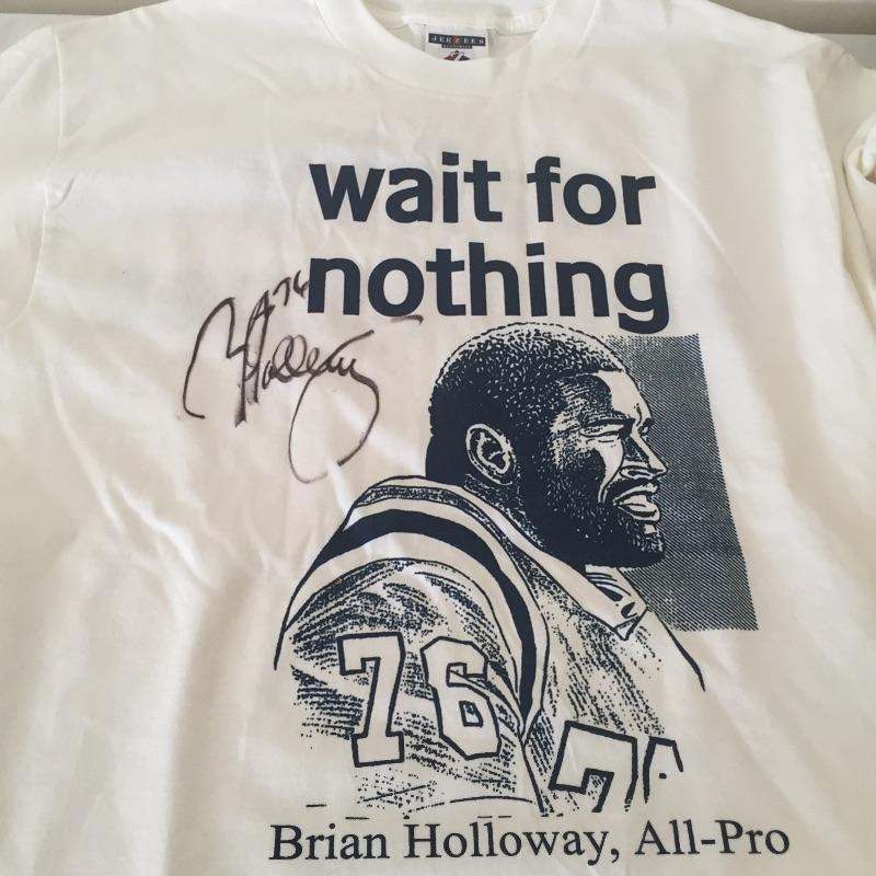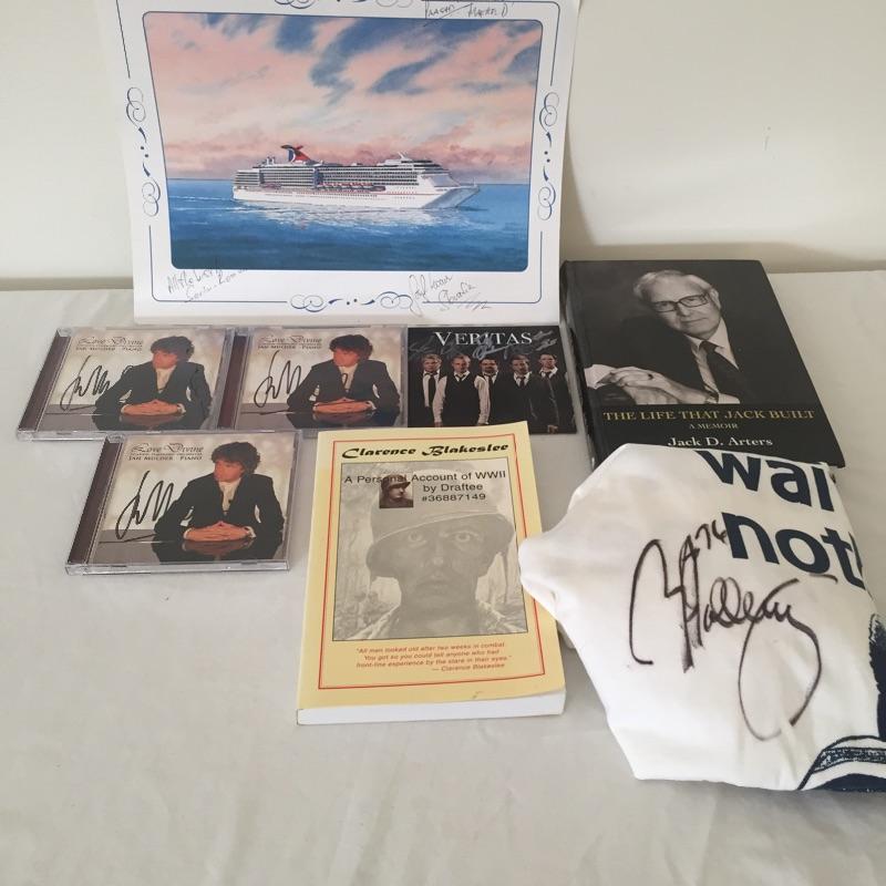 Cool T- shirt signed by Brian Holloway, size Adult Medium (#76 New England Patriots). Lot also includes signed books by Jack Arters , Clarence Blakeslee. Signed CDs by Jan Mulder and Veritas.