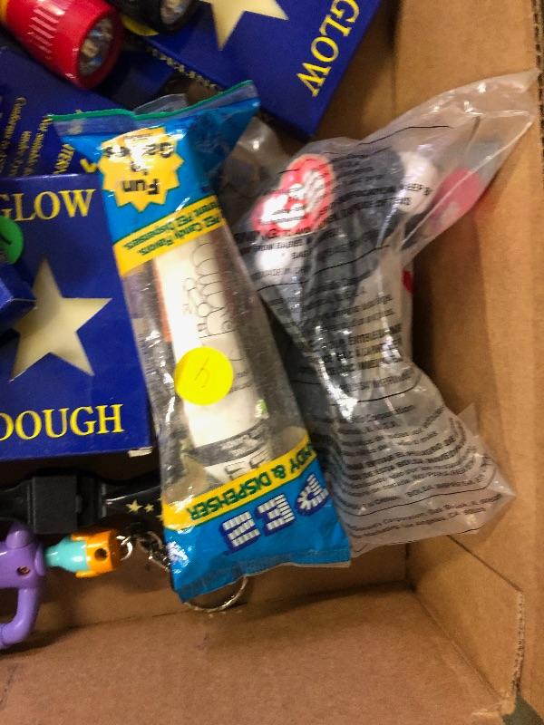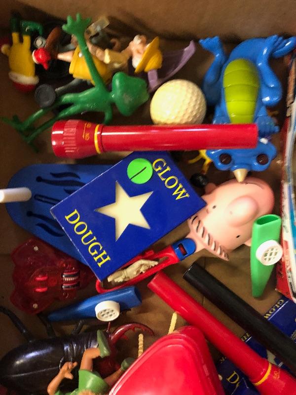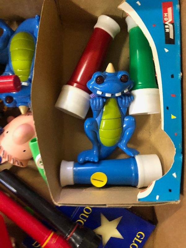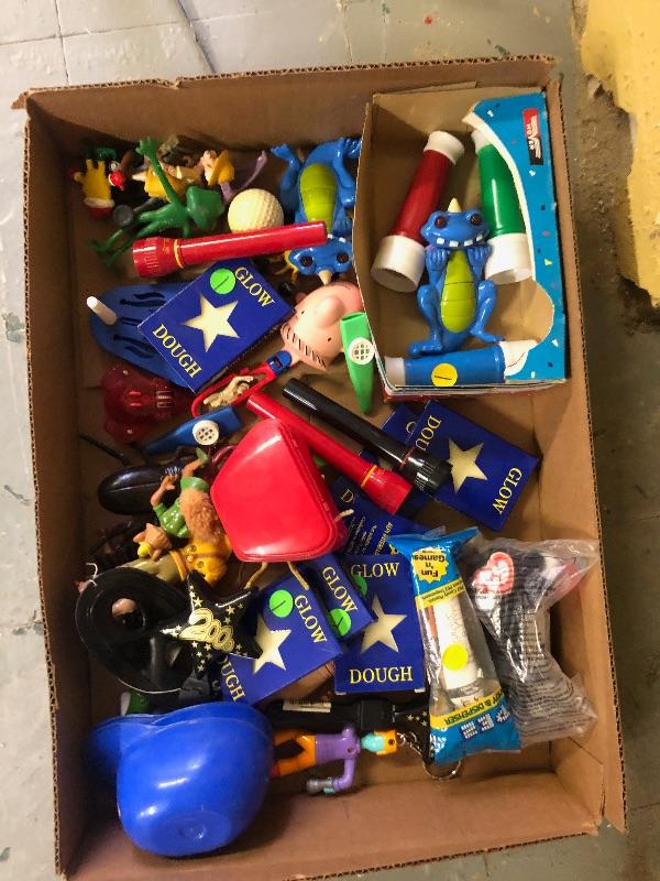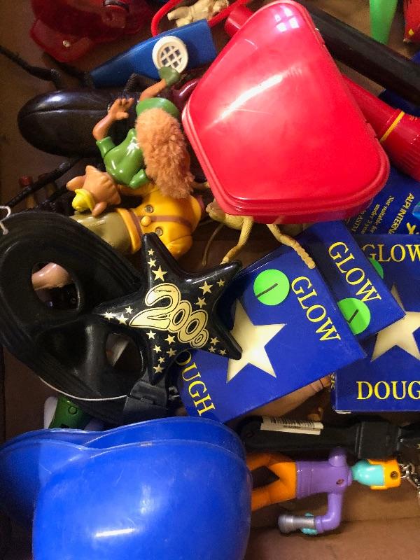 A lot of small toys including pairs happy birthday punch boards, glow dough, 2000 and New Year's celebration toys plastic kaleidoscopes etc.: Vintage used condition