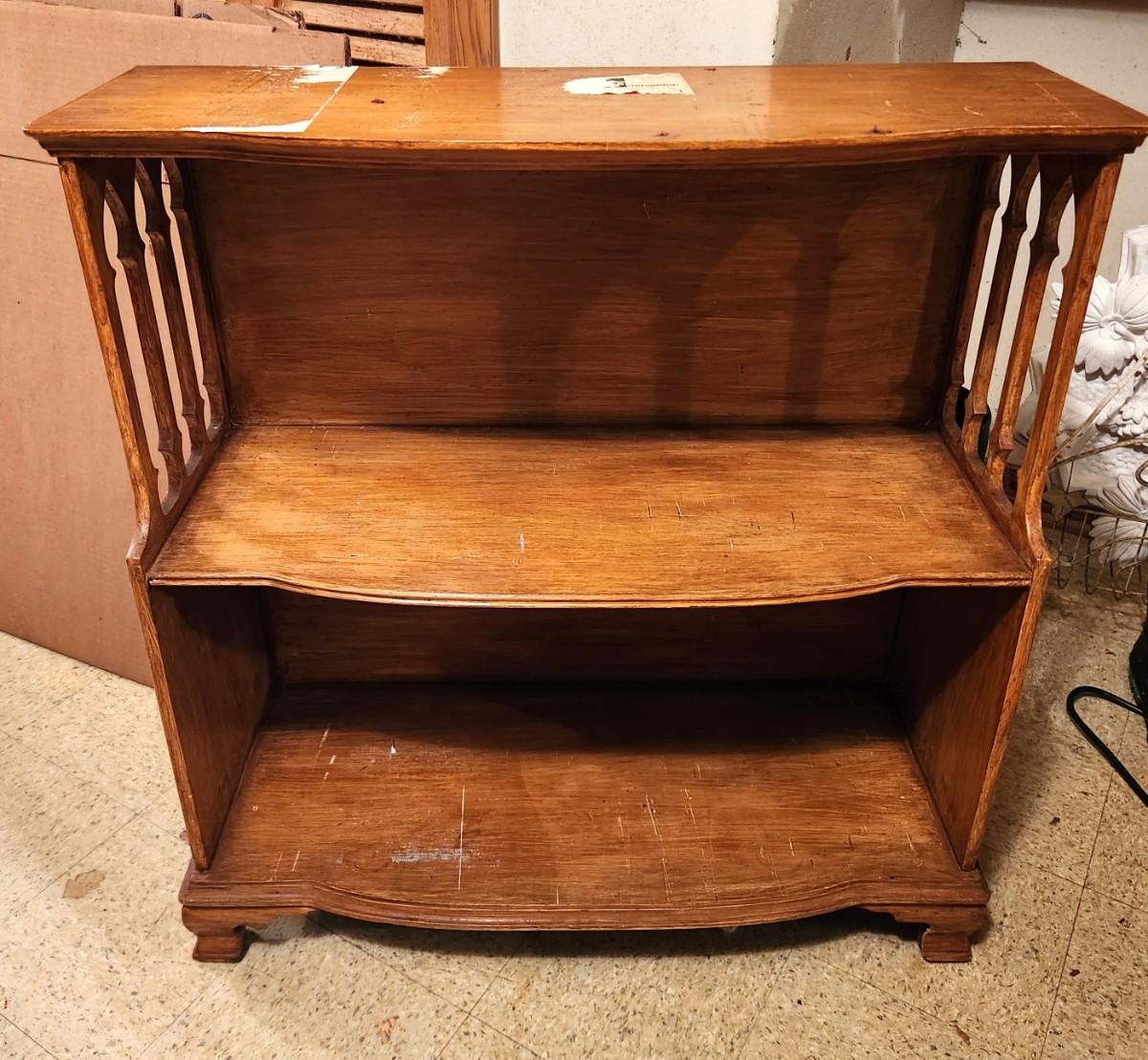 Smallish vintage Gothic styled bookcase or display cabinet -solid - needs a little cleanup/tlc. Couple be painted. 30" across, 9.5" deep, 31" tall.