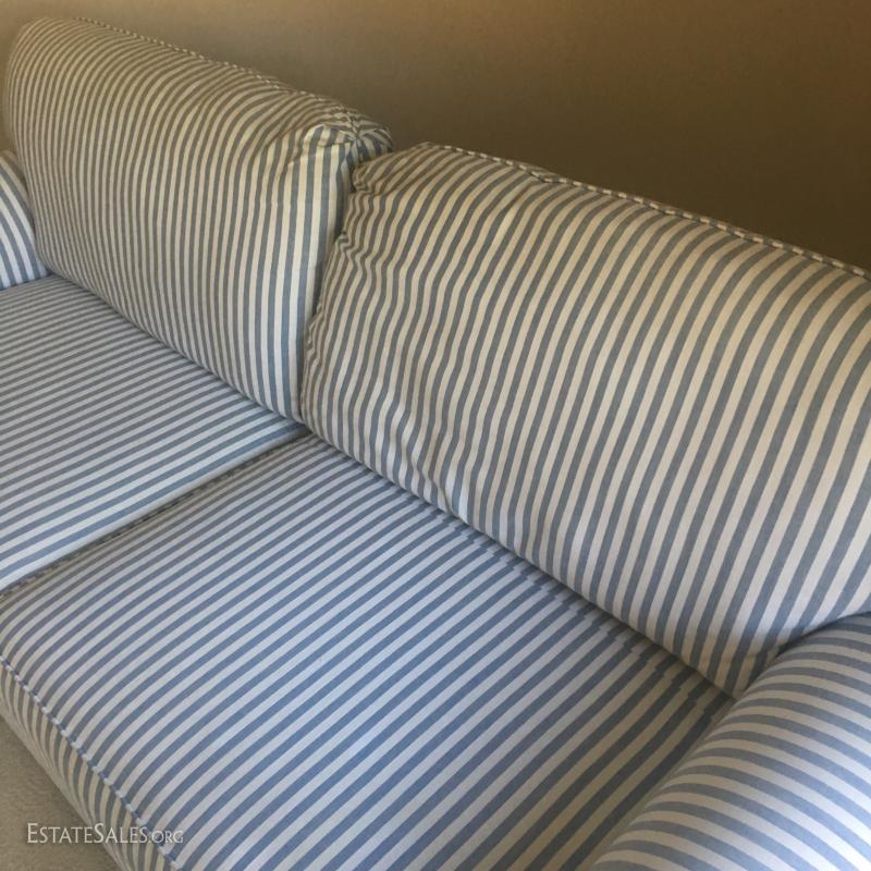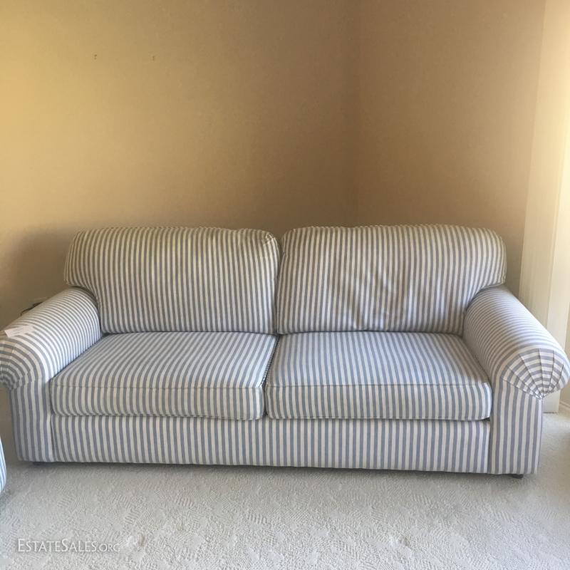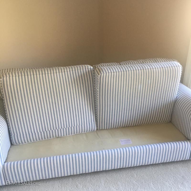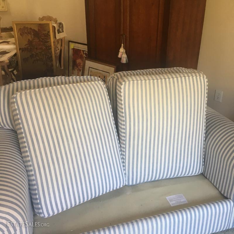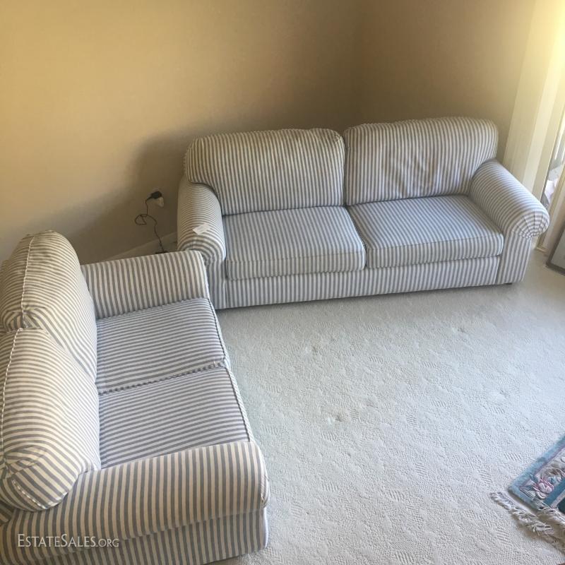 Matching sofa and love seat, fabric blue & white stripped. No visible rips or stains