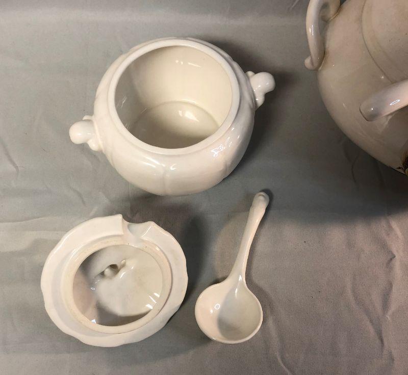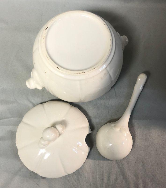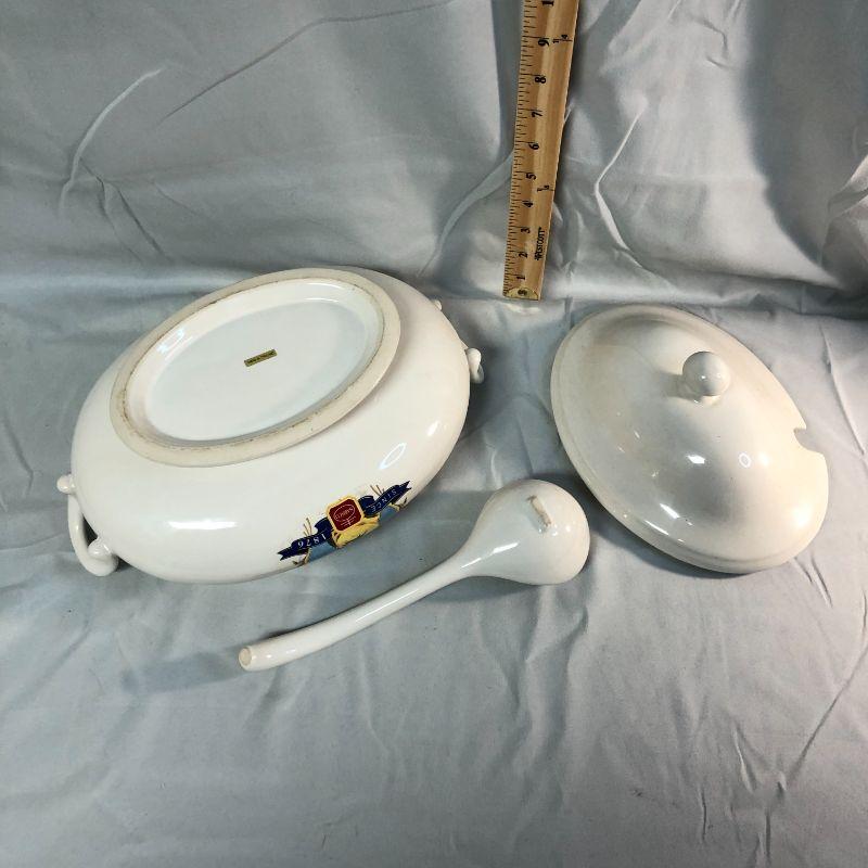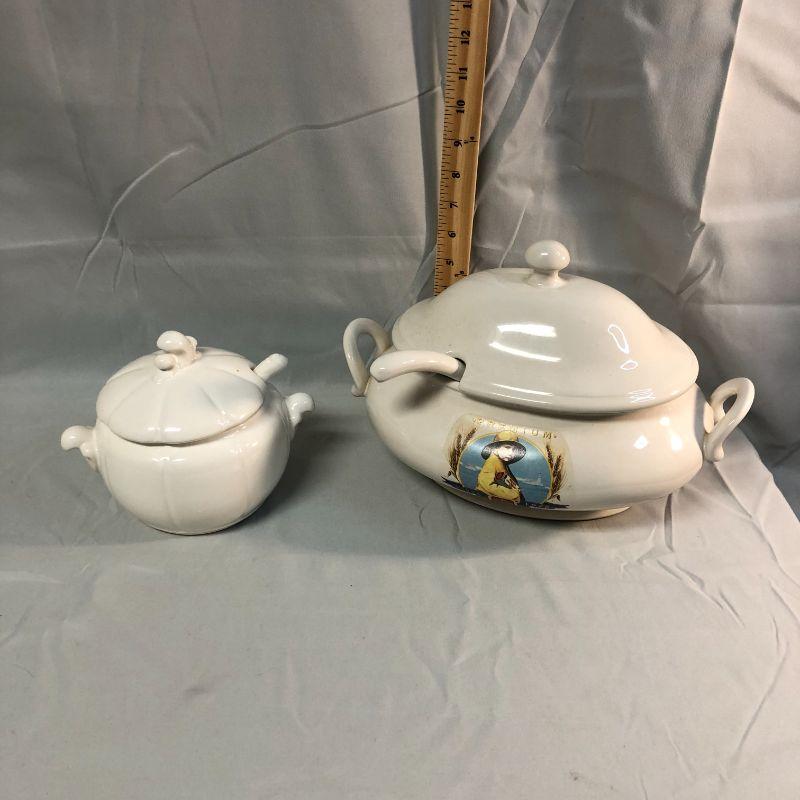 Both tureens and spoons are in excellent condition. The larger one is commemorative for the 100th anniversary of Nabisco Premium Crackers and I believe is from the 1970s. No chips, cracks, or repairs found on any of the pieces.