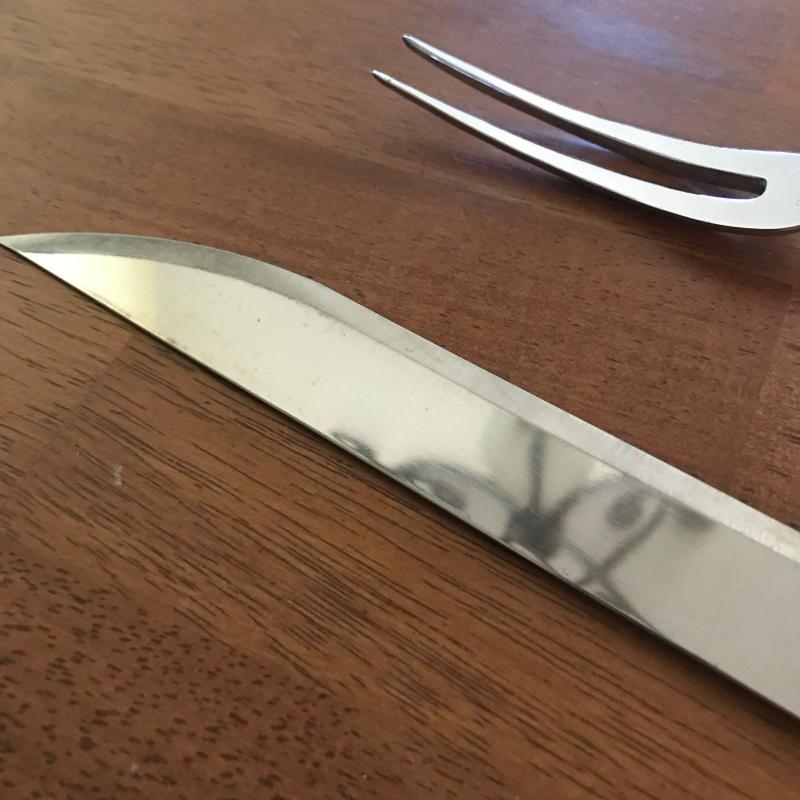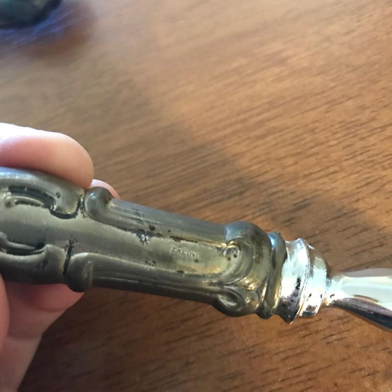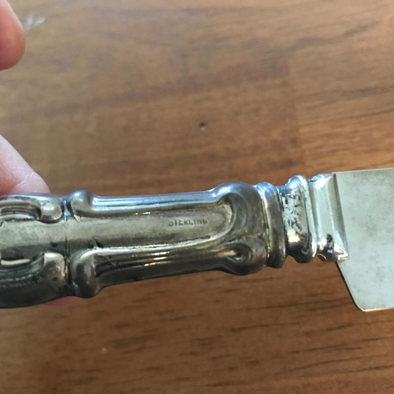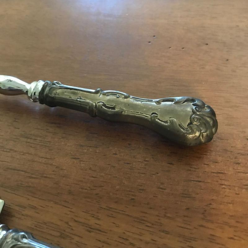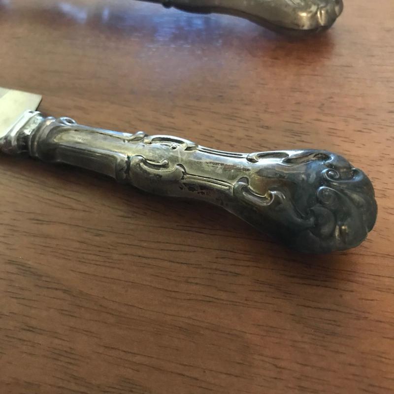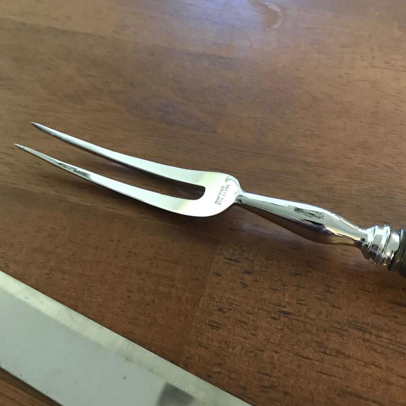 Sheffield Carving Set with sterling silver handle. Needs to be cleaned but in good condition. Starting price is at or near melt value. Shipping available